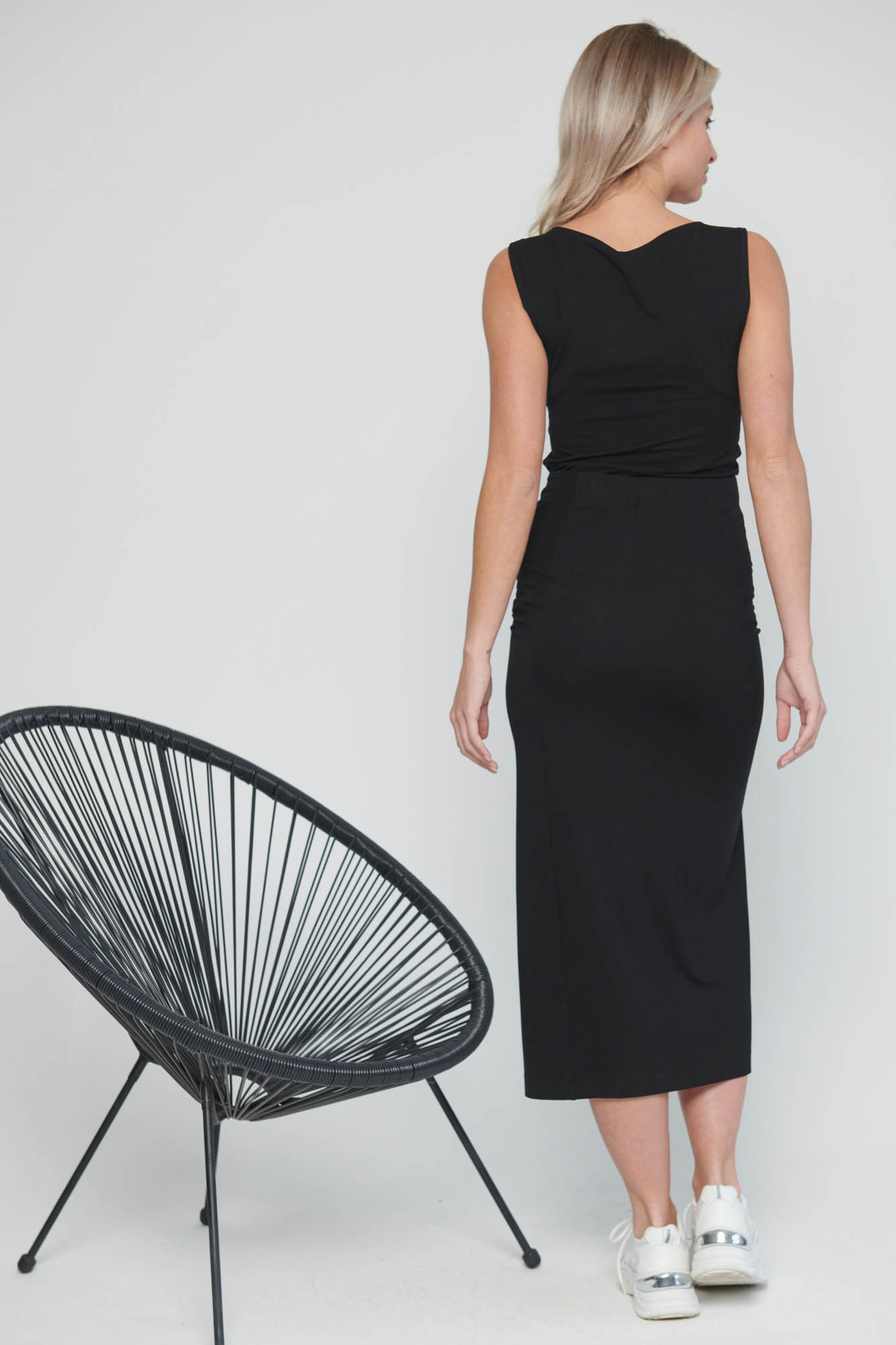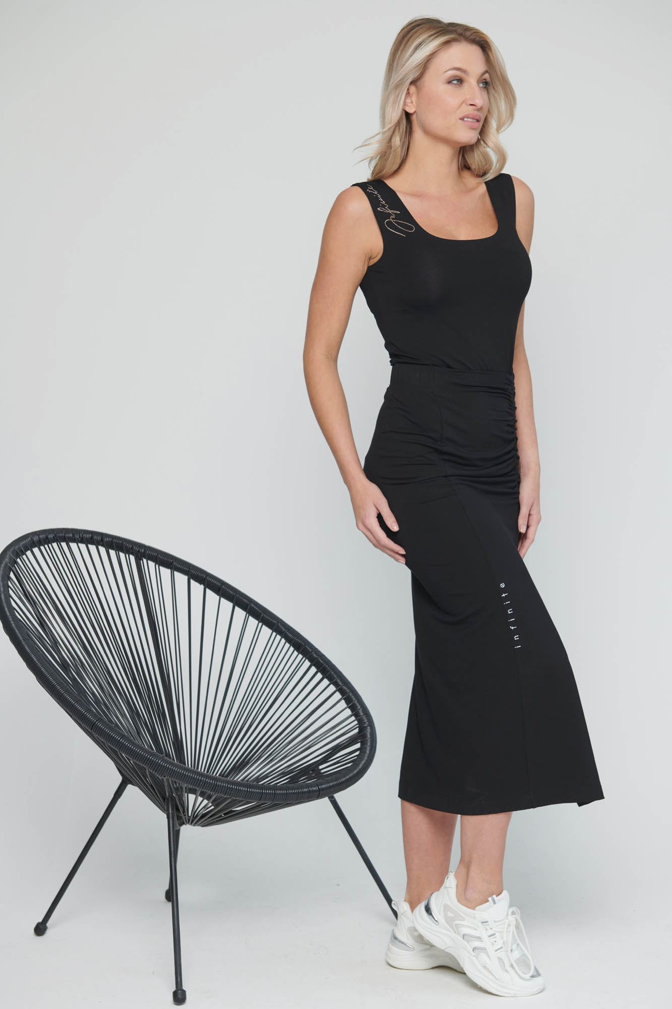 Strečová úpletová sukně s řasením na bocích. V pase guma INF.