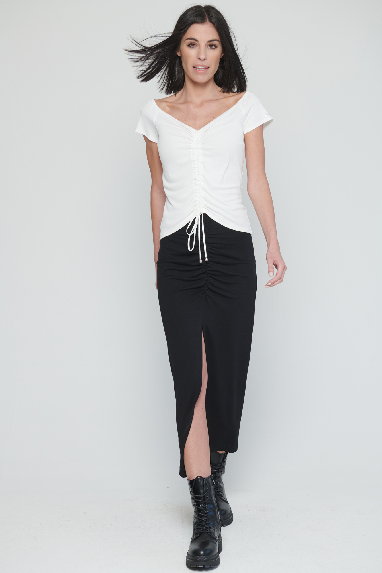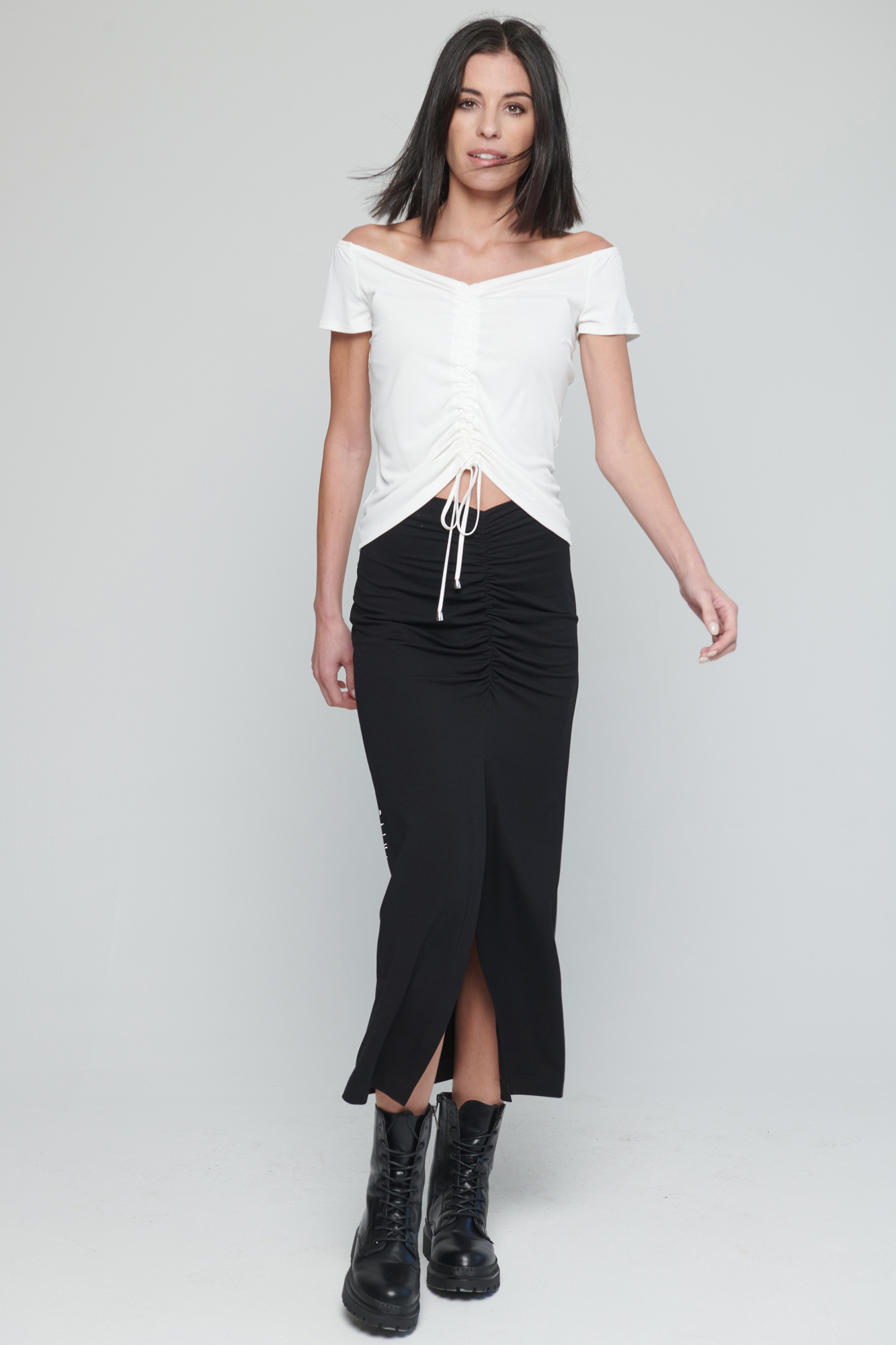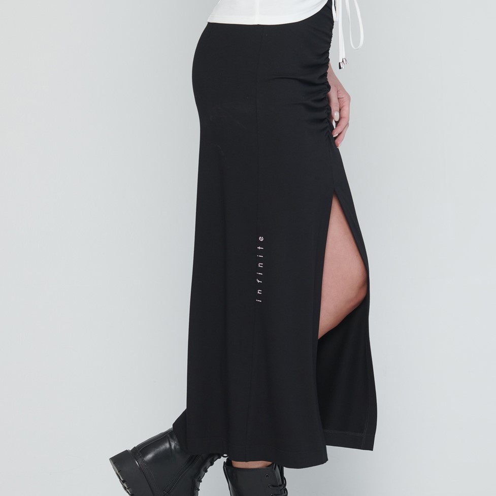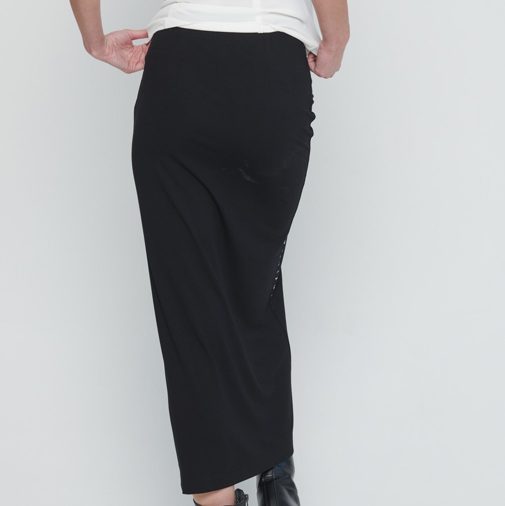 Dlouhá úpletová sukně s řasením na předním díle.