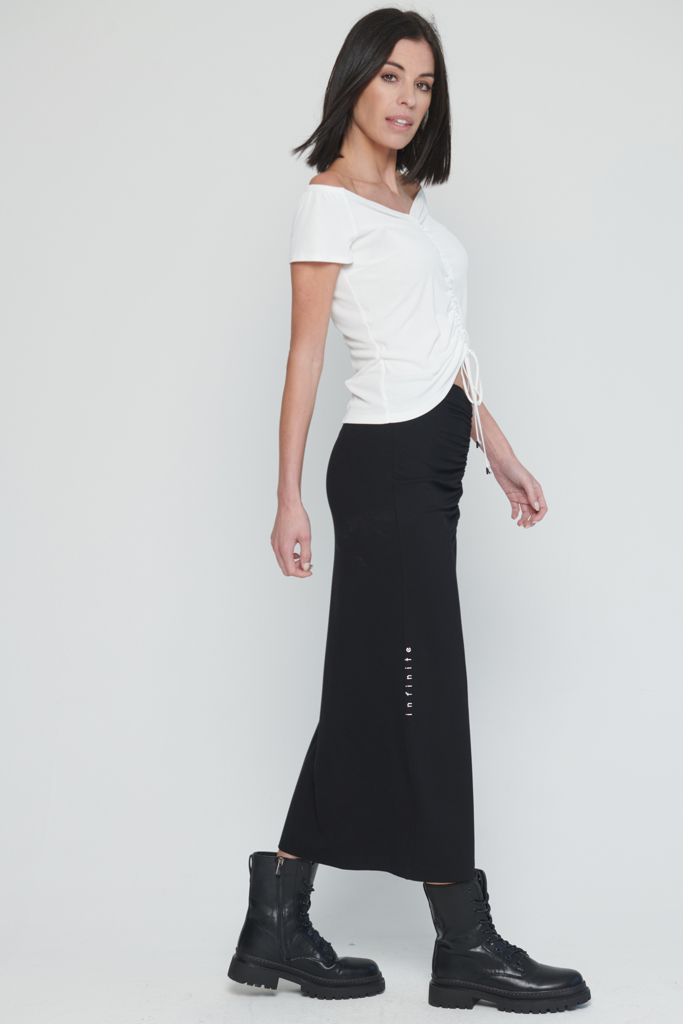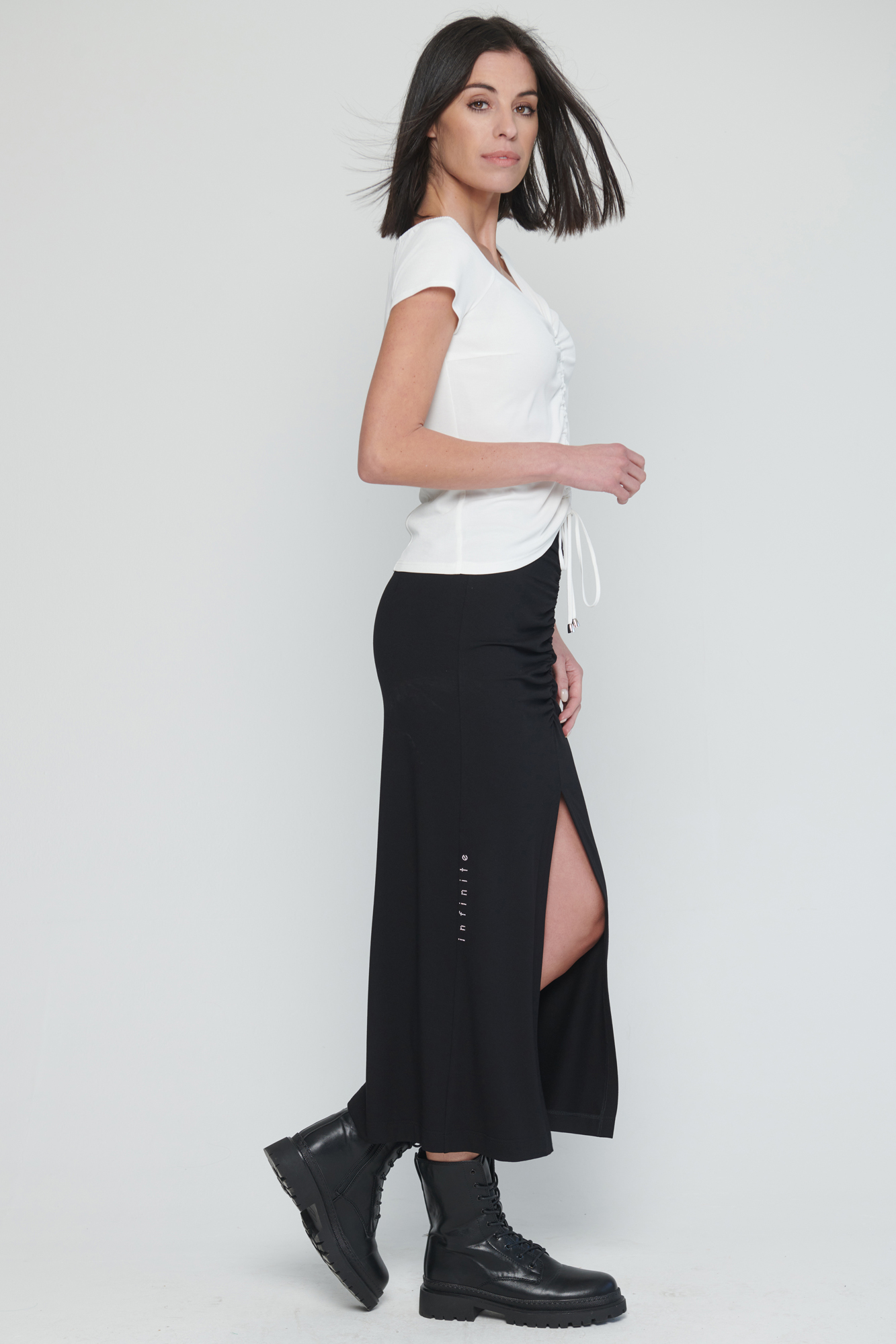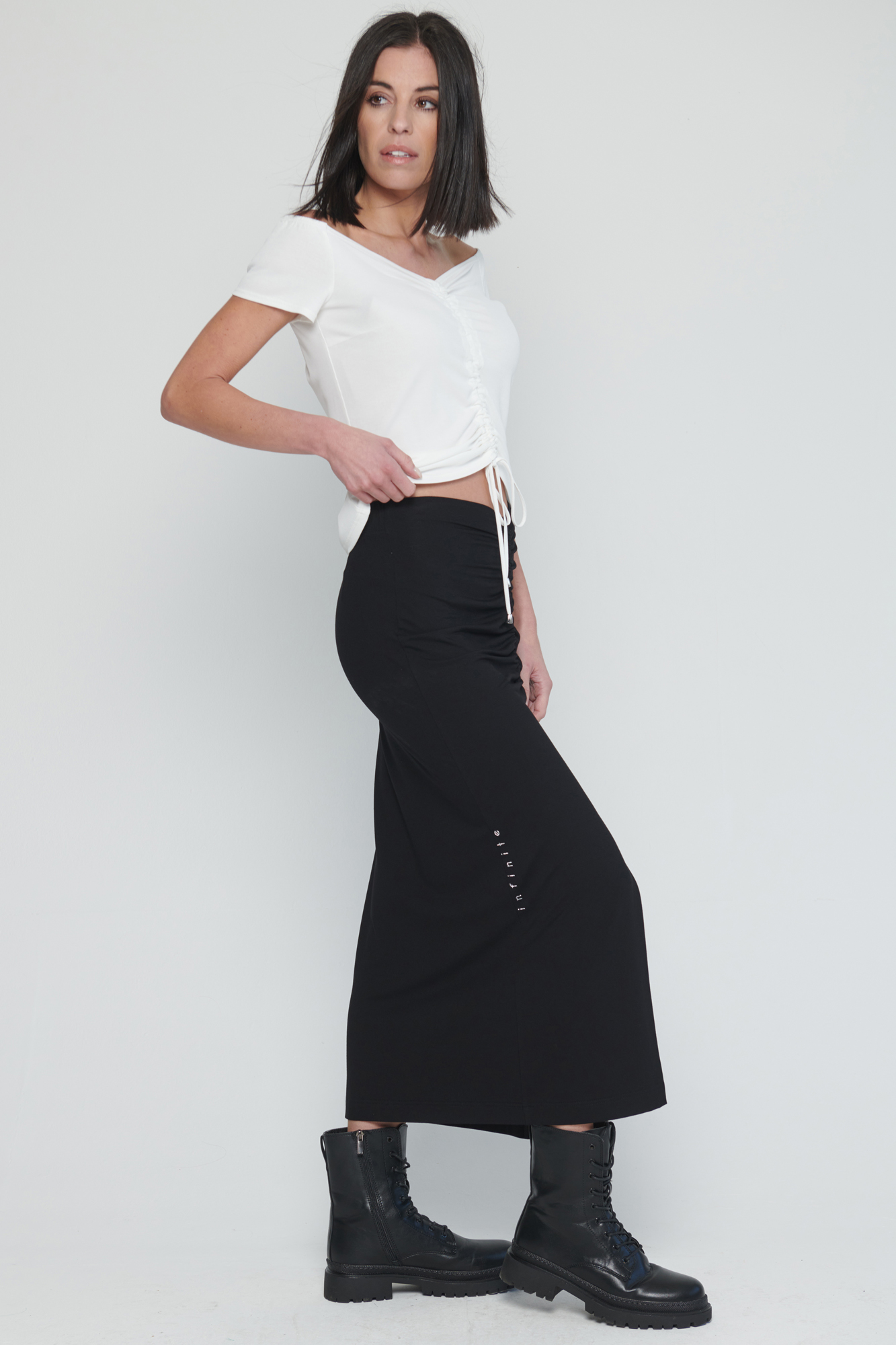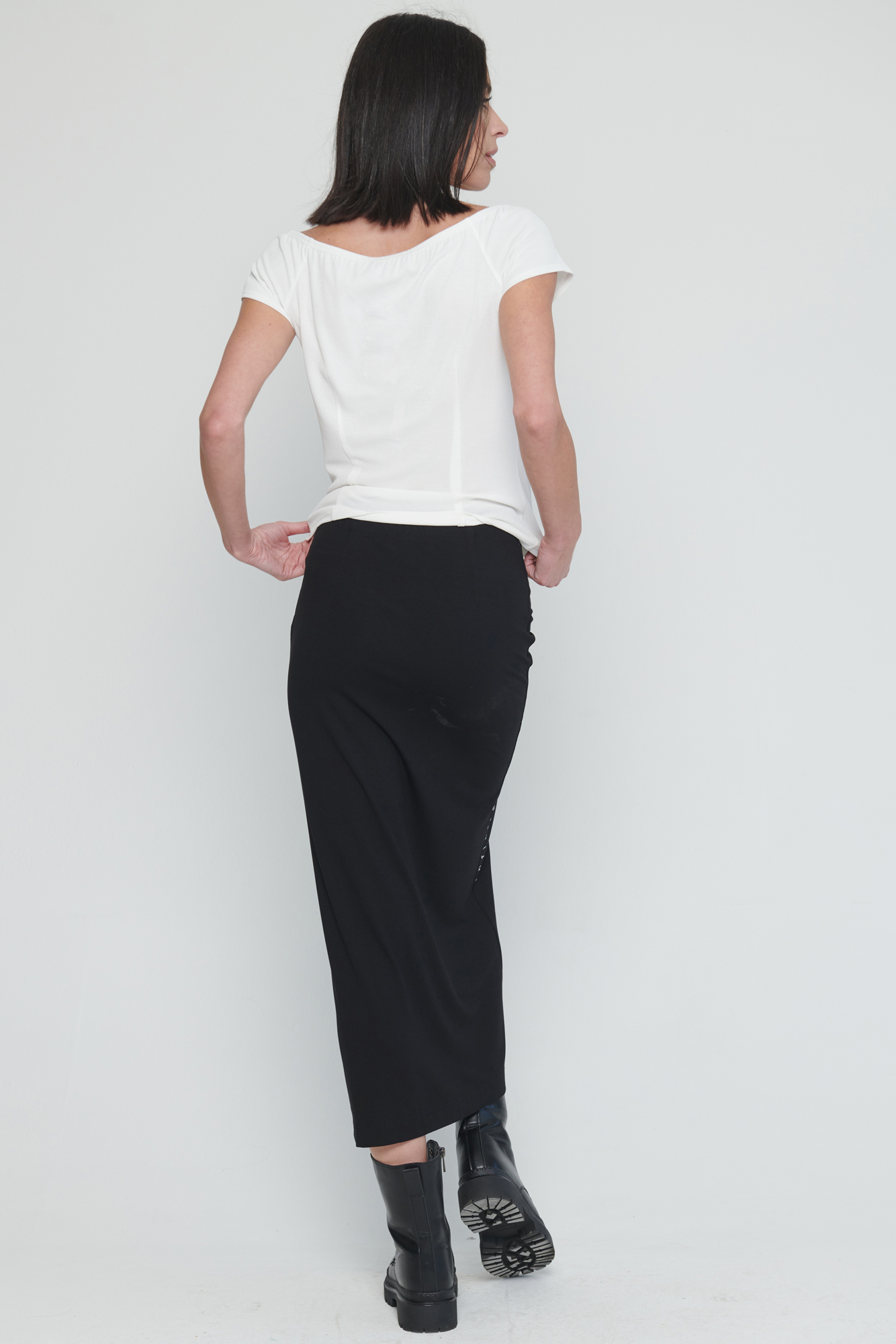 Dlouhá úpletová sukně s řasením na předním díle.