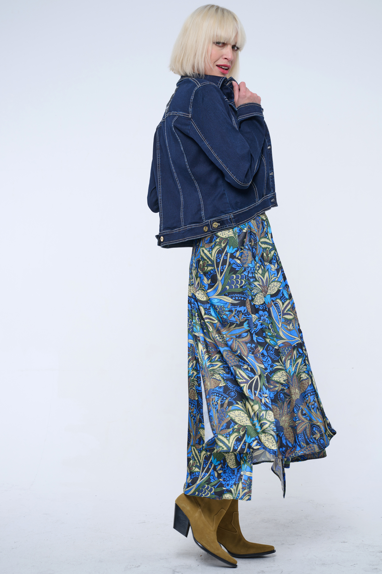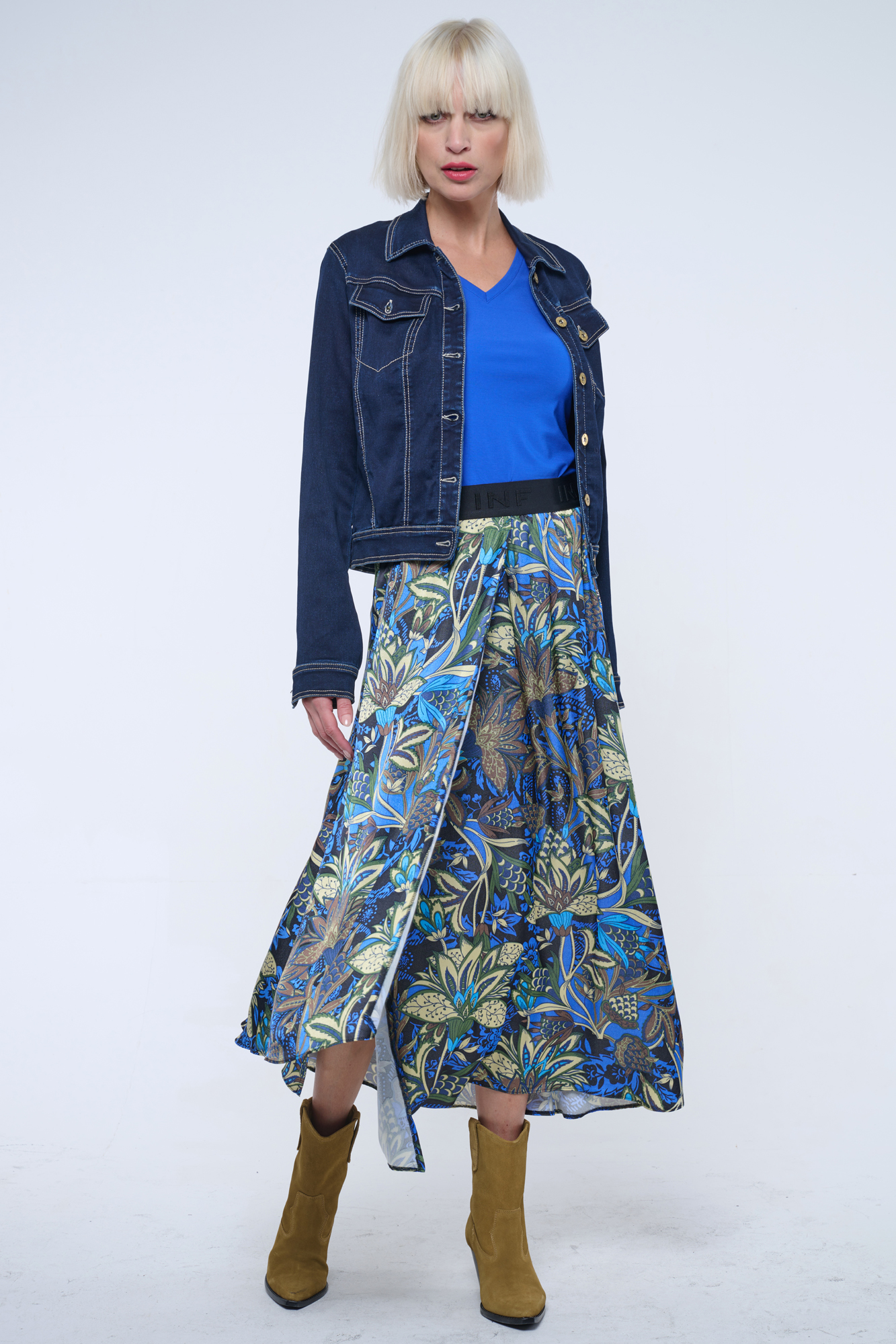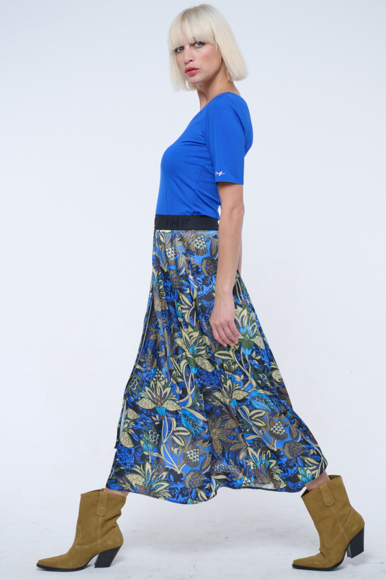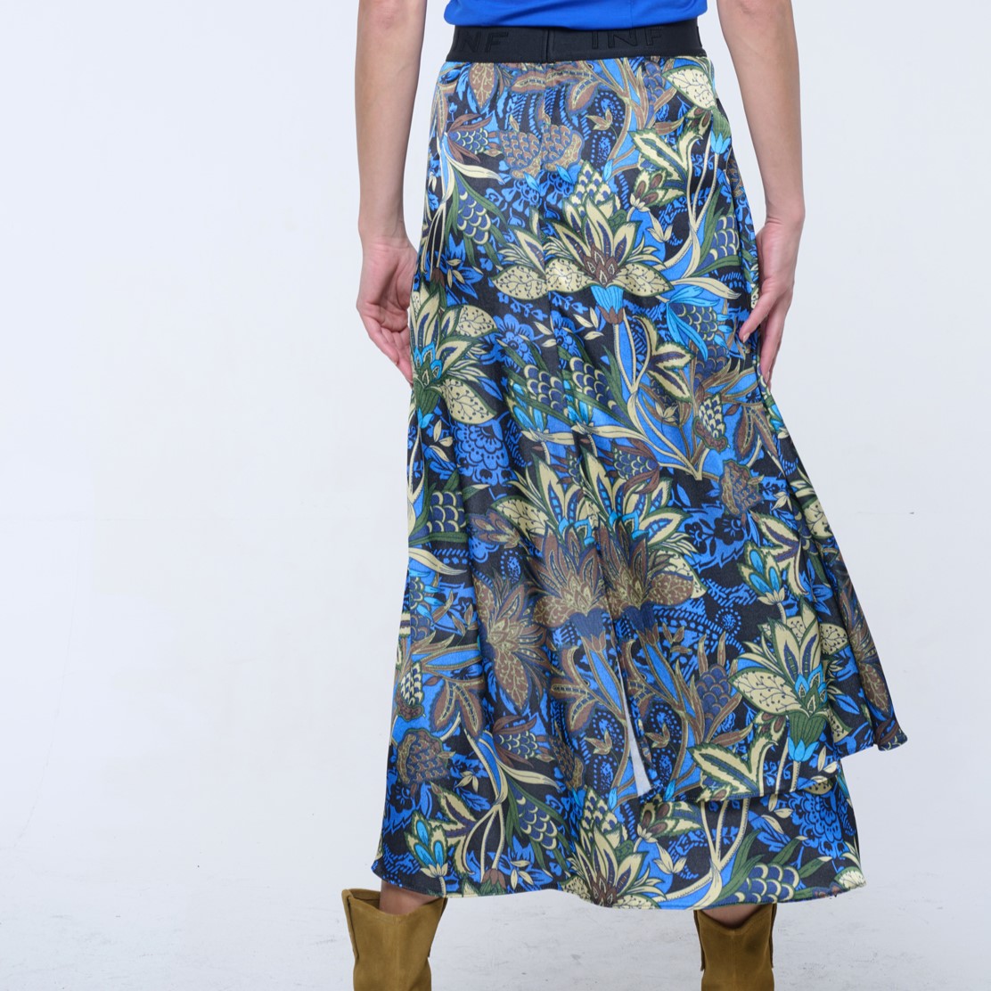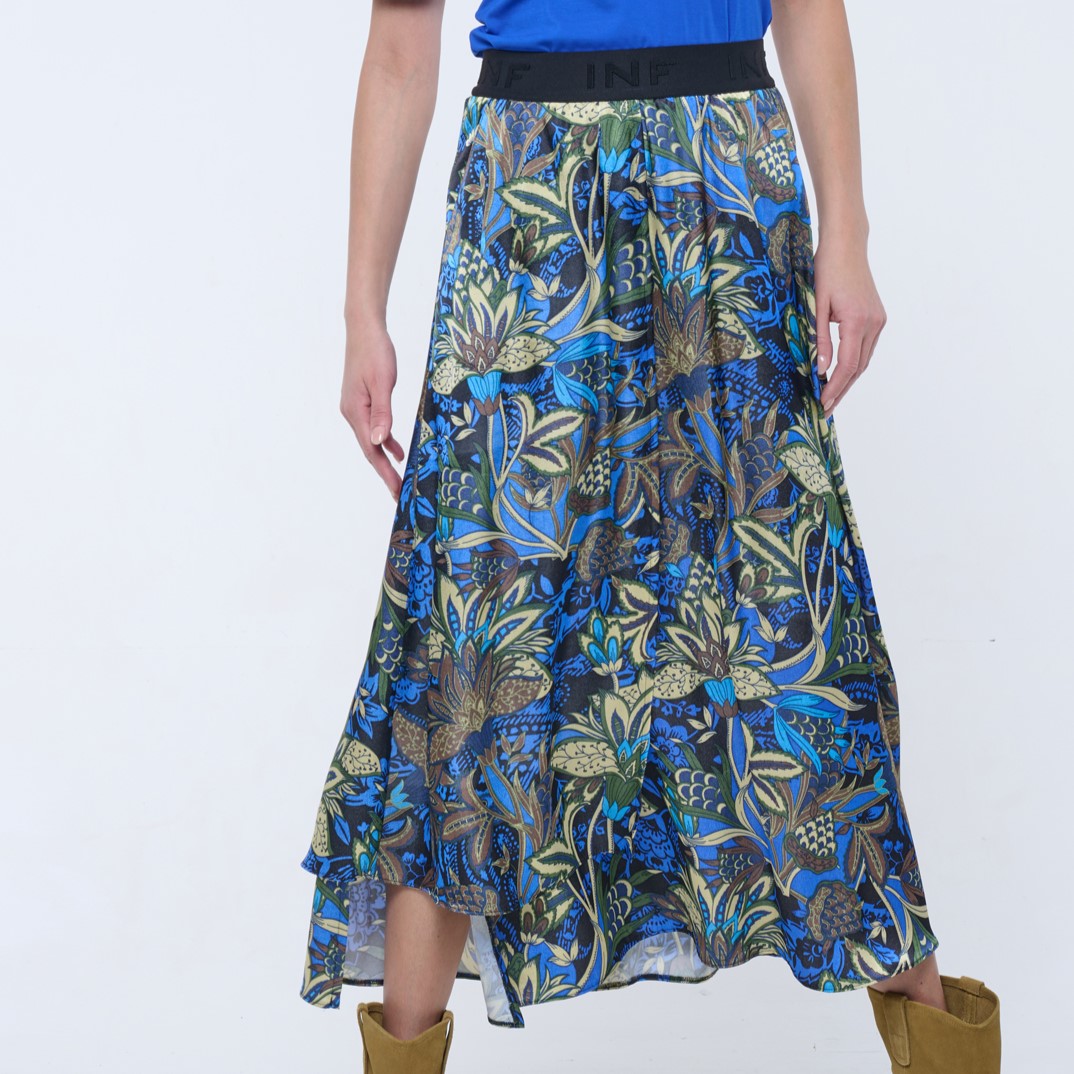 Dlouhá sukně s kapsami a efektní strečovou gumou INF v pase. Na boku malé zlaté krystalové logo INF.