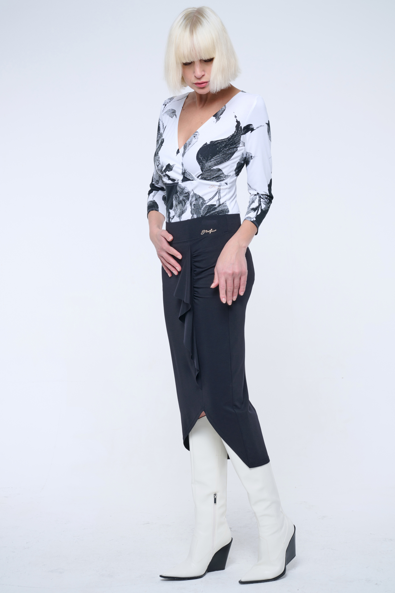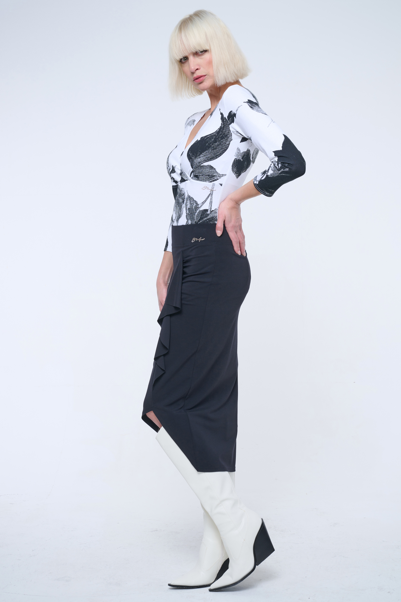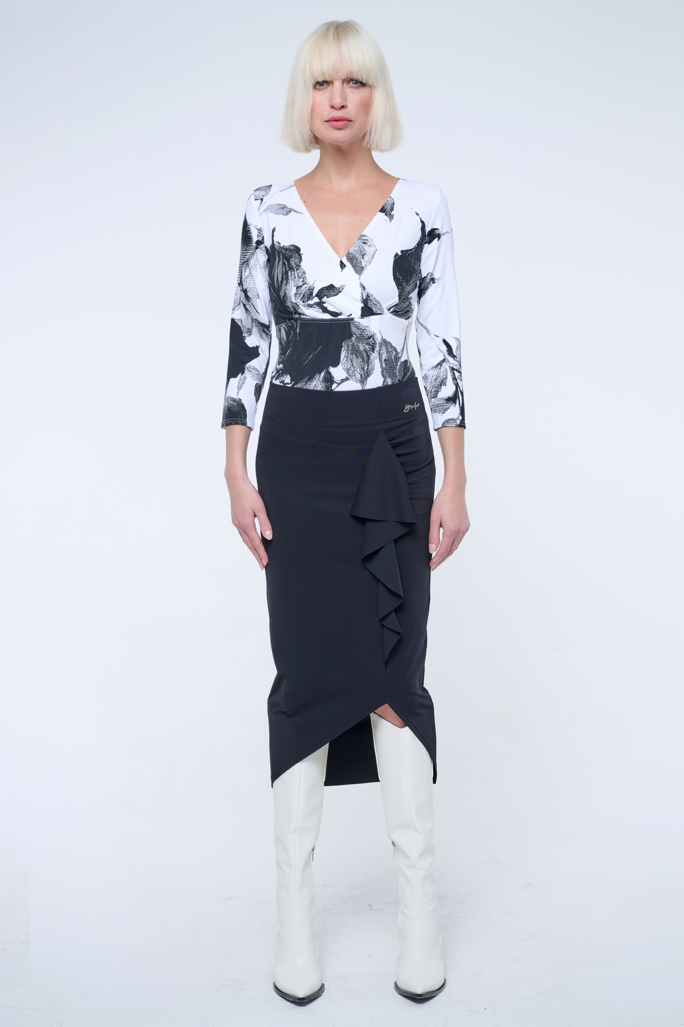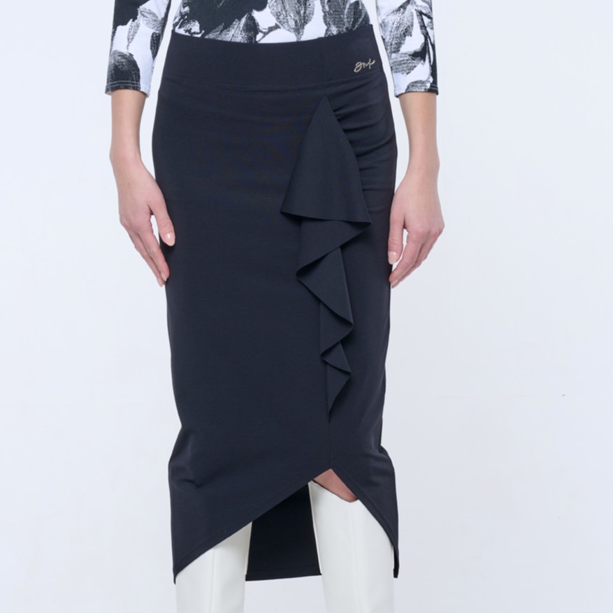 Sukně pod kolena velmi úzkého střihu ze strečového úpletu. Na předním díle efektní volán a v pase zlaté krystalové logo INF.