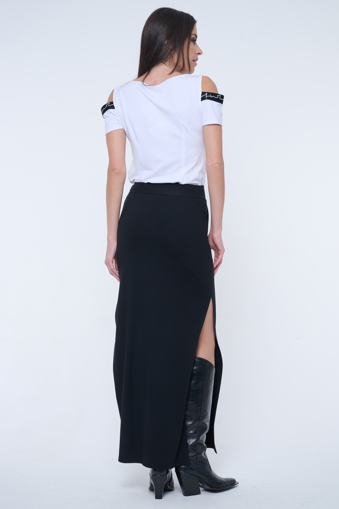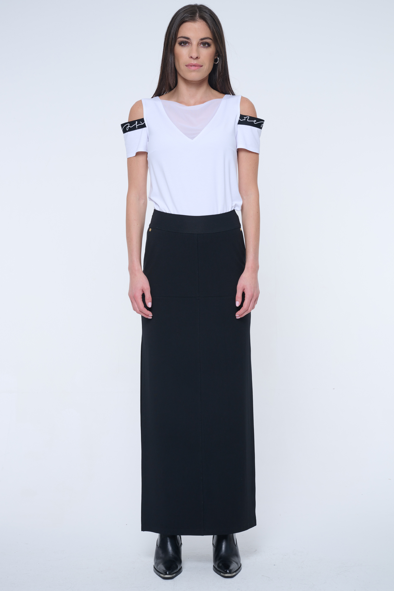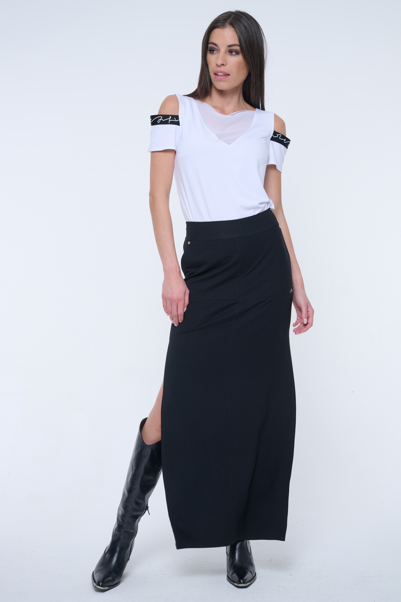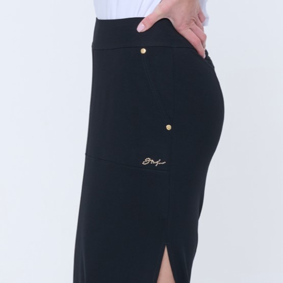 Úzká sukně sportovnějšího střihu v dlouhé délce. Na předním díle u kapsy zlaté krystalové logo INF.