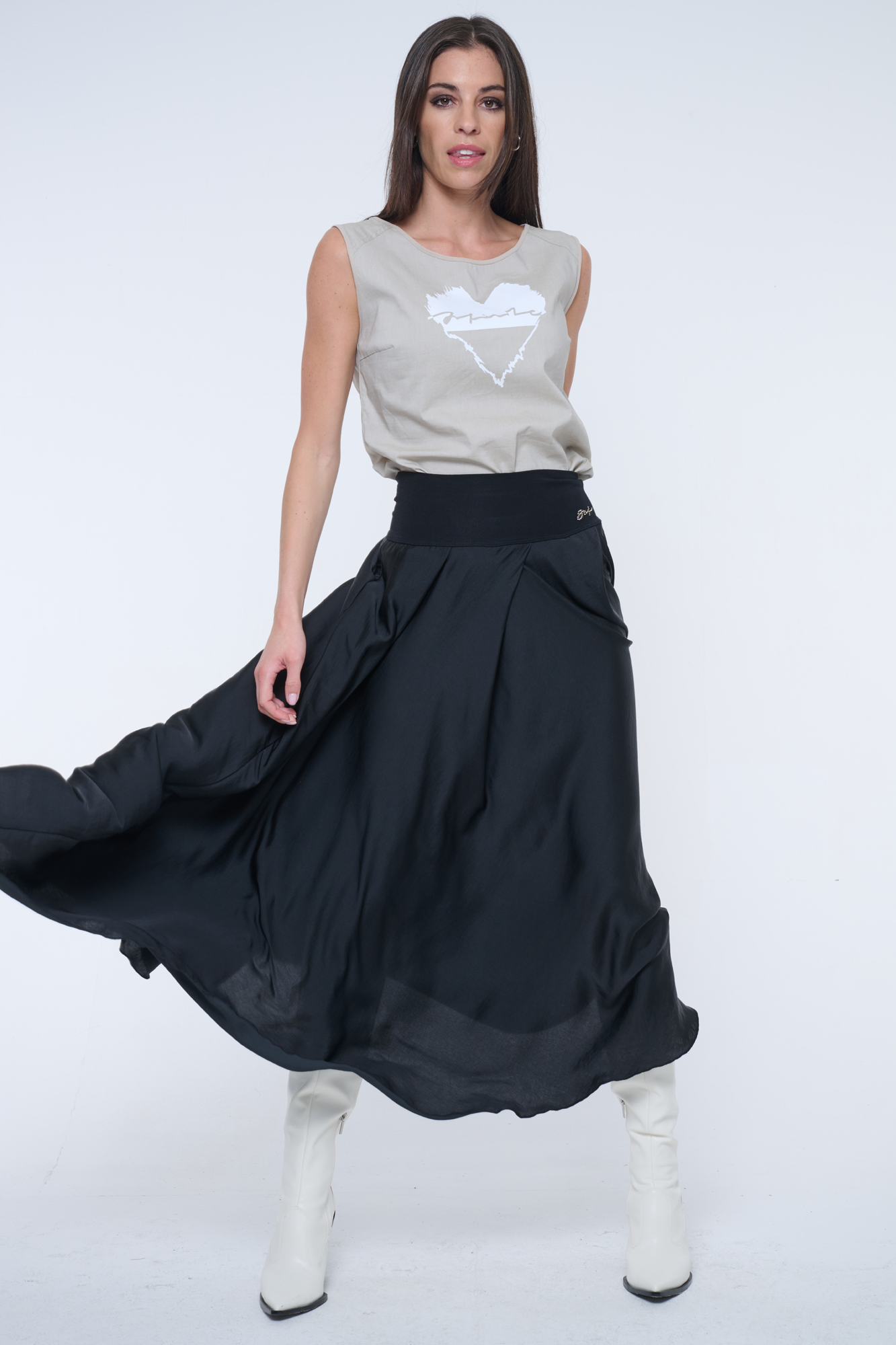 Delší sukně se sklady v jednom směru na předním díle. Krystalové zlaté logo na předním díle.