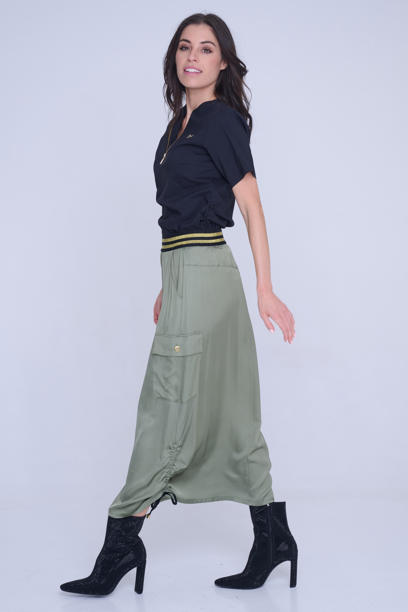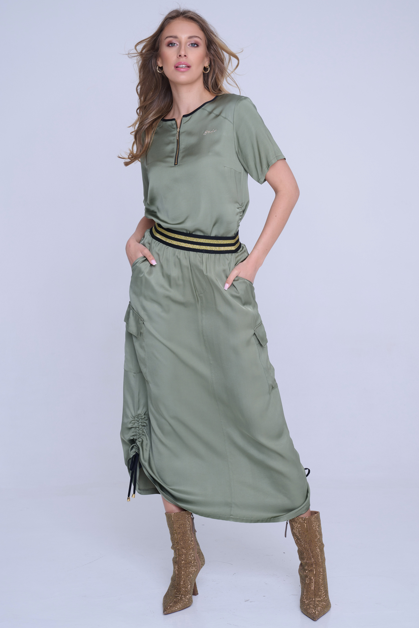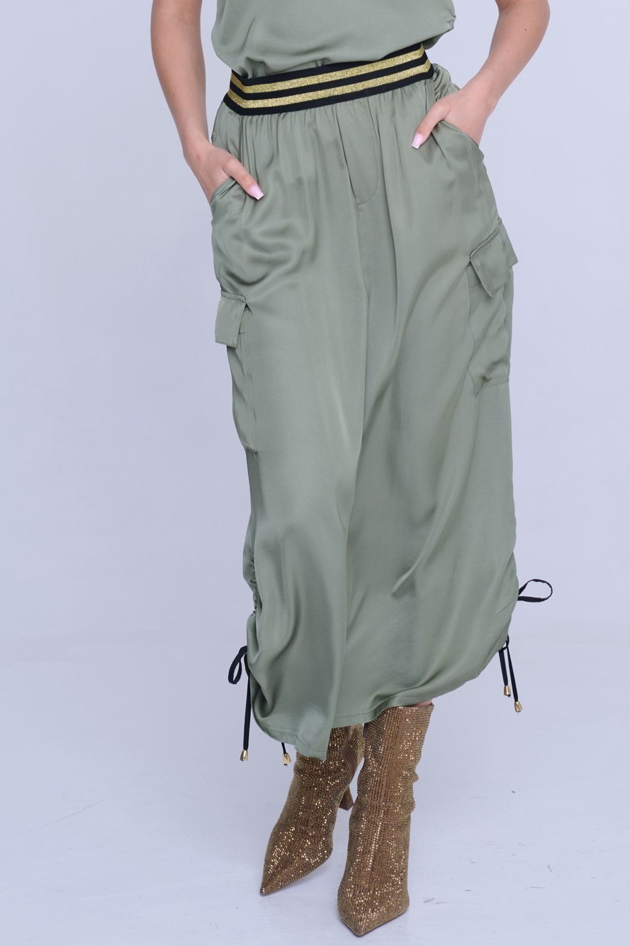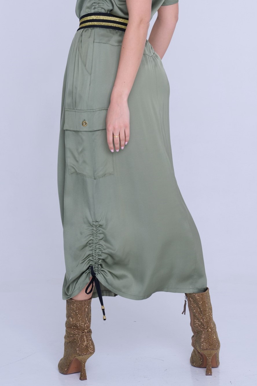 Sukně s cargo kapsou z velmi příjemného strečového přírodního materiálu. Detaily nabírání na stranách s nastavitelnými vázačkami.