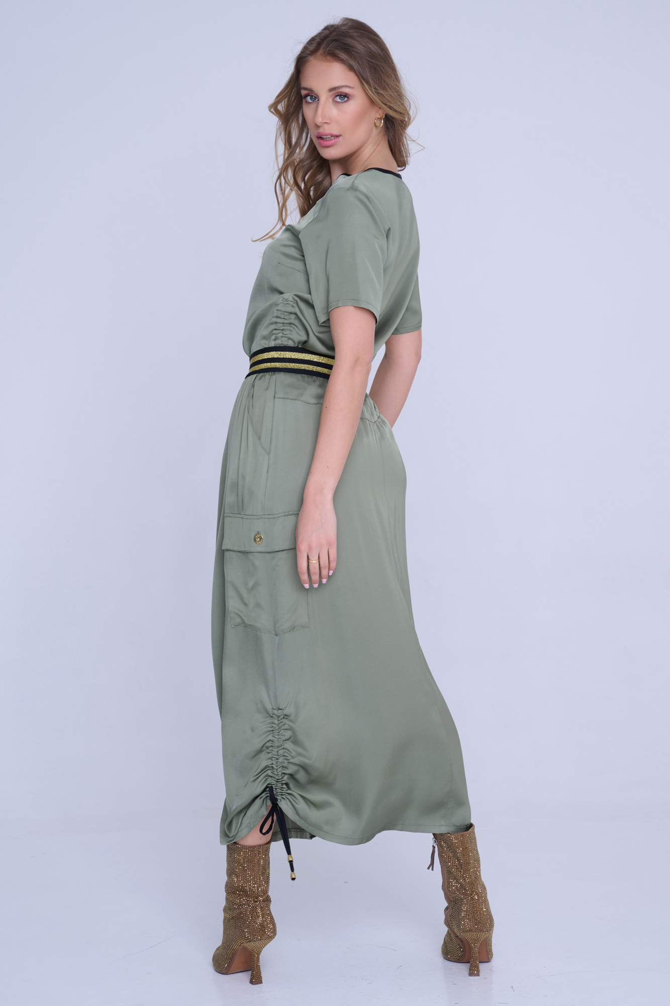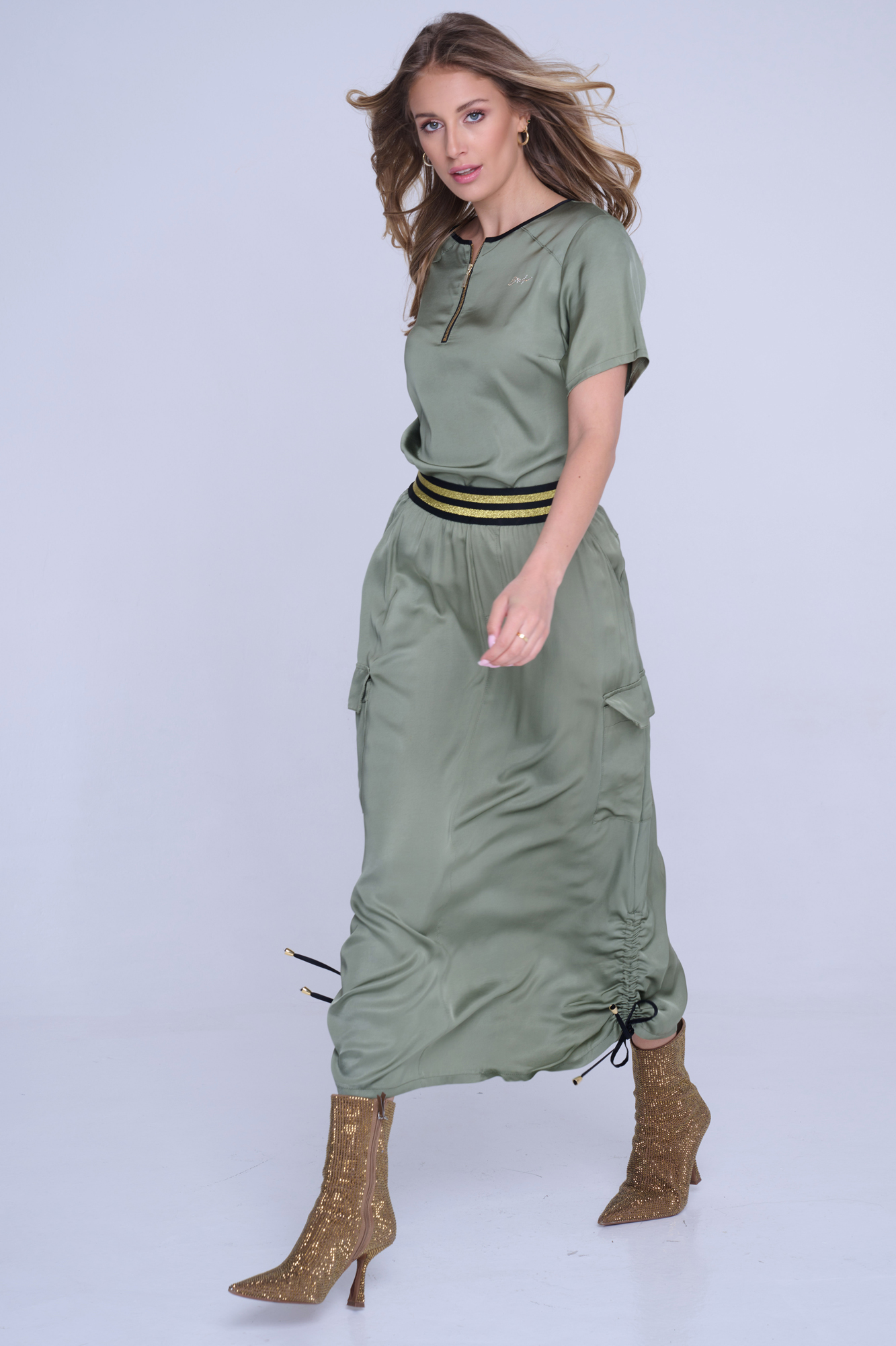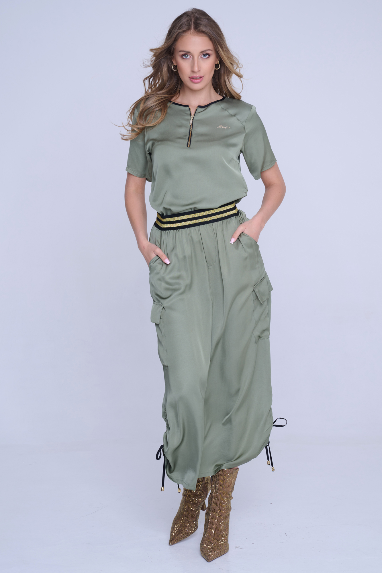 Sukně s cargo kapsou z velmi příjemného strečového přírodního materiálu. Detaily nabírání na stranách s nastavitelnými vázačkami.