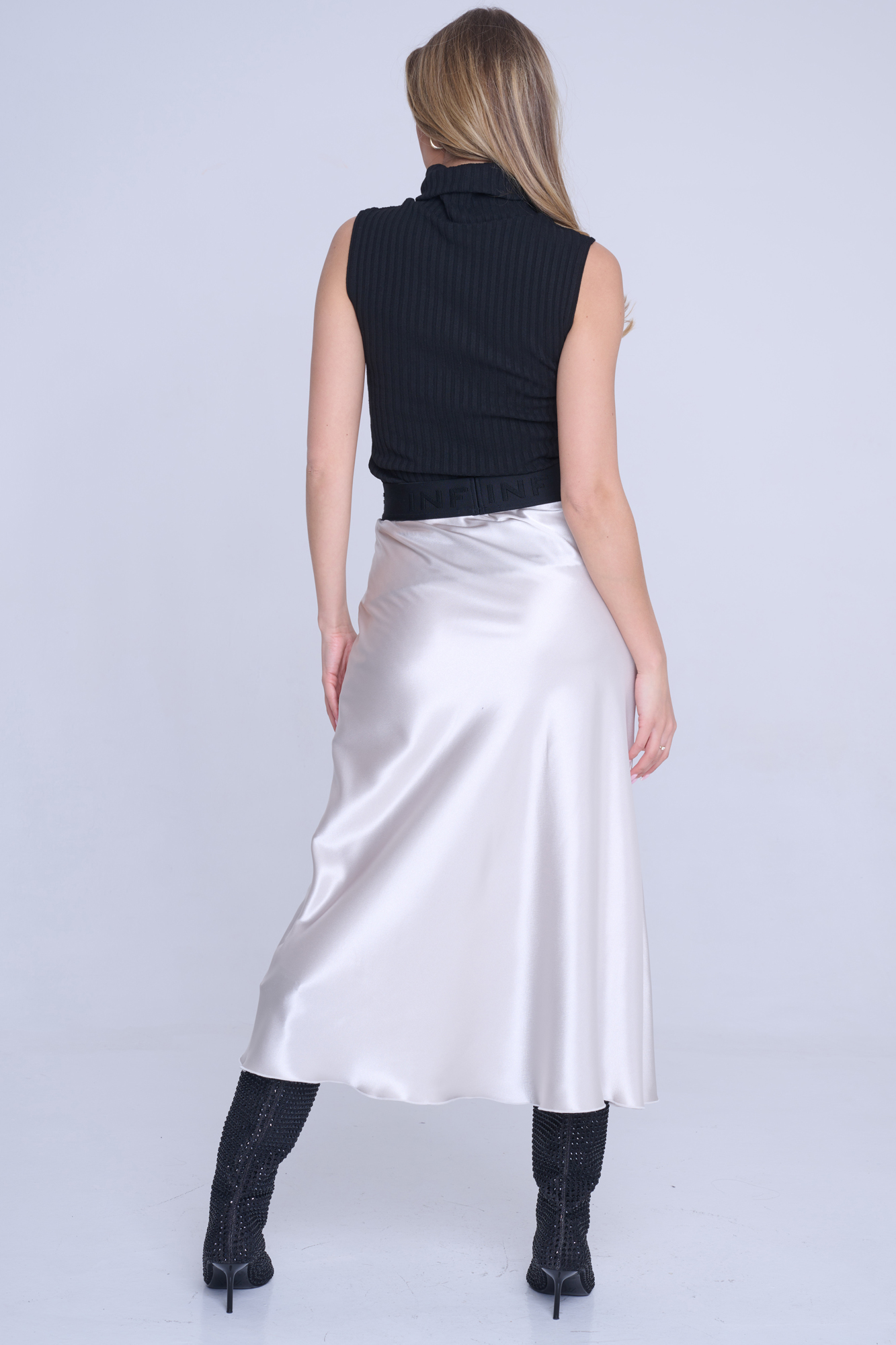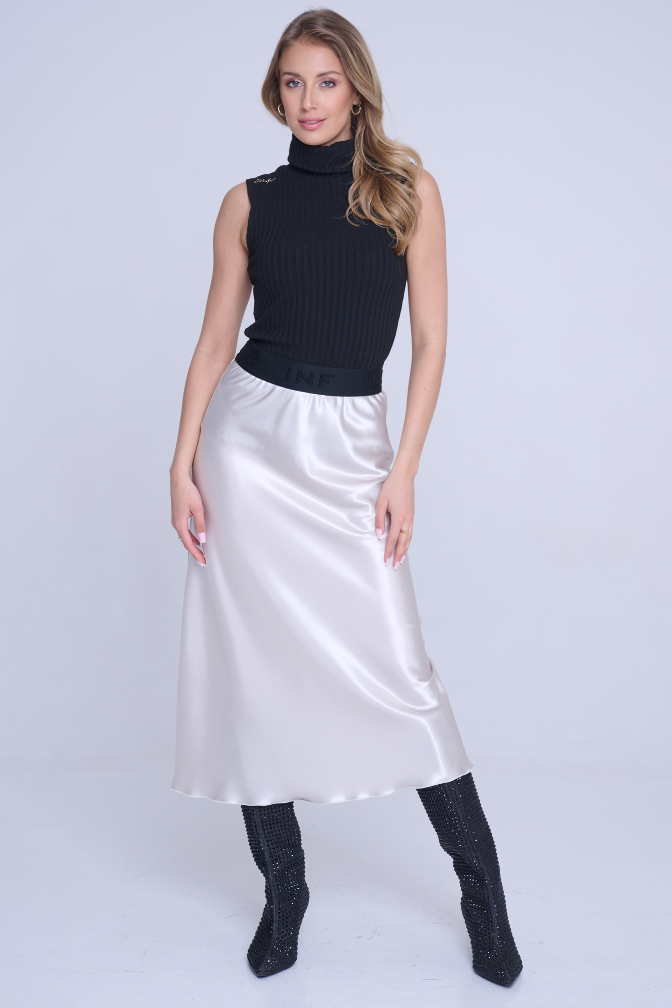 Saténová dlouhá sukně. V pase efektní guma INF.