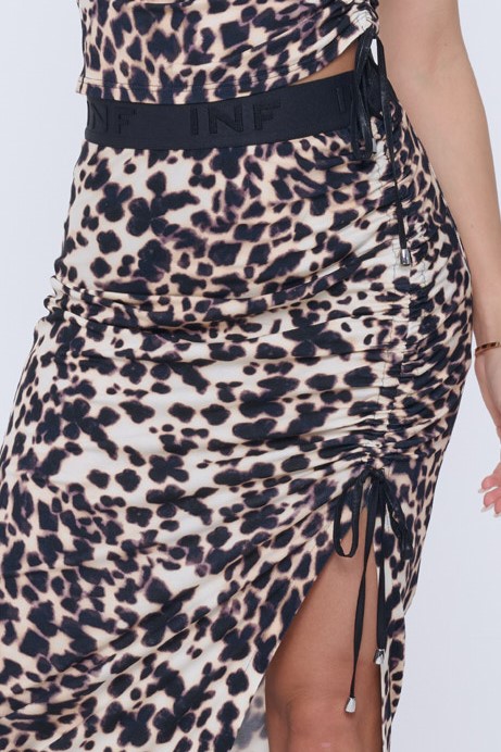 Sukně ze strečového úpletu. Na boku je rozparek s tkaničkou, kterou lze upravit jeho délku.