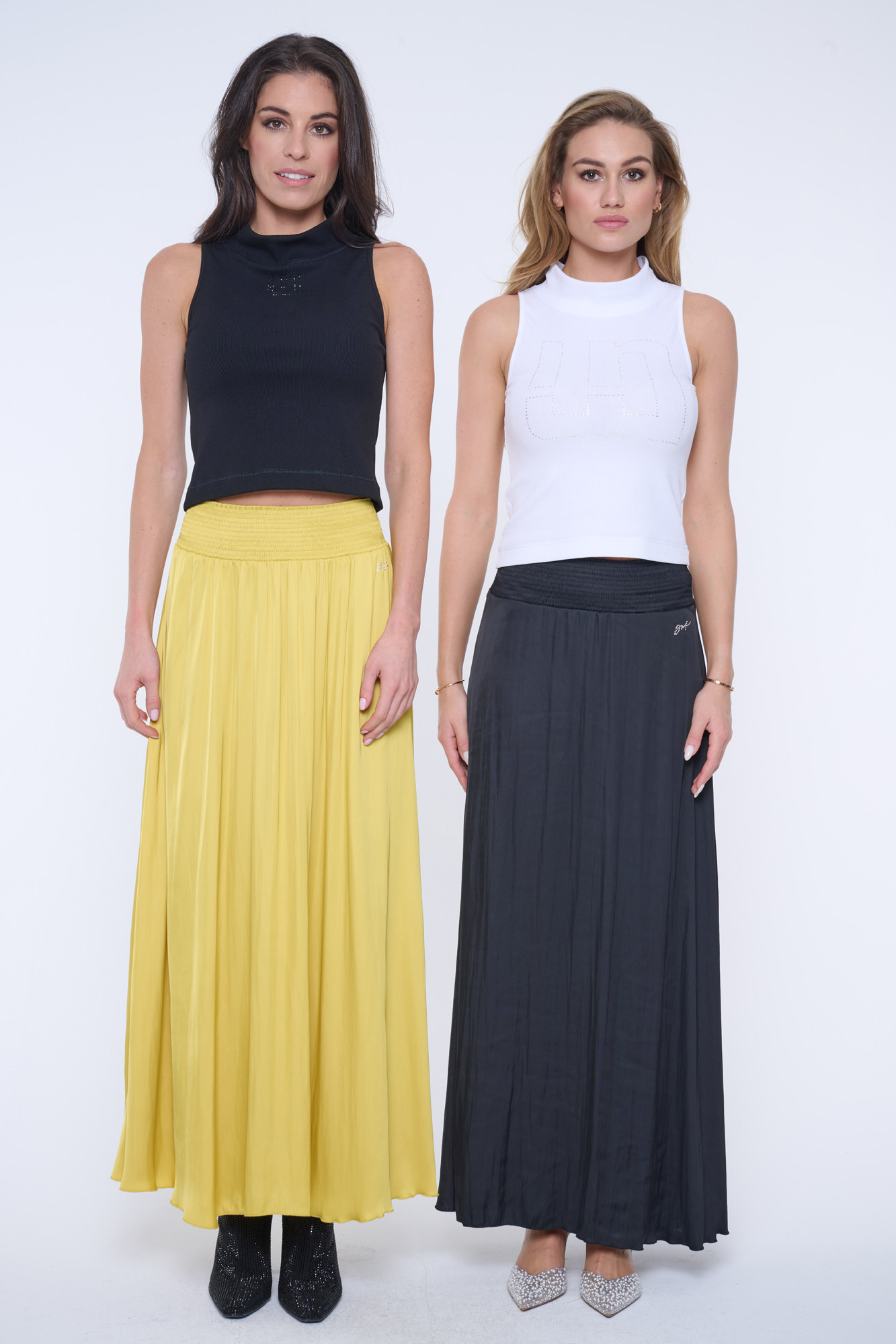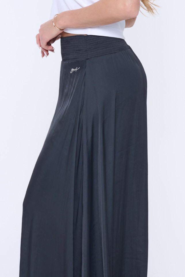 Dlouhá rozevlátá sukně z umělého hedvábí. V pase "žabičky" a minimalistické krystalové logo INF.