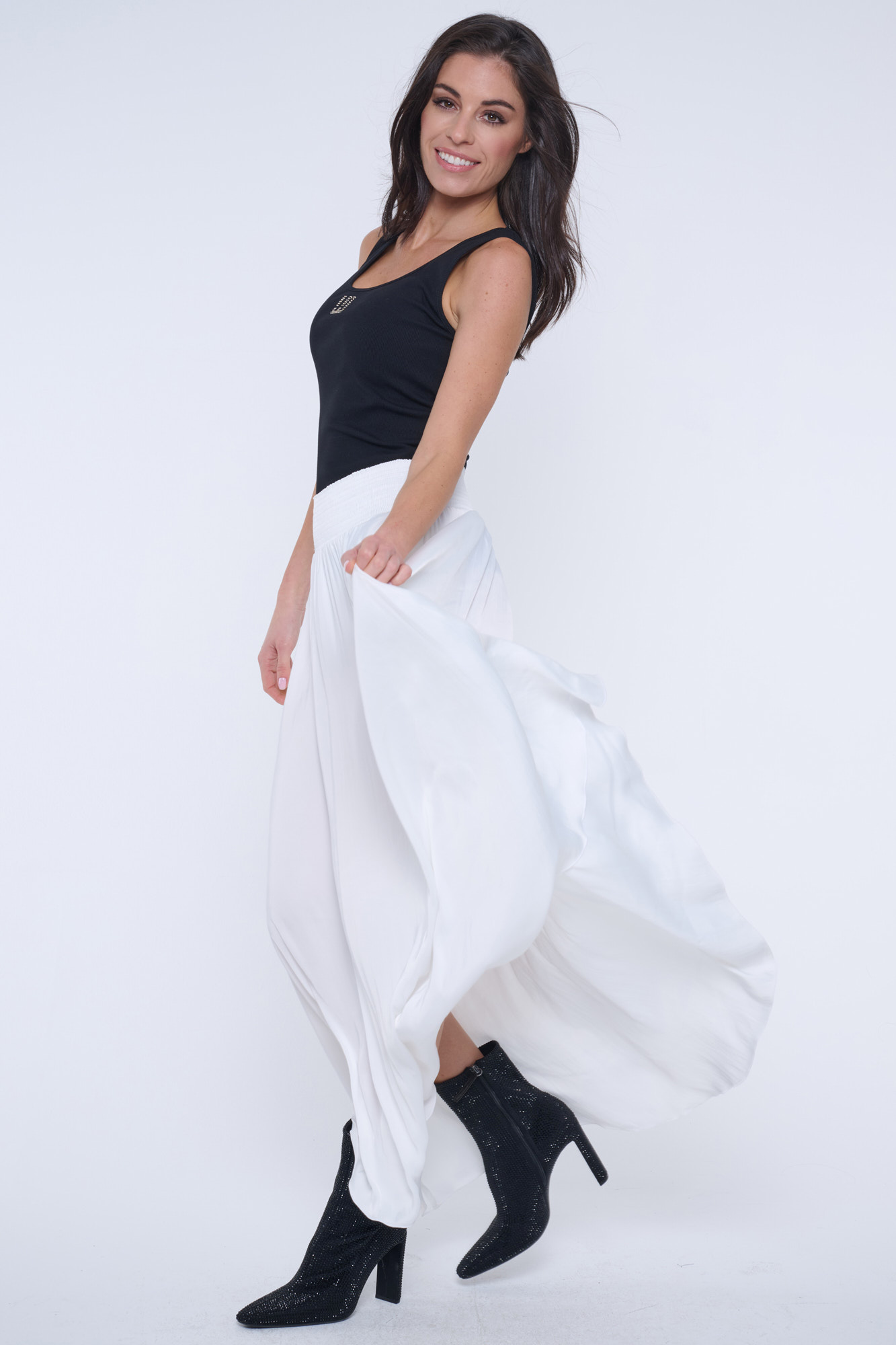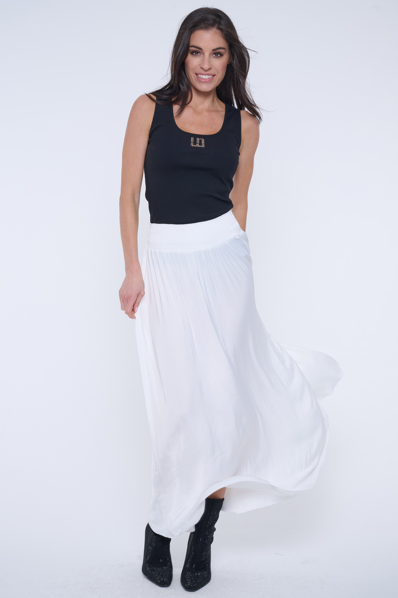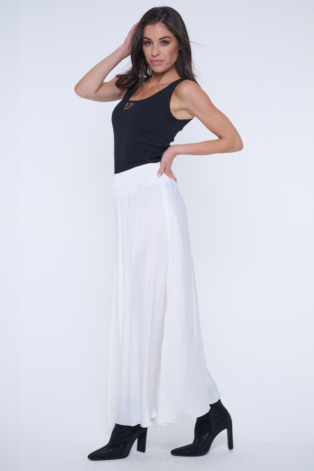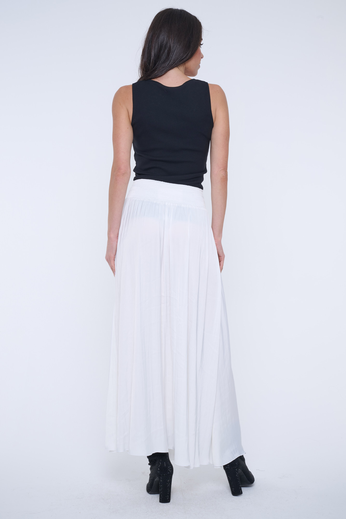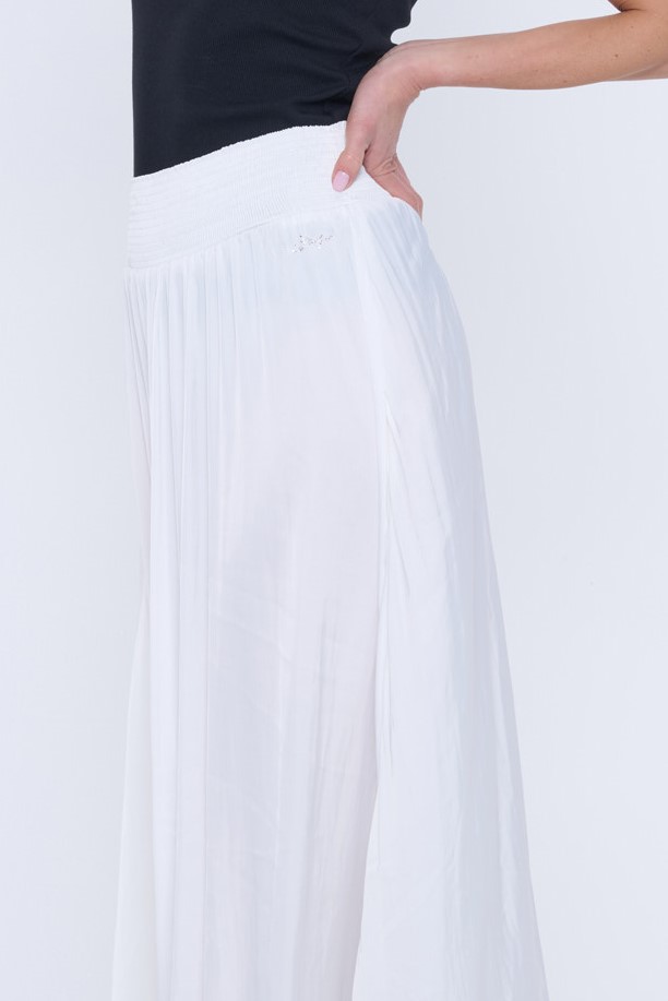 Dlouhá rozevlátá sukně z umělého hedvábí. V pase "žabičky" a minimalistické krystalové logo INF.