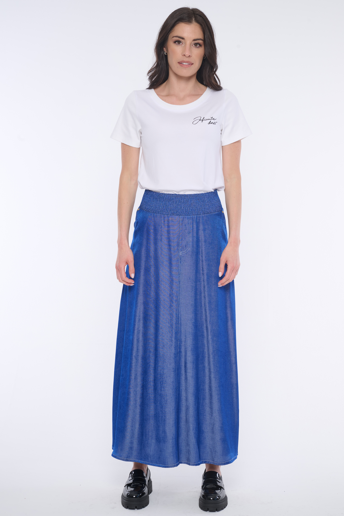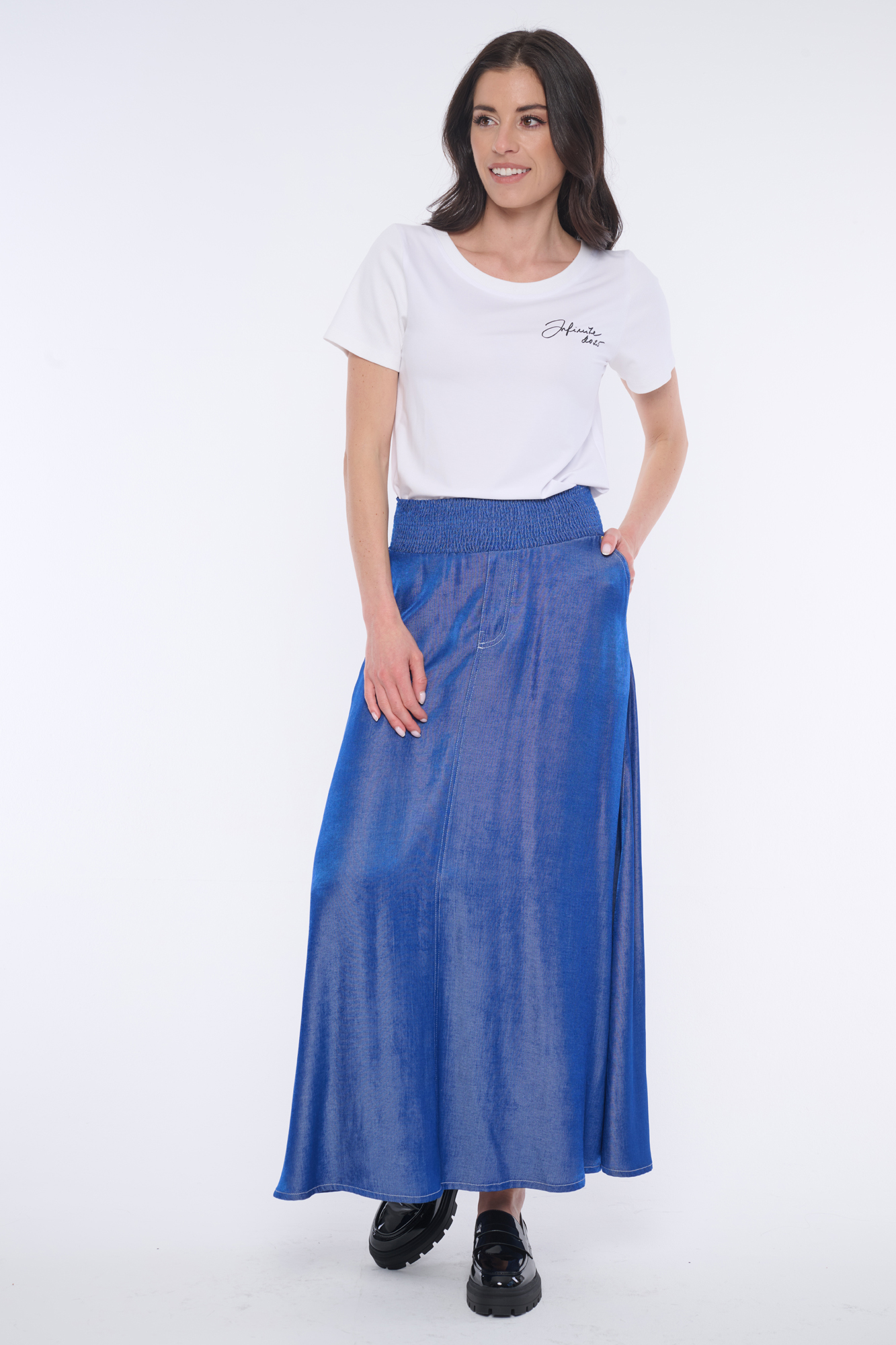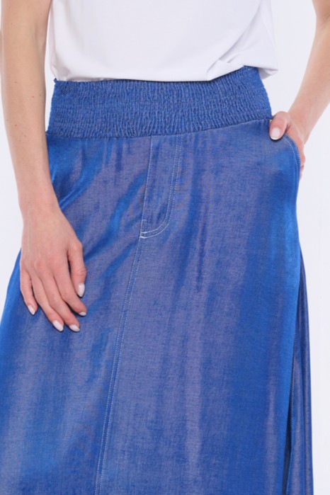 Dlouhá sukně "džínového looku" se strečovým pasem s efektem "žabiček". Bílé štepování.