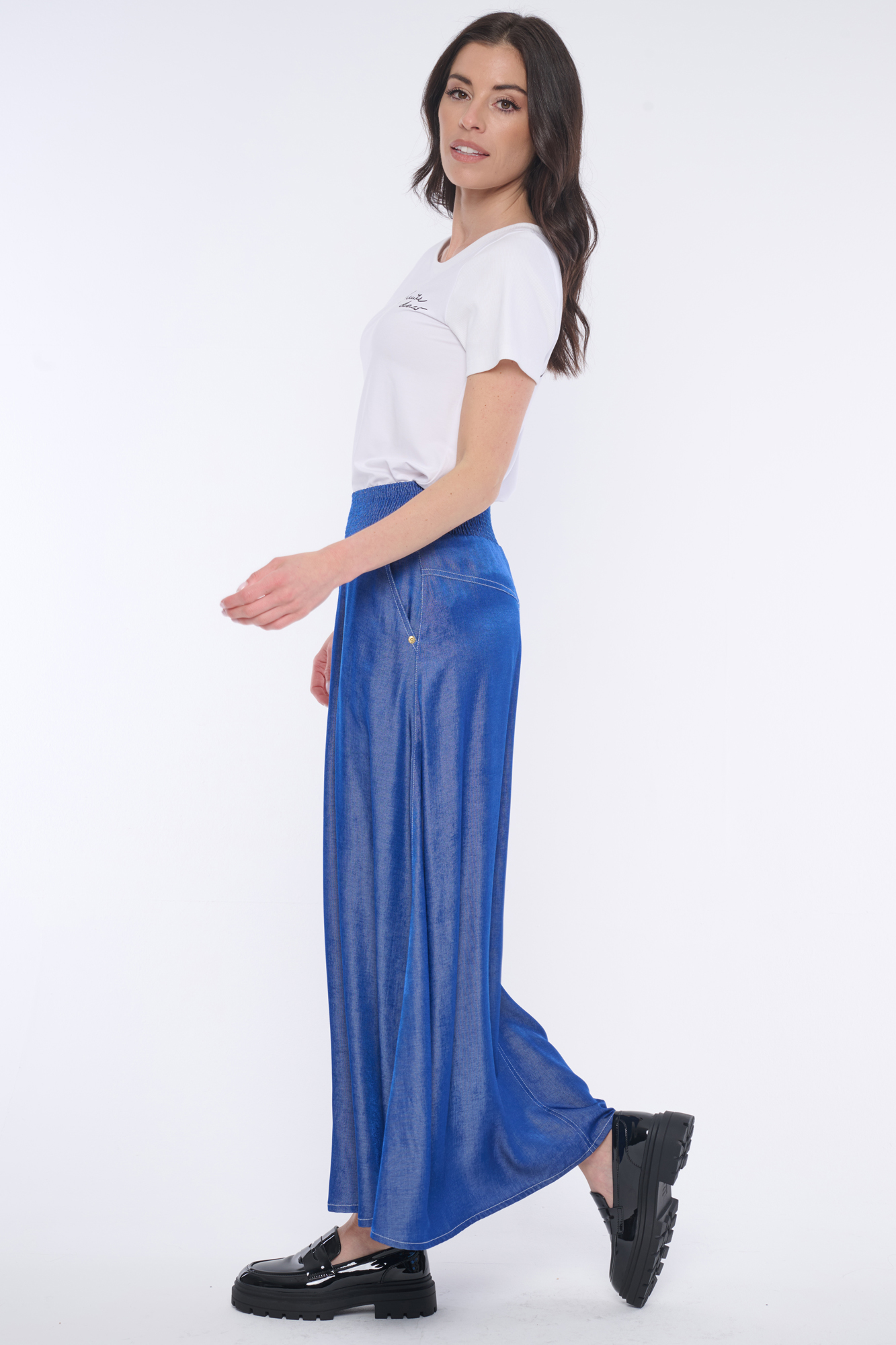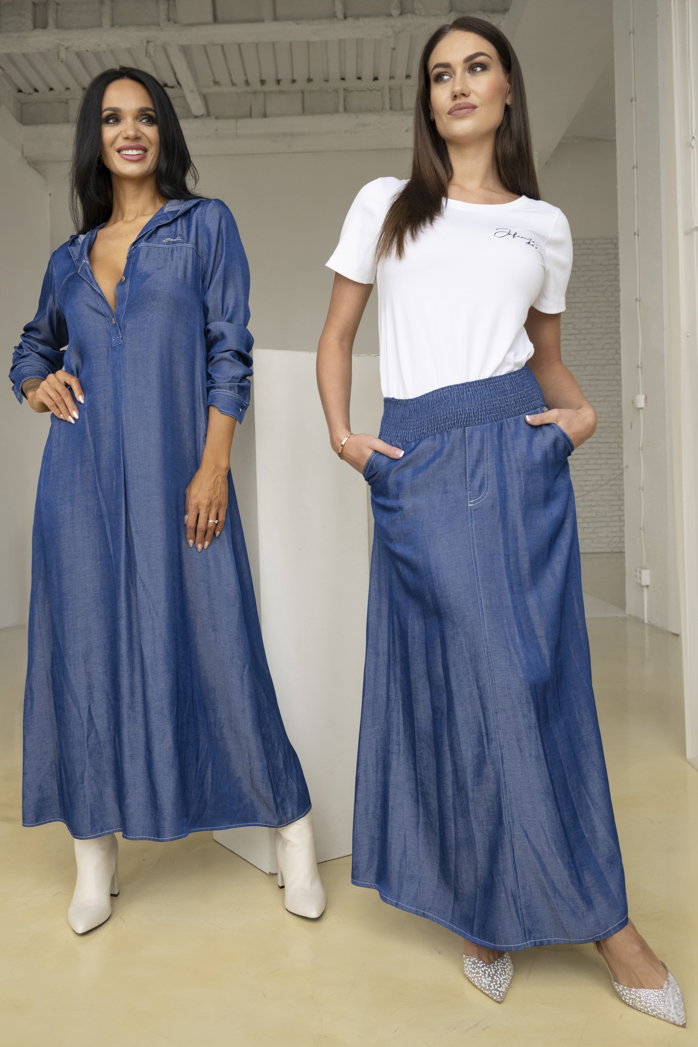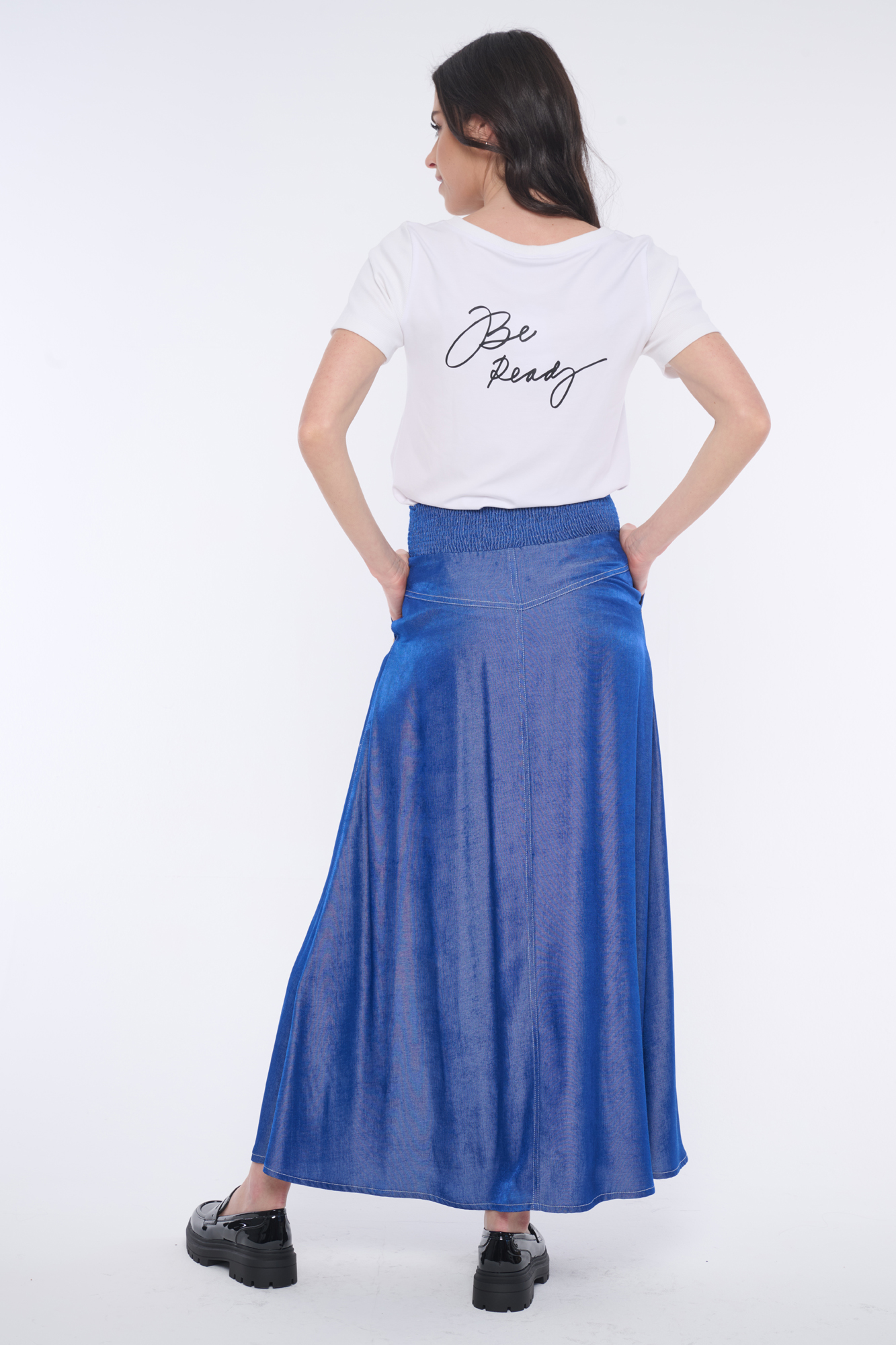 Dlouhá sukně "džínového looku" se strečovým pasem s efektem "žabiček". Bílé štepování.