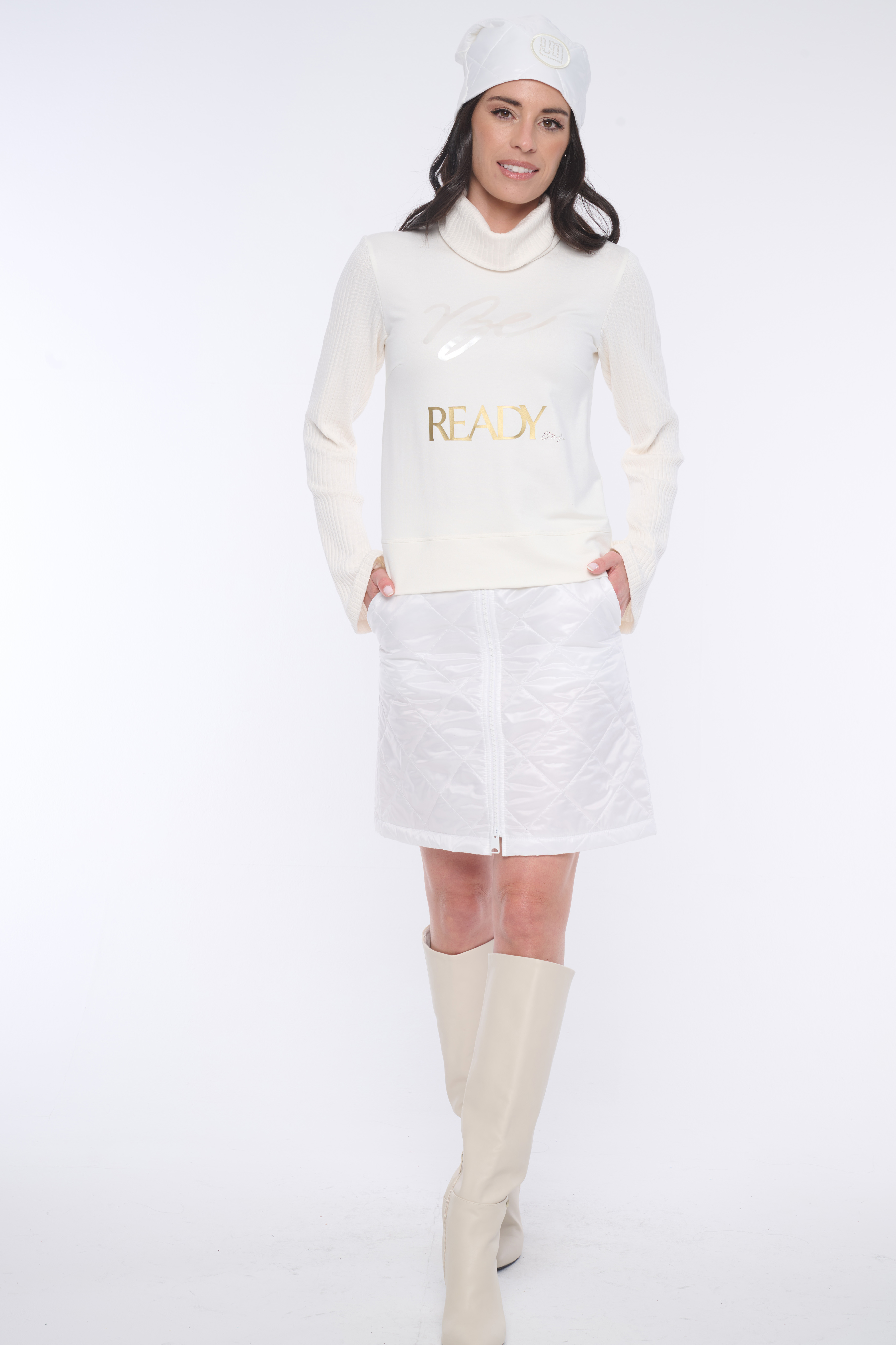 Krátká sukně ze šusťákového proševu se strečovým pasem z "ribs" úpletu. Ve středu sukně efektní oboustranně dělitelný zip, kterým můžete regulovat výšku rozparku. V pase minimalistické logo INF ze zlatých krystalů Swarovski.