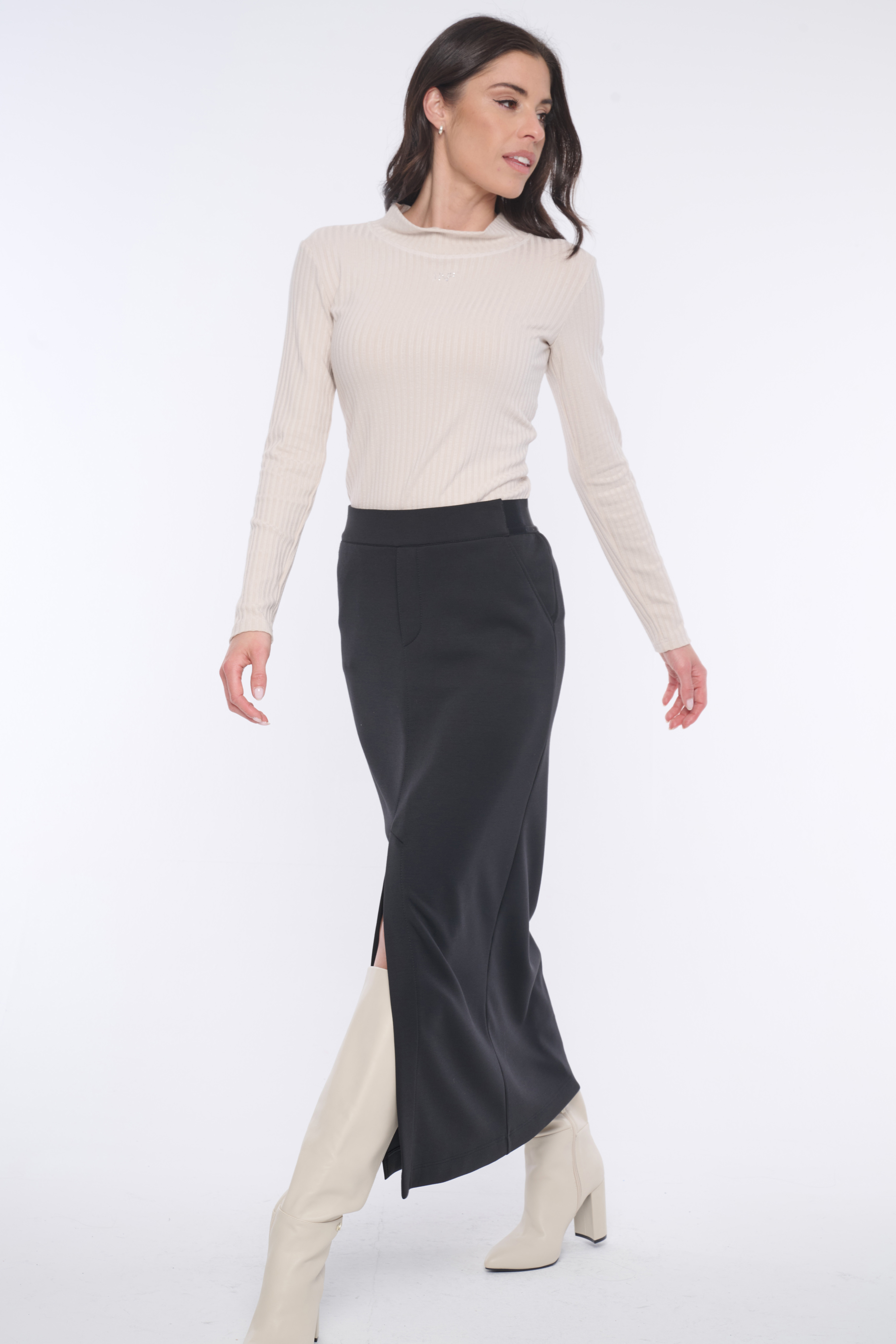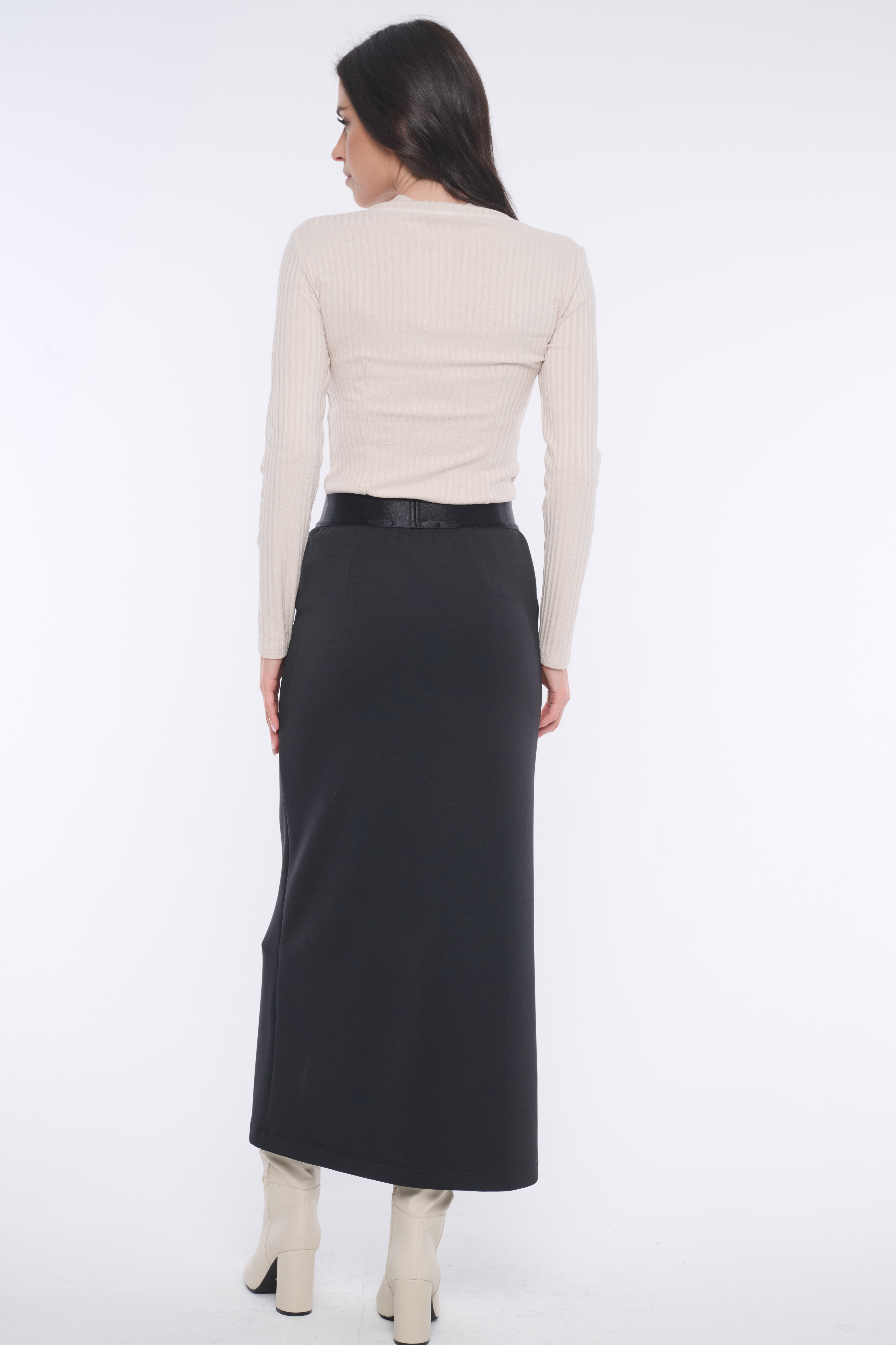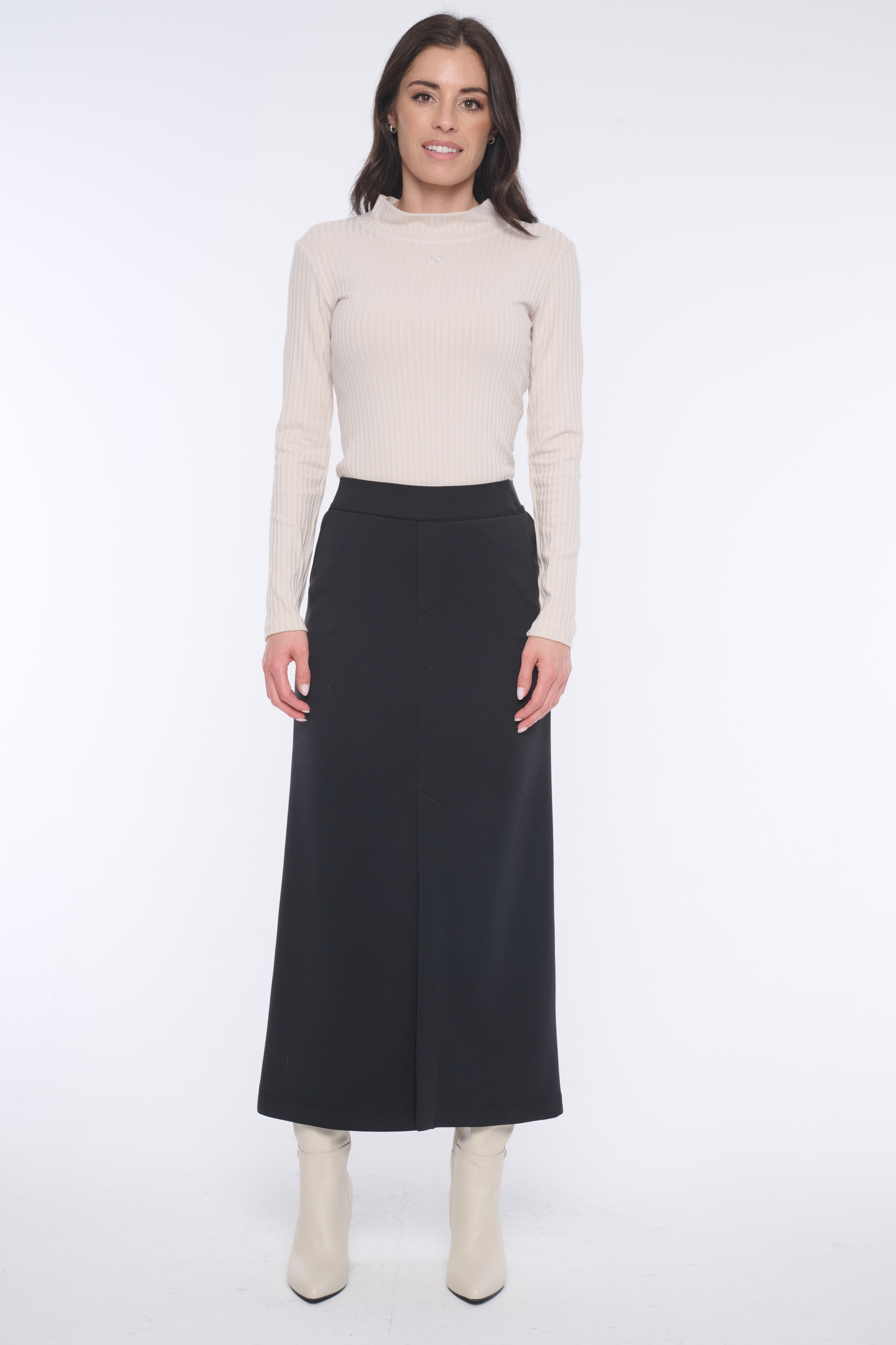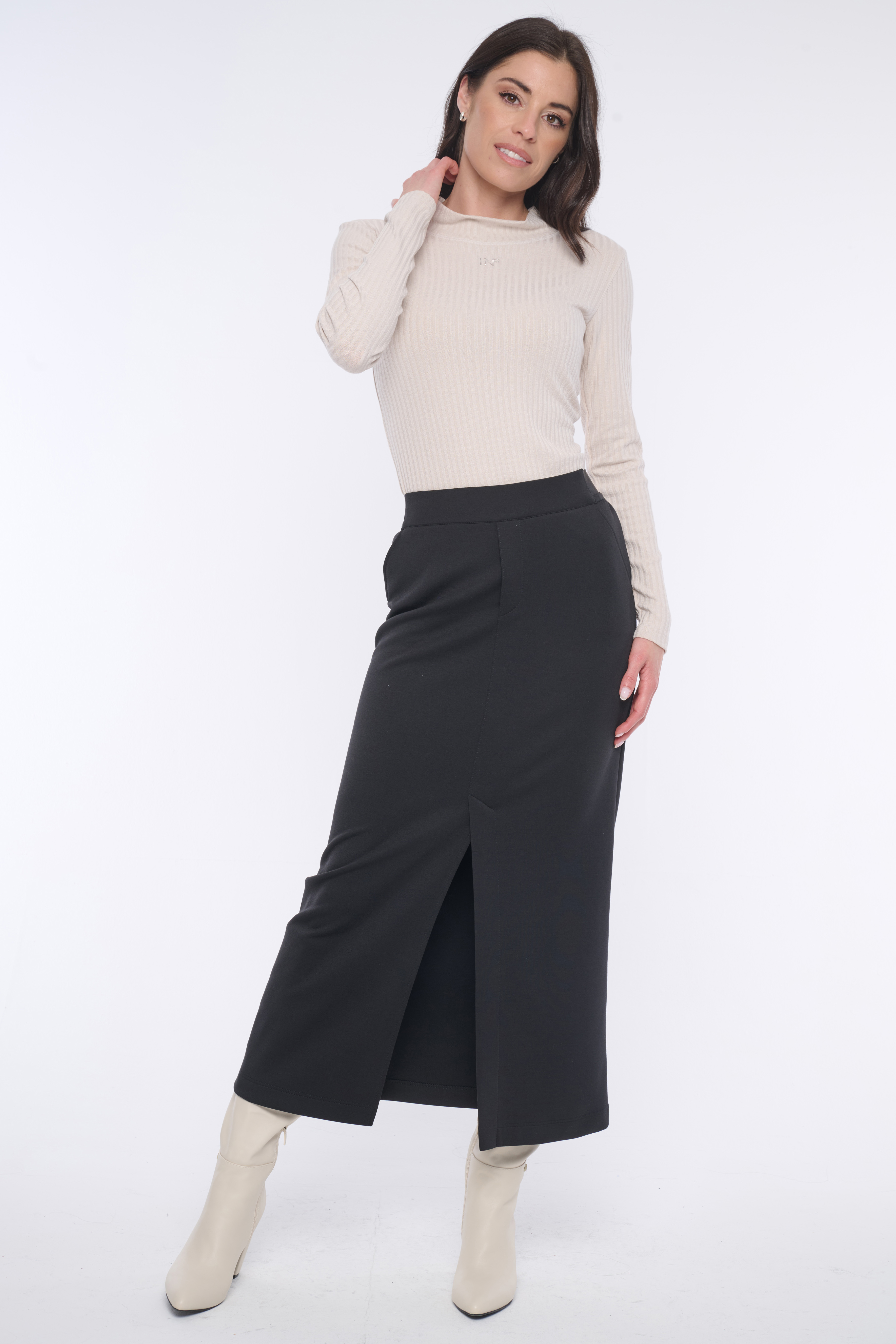 Minimalistická sukně z kvalitního úpletu nad kotníky se strečovým pasem. Na předním díle v délce rozparek.