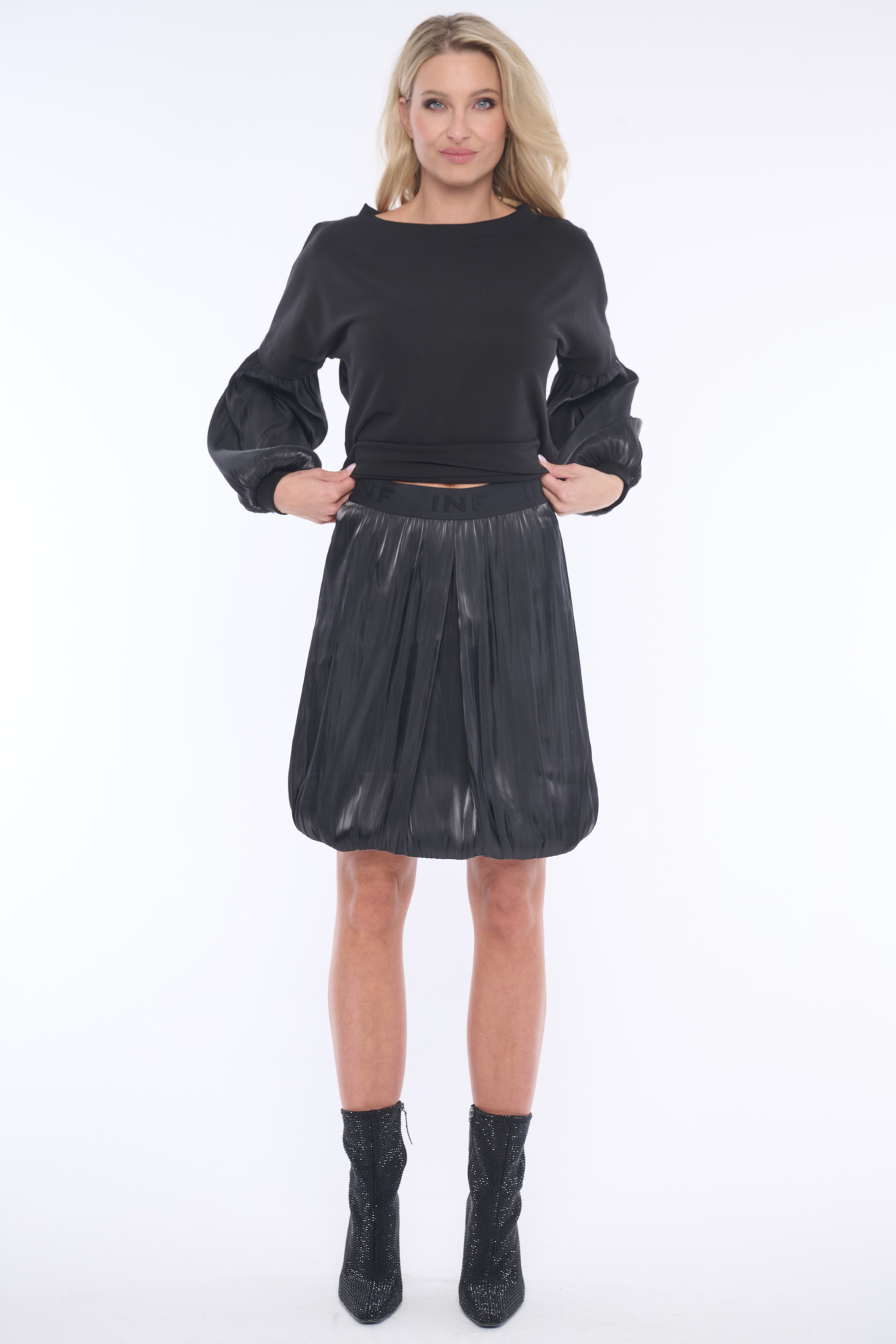 Lesklá balonová sukně v pase s gumou, která krásně zvýrazní a zúží pas. Ideální do setu s tričkem s balonovými rukávy ze stejného materiálu. Dostupná ve dvou barevných variantách a v dlouhé variantě.