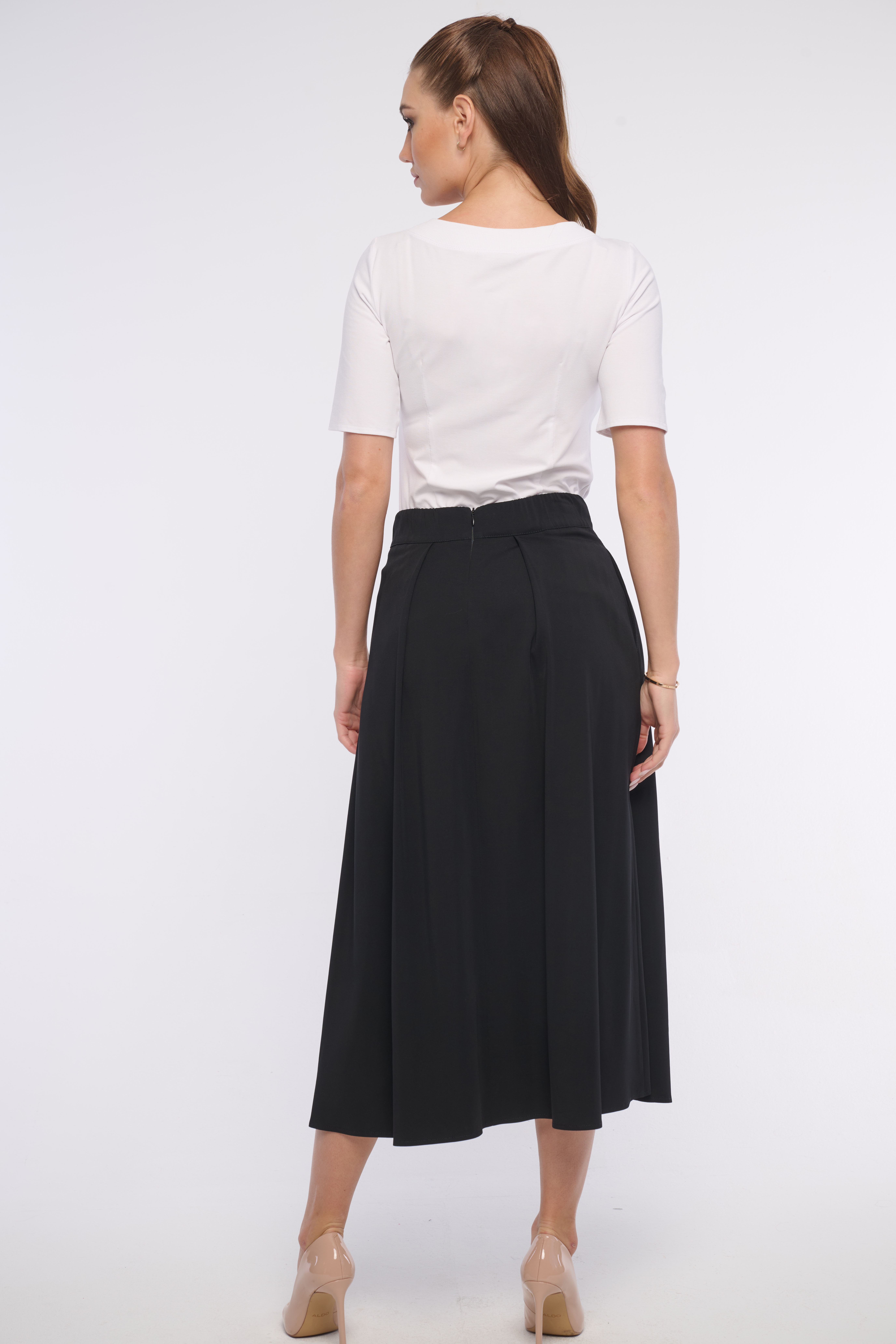 Luxusní volná sukně s gumou v pase, která krásně zvýrazní pas. Praktickým prvkem jsou nenápadné kapsy z boku. Detail tvoří logo z luxusních krystalů Swarovski. Dostupná ve třech barevných variantách.