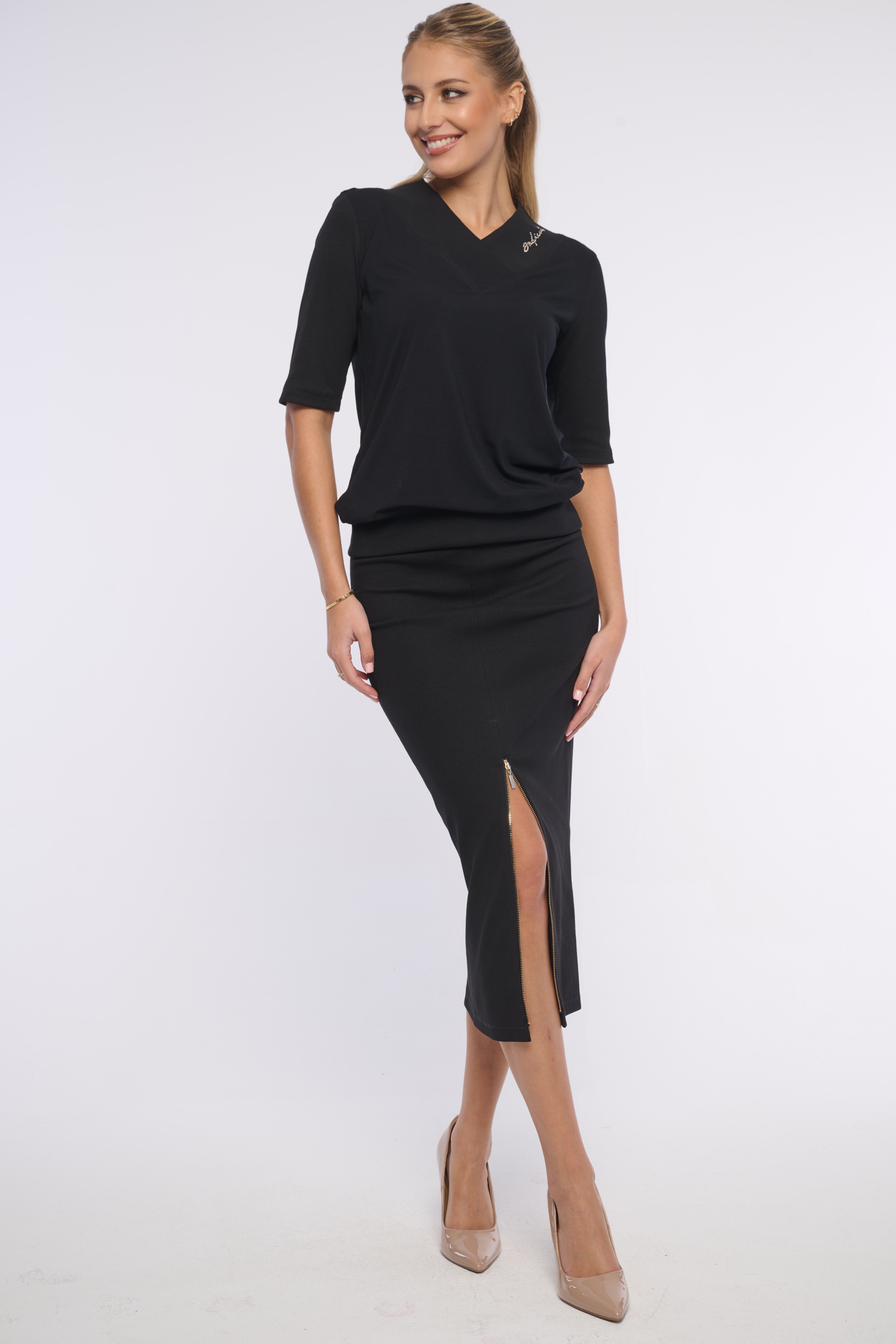 Elegantní dlouhá sukně z žebrového materiálu, která krásně tvaruje postavu. Dolní část sukně je doplněna výrazným zipem. Pas je oddělený švem s logem z luxusních krystalů Swarovski. Sukně je dostupná ve dvou barevných variantách.