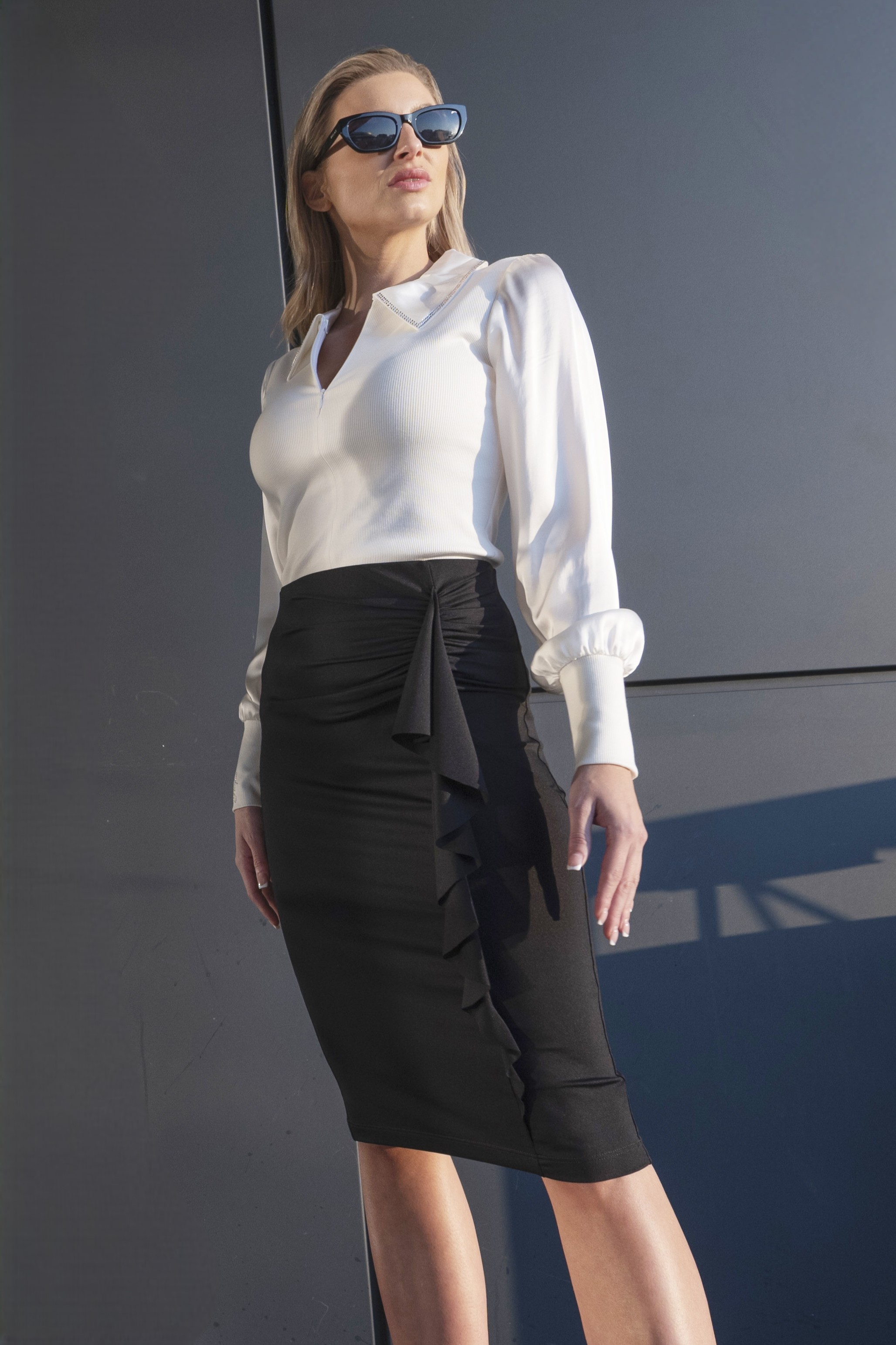 Luxusní elegantní sukně se zajímavým volným prvkem na boku. Guma v pase krásně zvýrazňuje pas. Vhodná na vyjímečné příležitosti i na běžné nošení. Sukně je dostupná i v delší variantě a dvou barvách.
