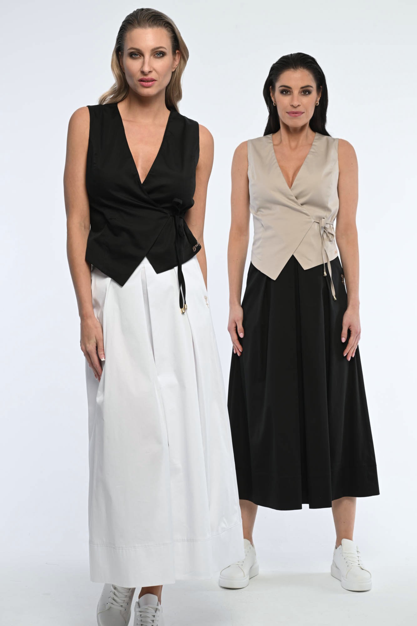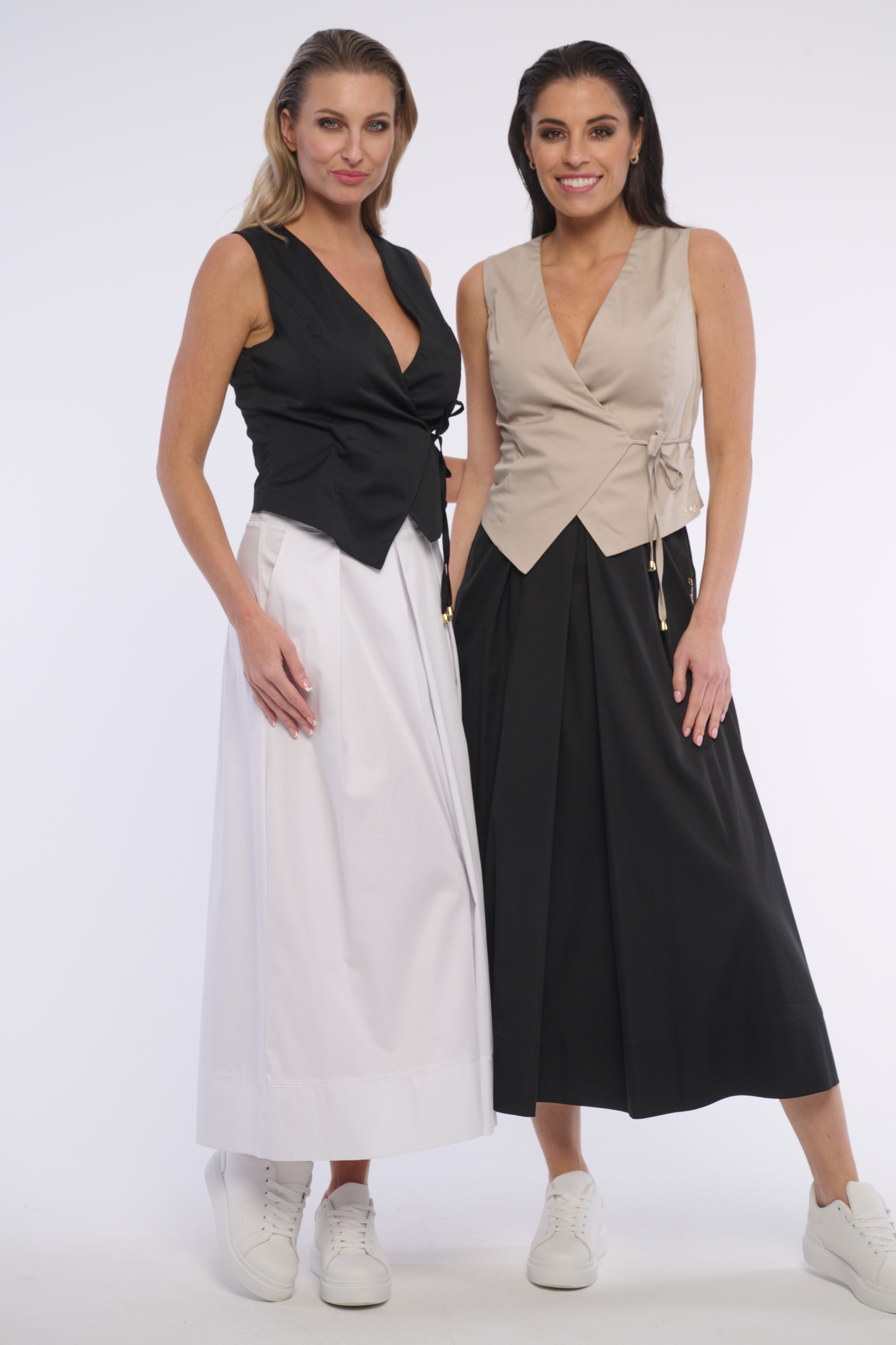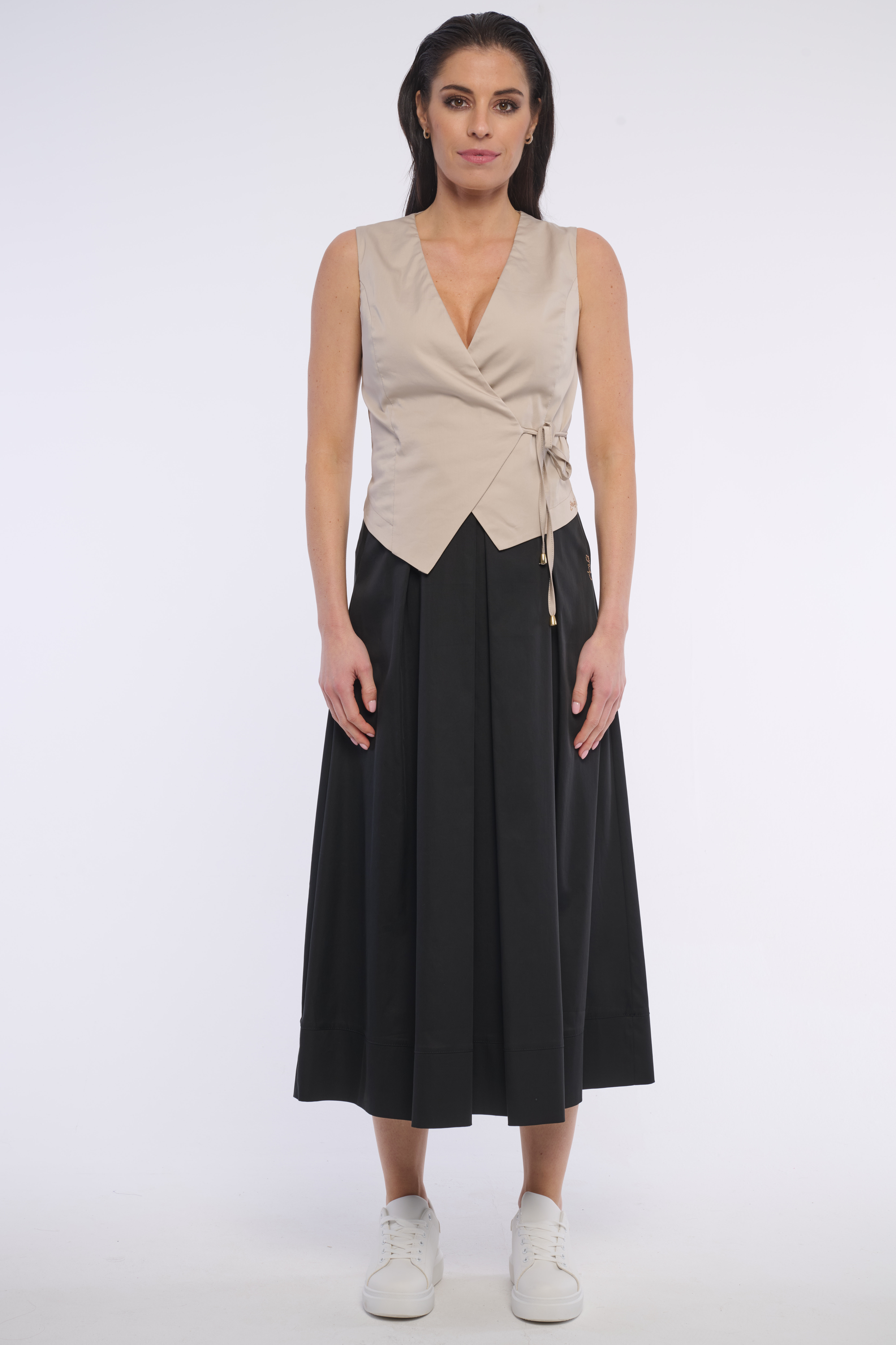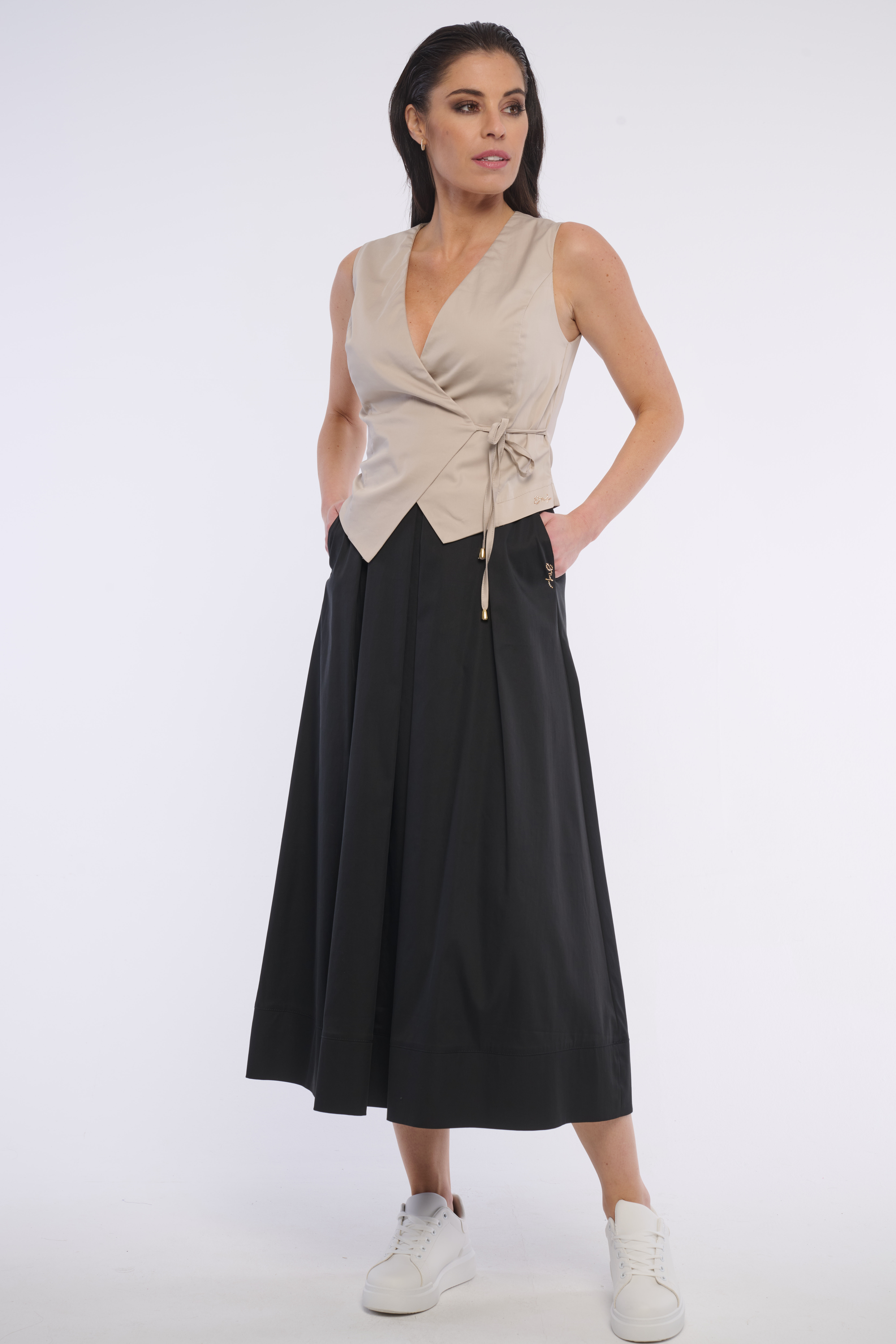 Elegantní dlouhá skládaná sukně s praktickými schovanými kapsami, vhodná na každou příležitost. S gumou v pase krásně tvaruje postavu. Detailem na boku je logo z luxusních krystalů Swarovski. Dostupná ve třech barevných variantách.