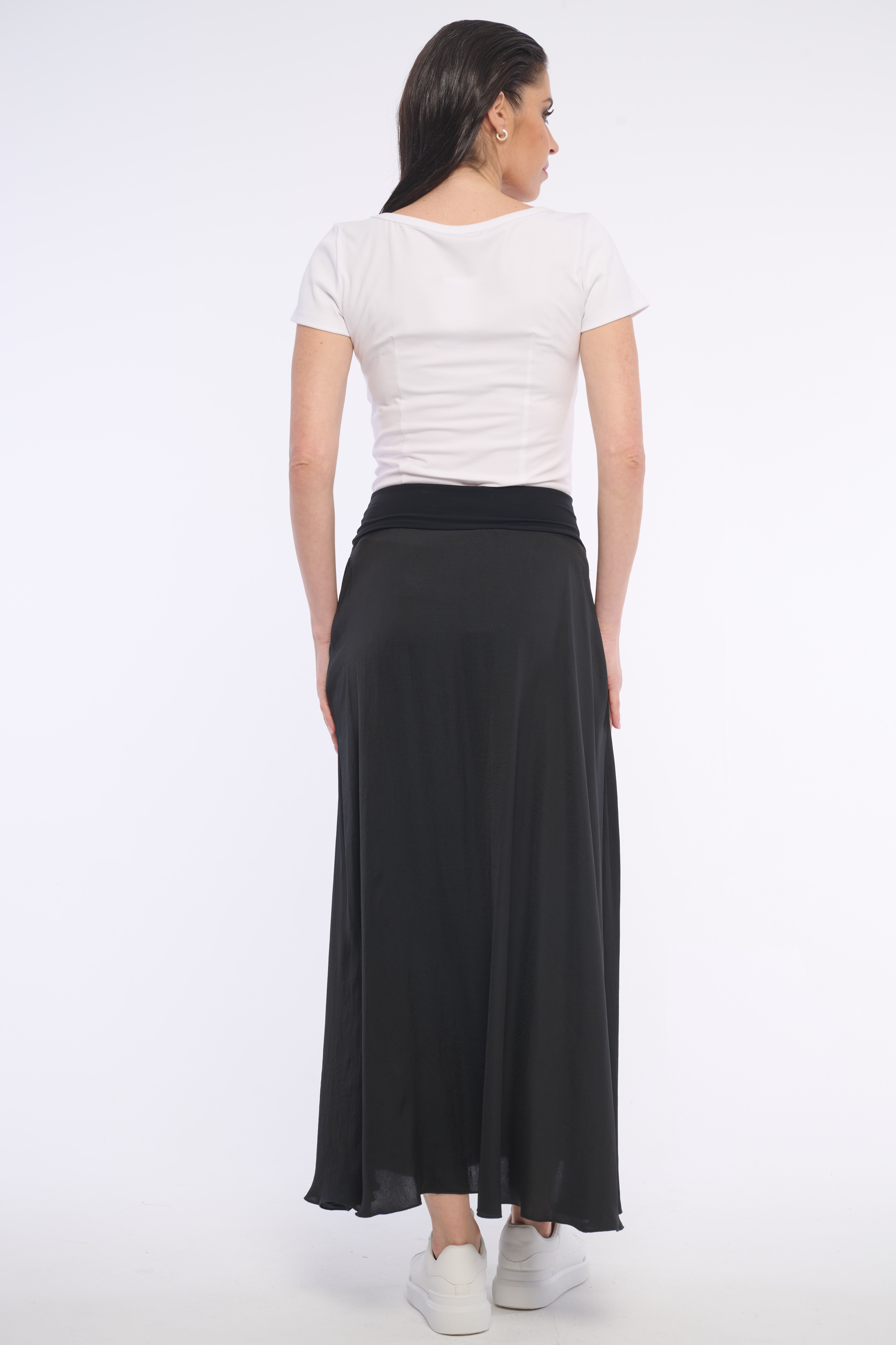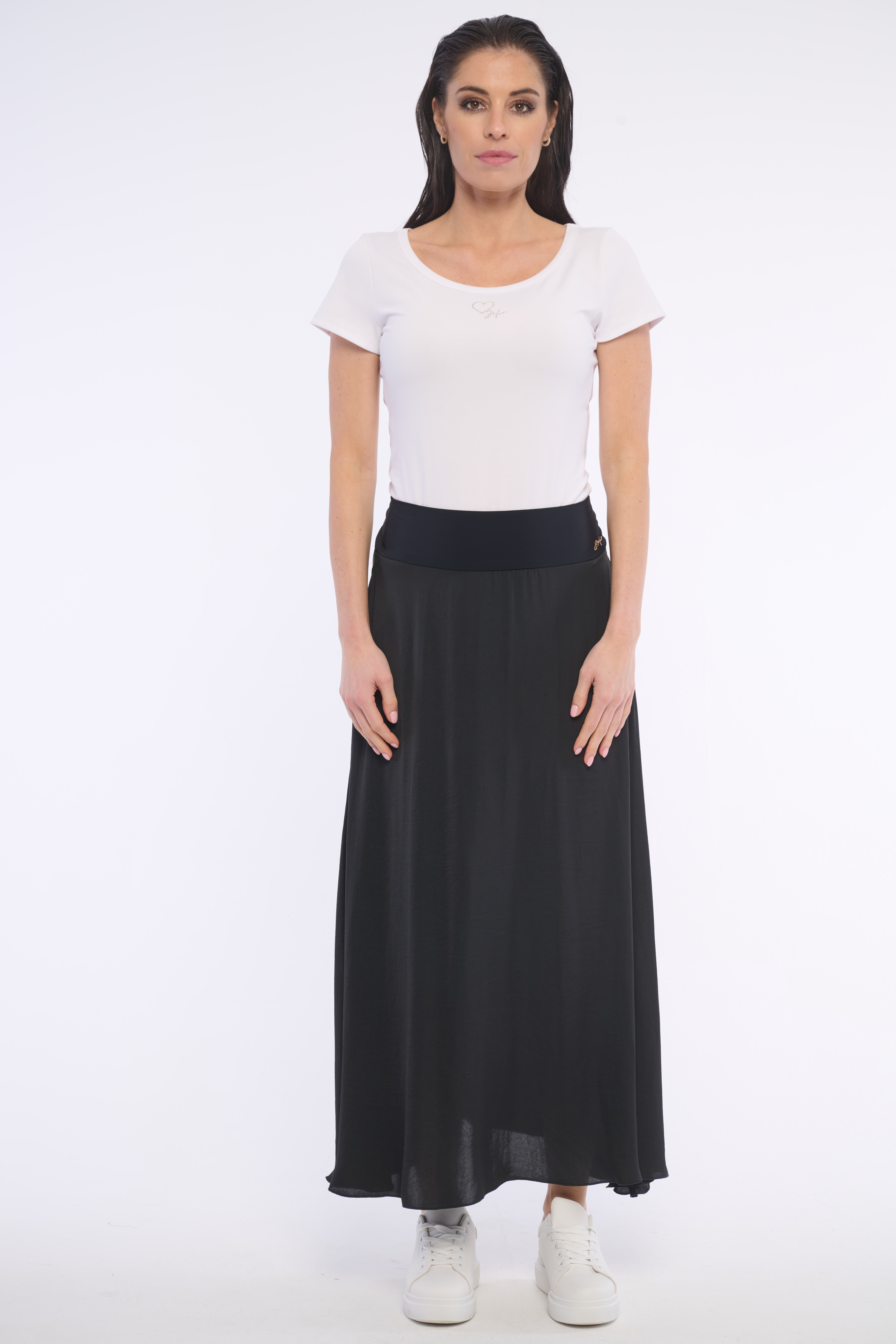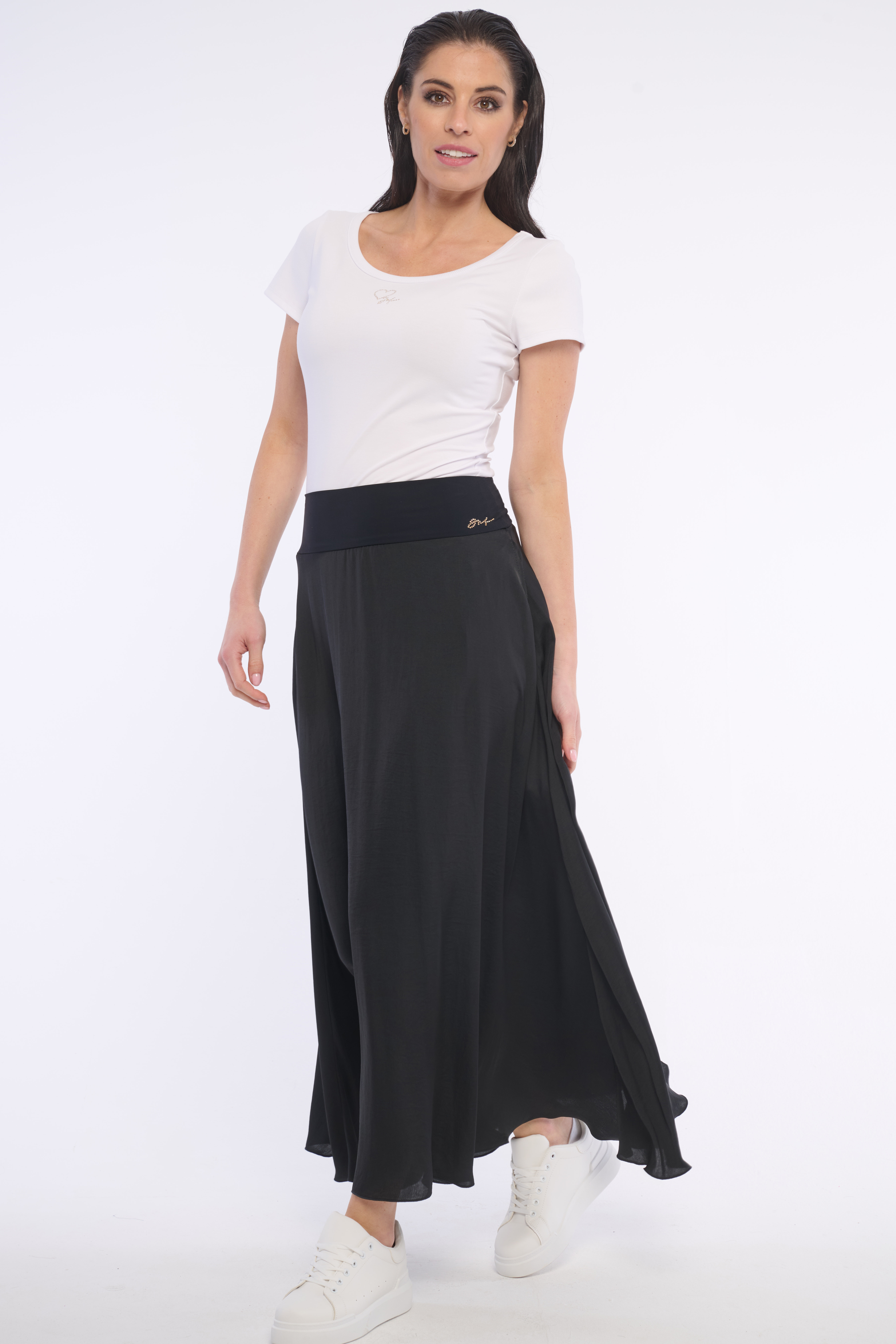 Volná sukně z lehkého materiálu s pevnější látkou v pase krásně zvýrazní pas. Detail tvoří logo na boku z luxusních krystalů Swarowski. Dostupná ve třech barevných variantách.