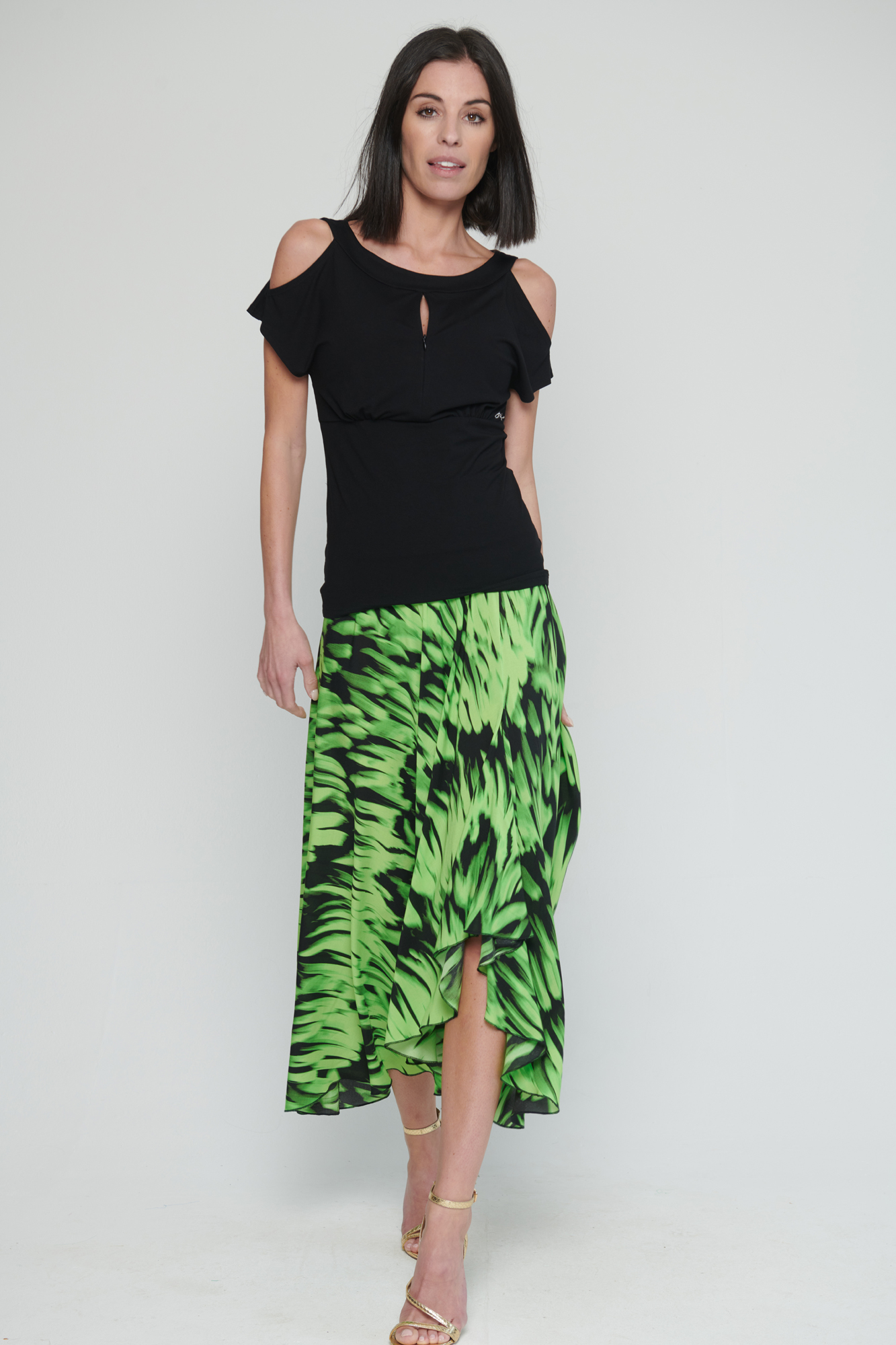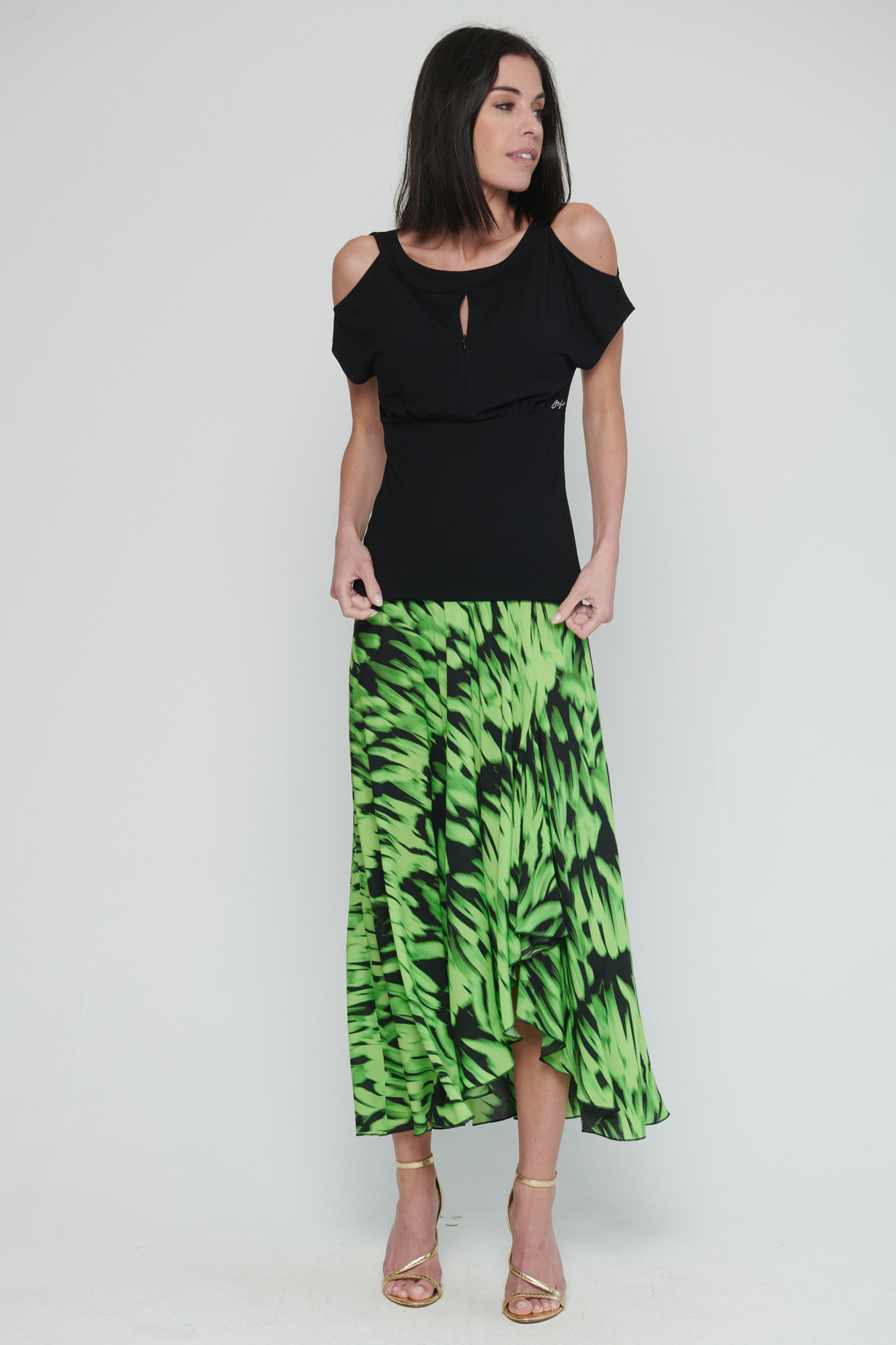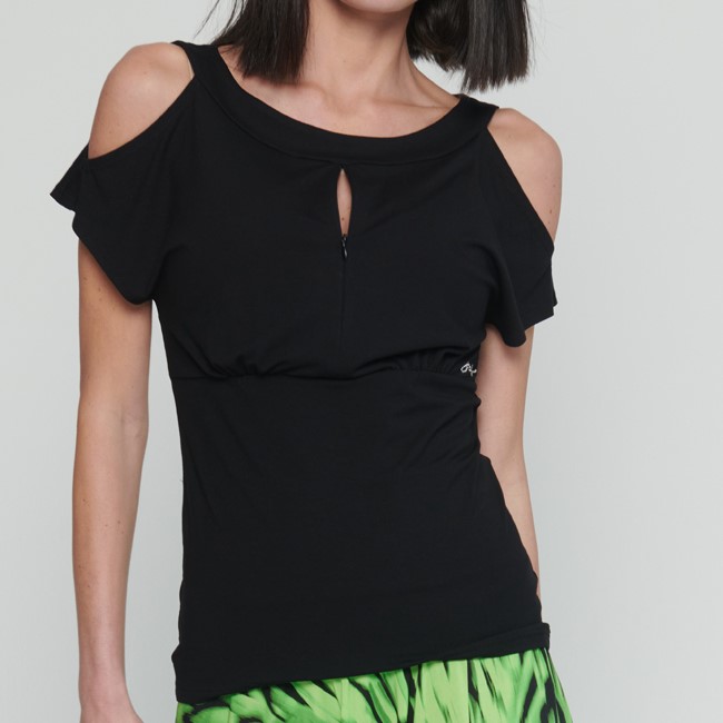 Top se zipem ve výstřihu. Průstřihy na ramenech. Malé crystal logo v pase.