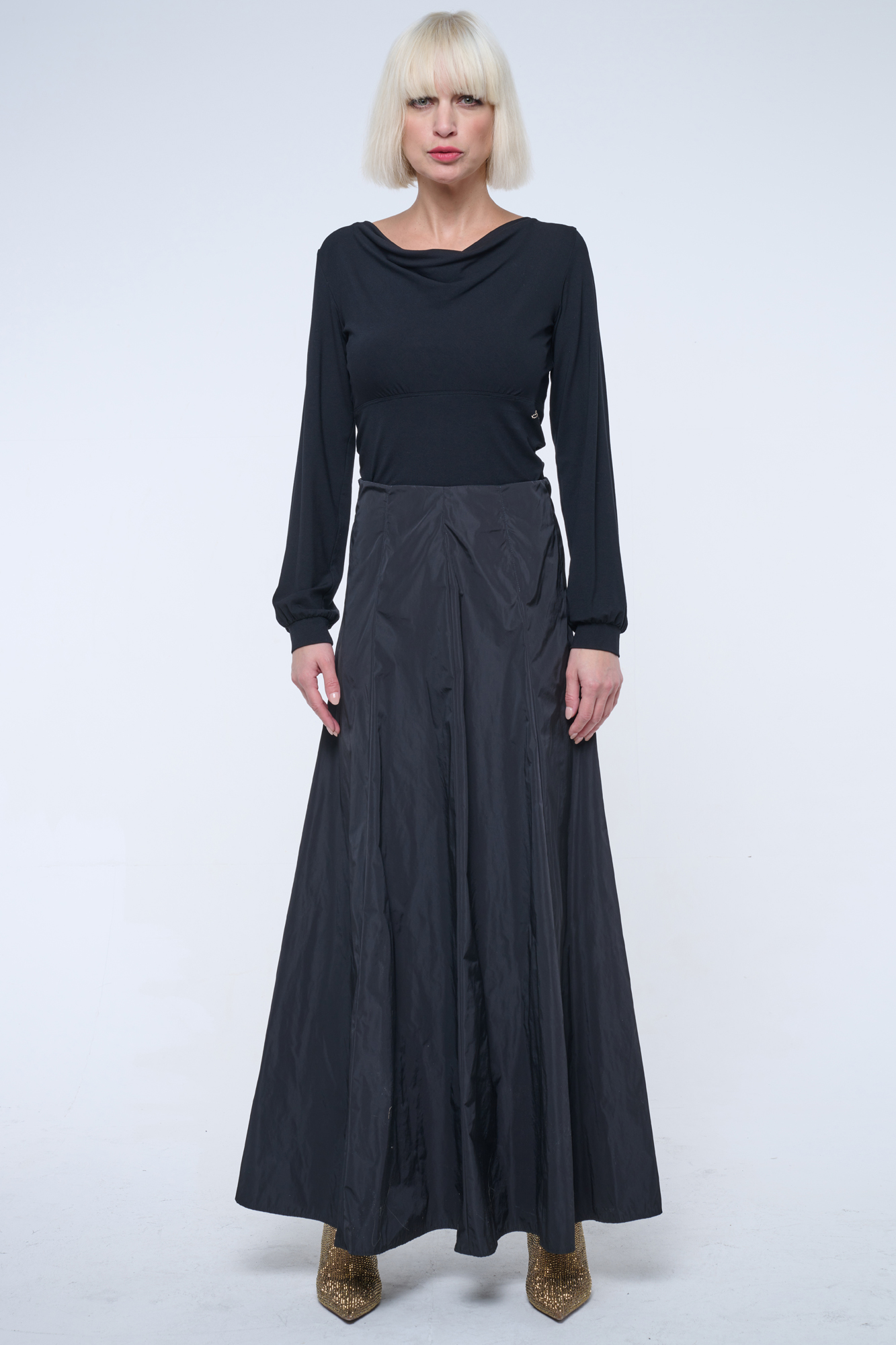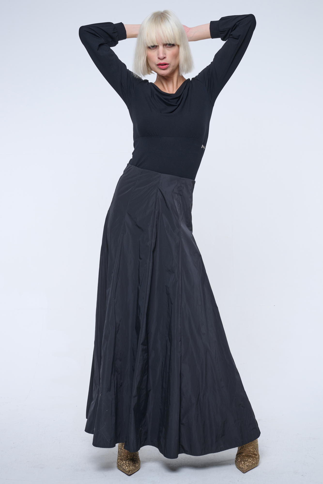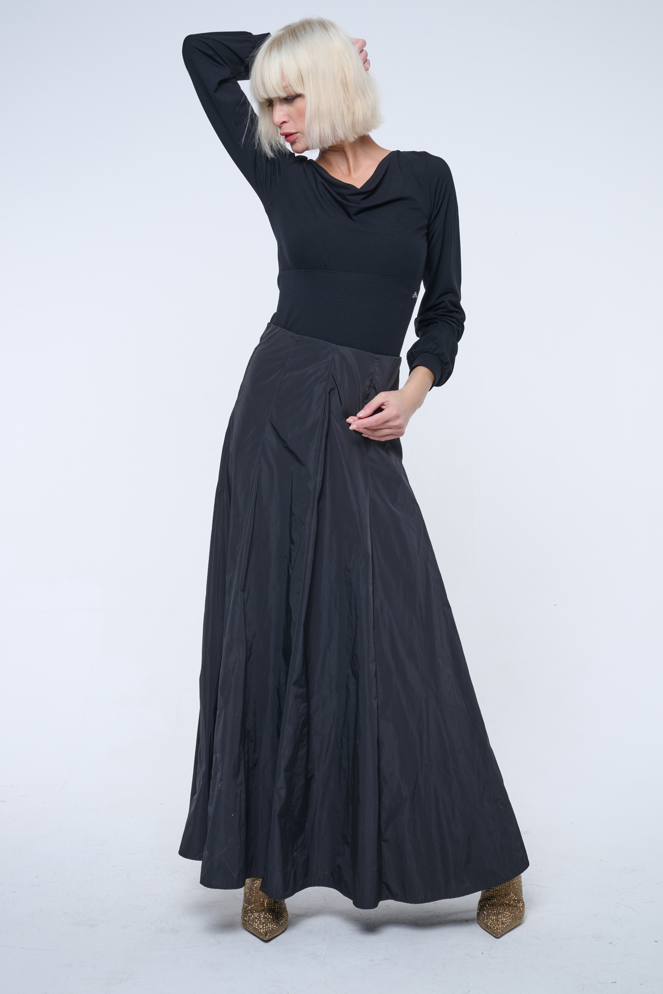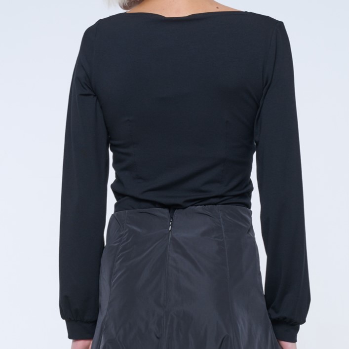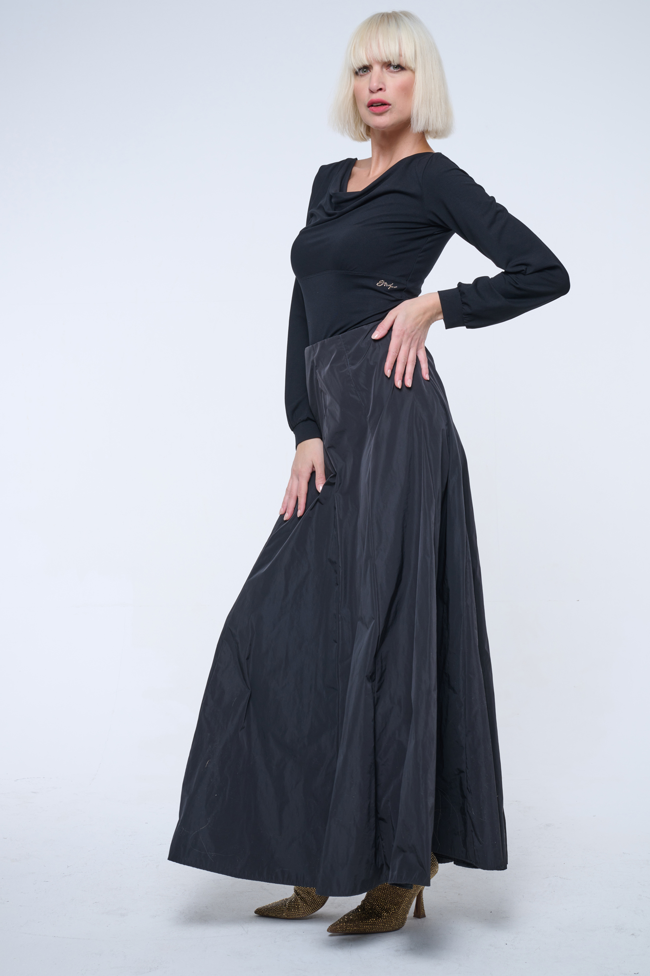 Úpletová tunika s volnými rukávy do gumičky. V pase malé krystalové zlaté logo INF.