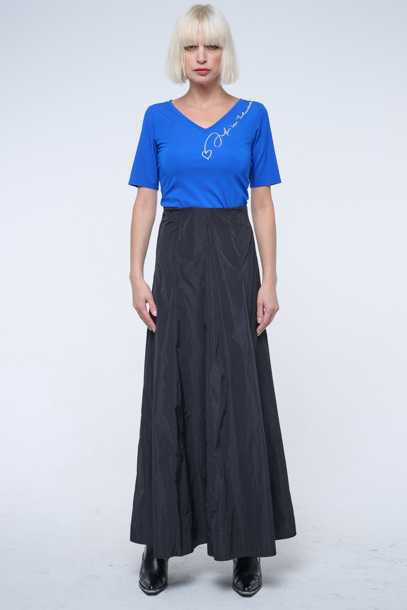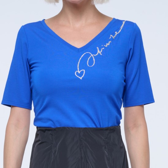 Basic triko s výstřihem do véčka. Černý lesklý tisk ve výstřihu. Glitrový tisk Infinite ve výstřihu.