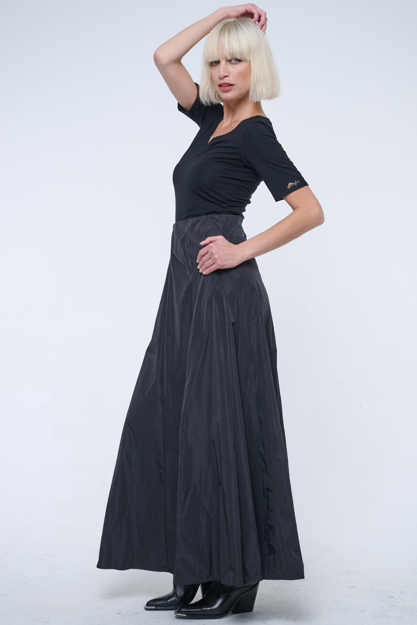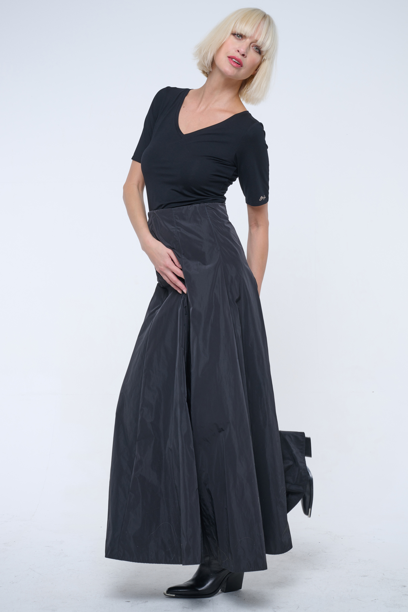 Basic triko s výstřihem do véčka. Malé zlaté crystalové logo INF na rukávu.