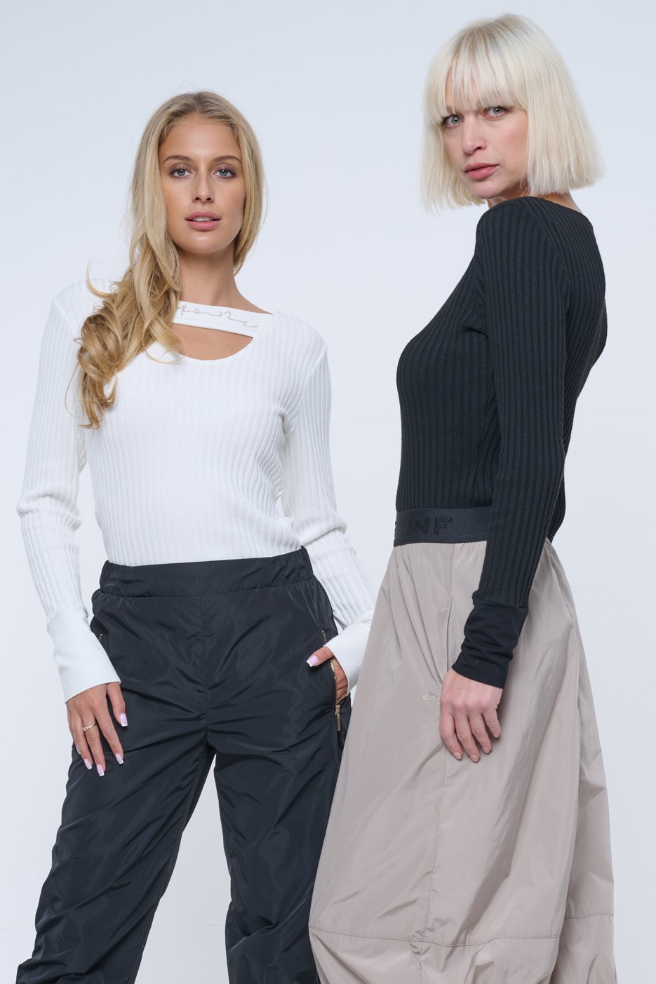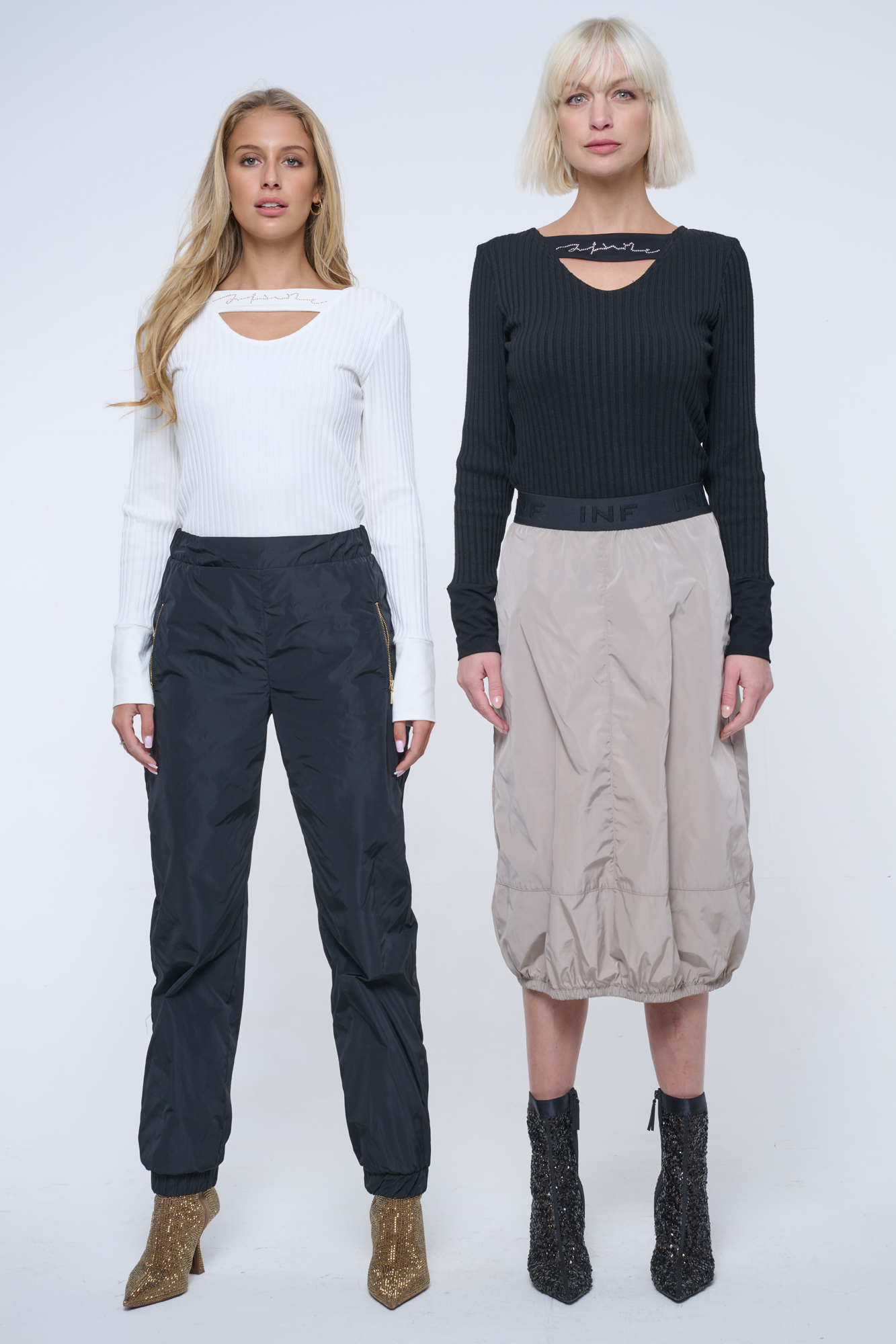 Úpletový svetřík. Ve výstřihu zlaté krystalové logo Infinite.