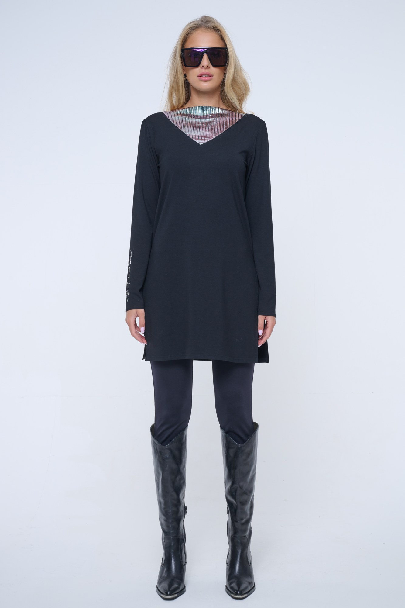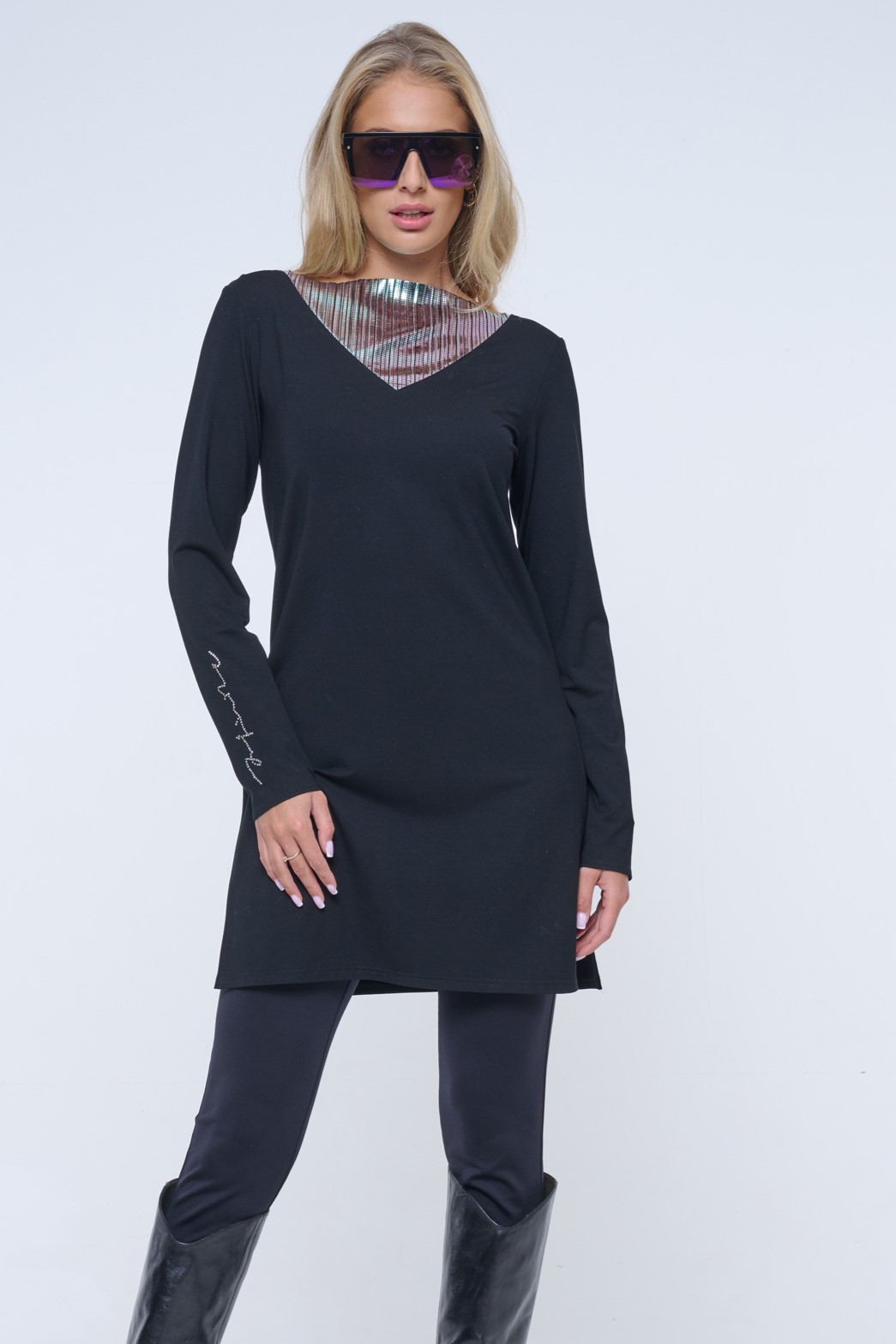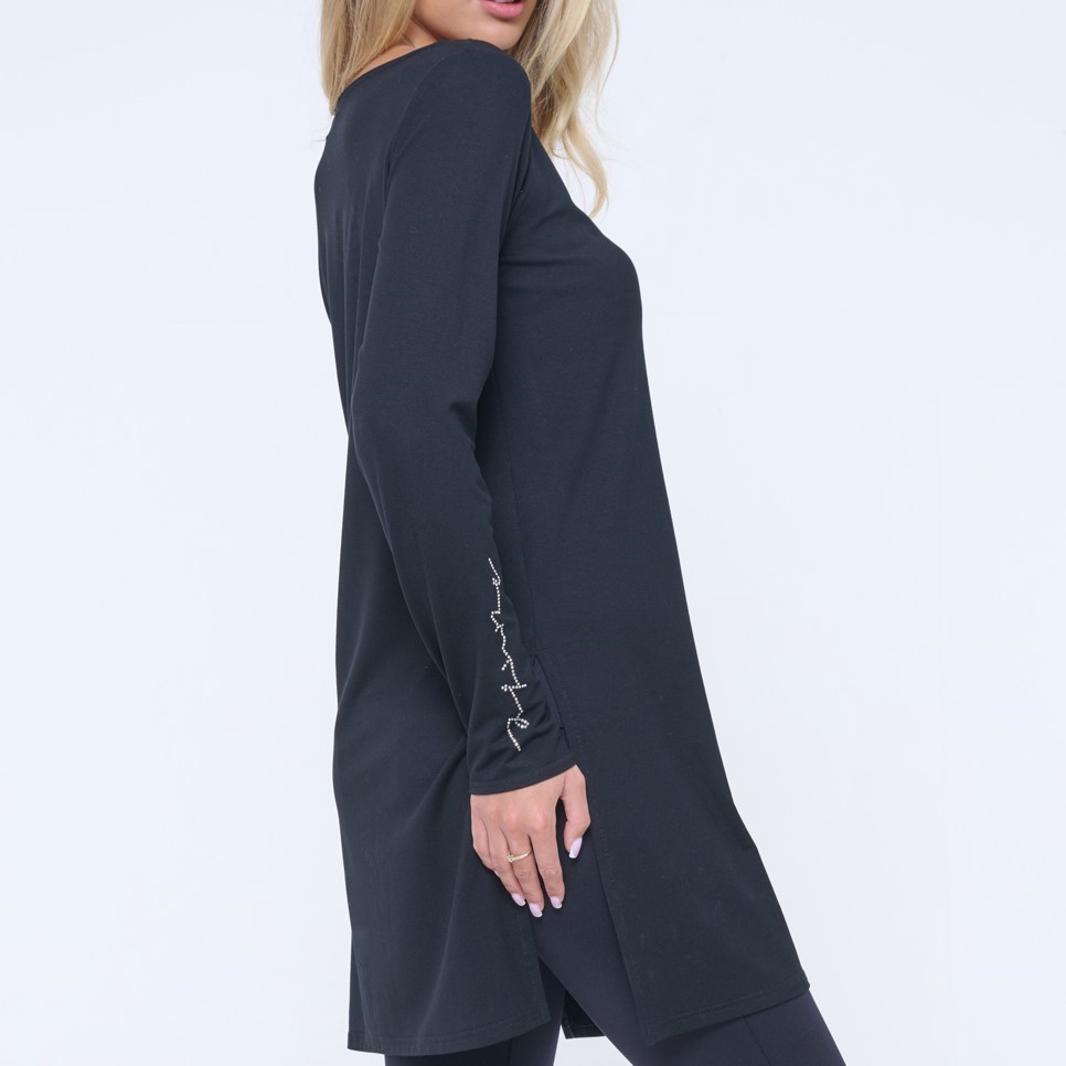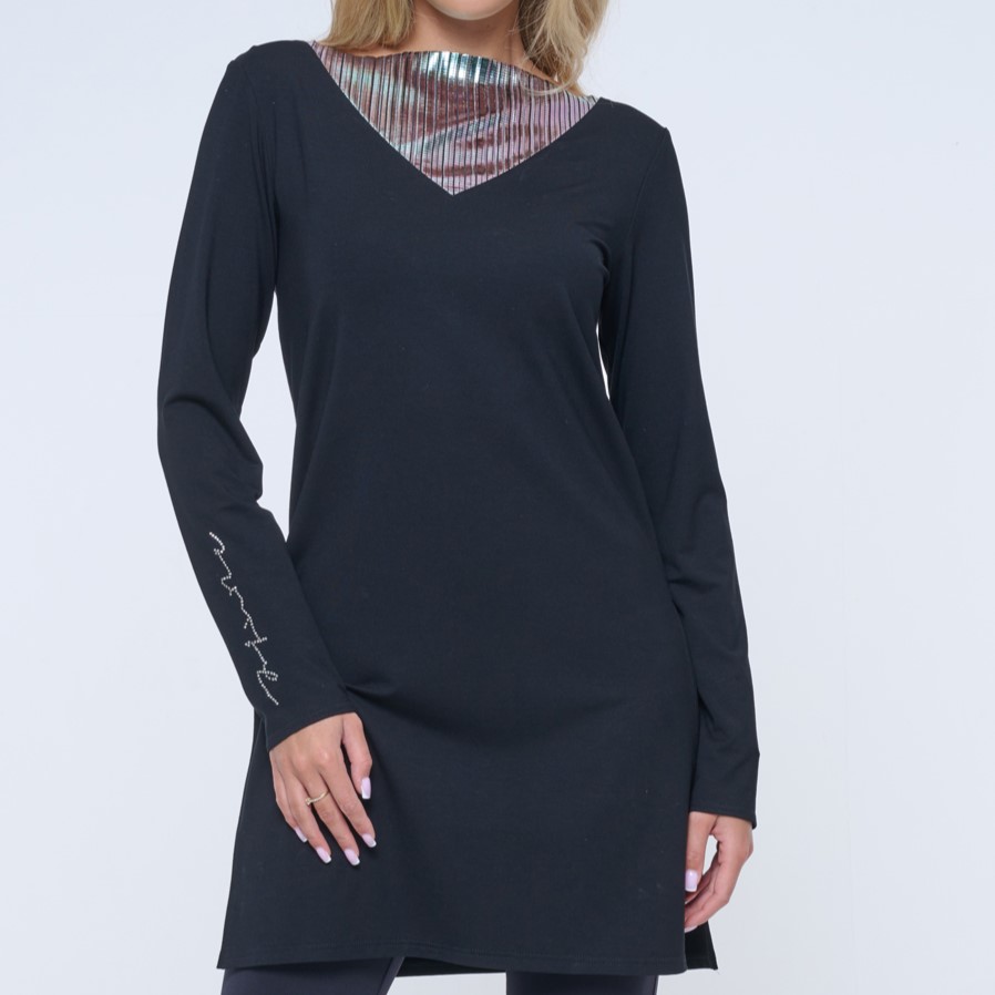 Delší tunika s rozparky v bocích. Ve výstřihu efektní lesklý materiál. Na pravém rukávu crystalové logo INFINITE.
