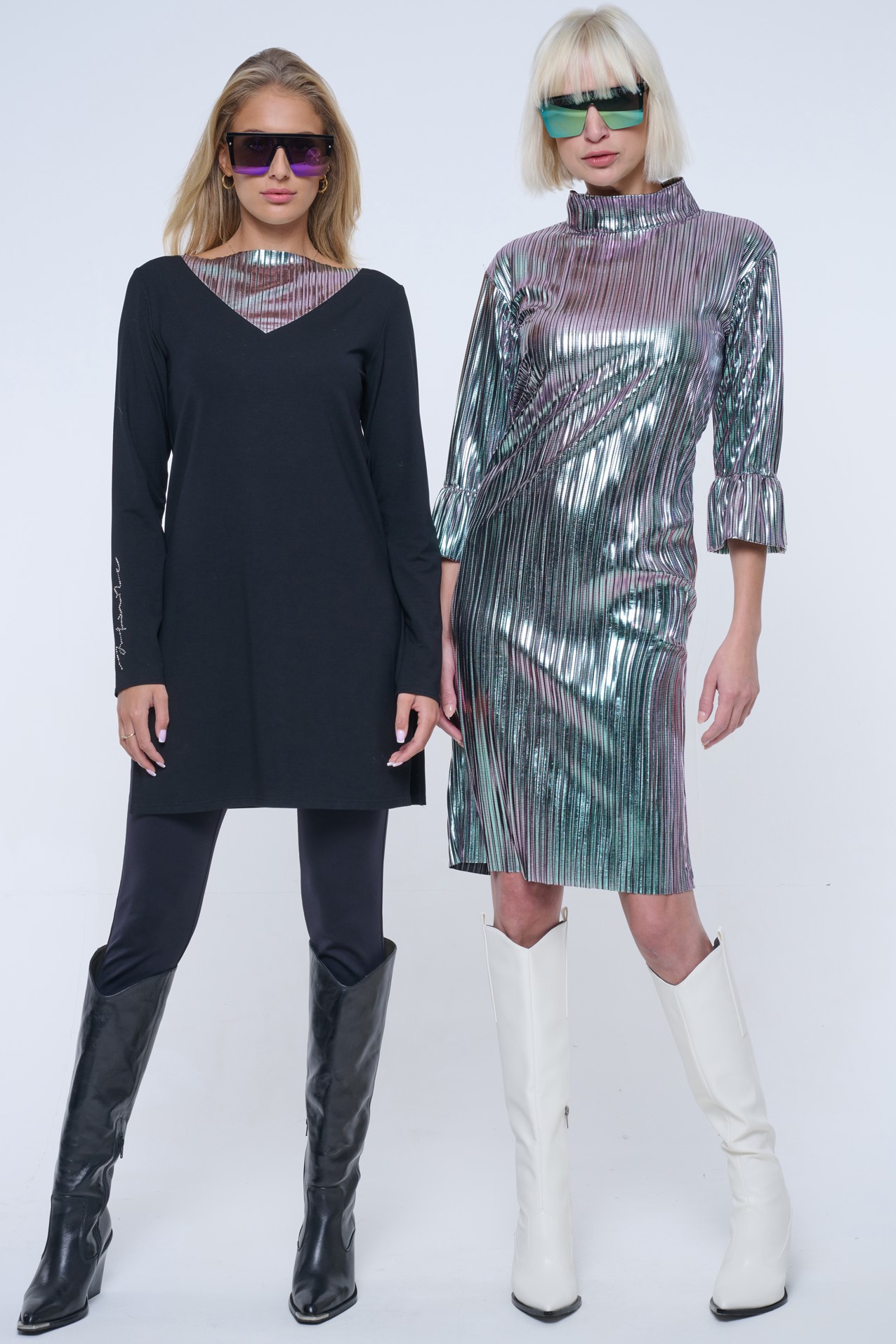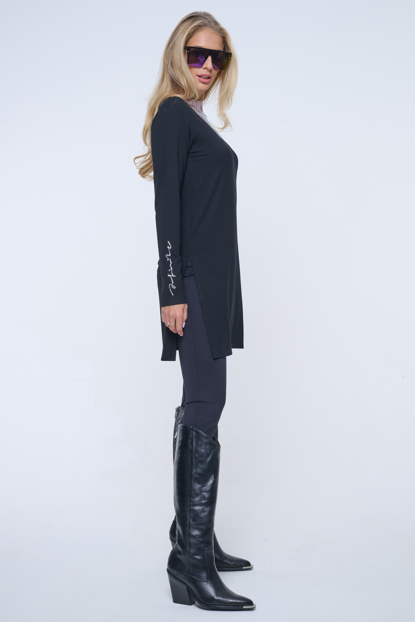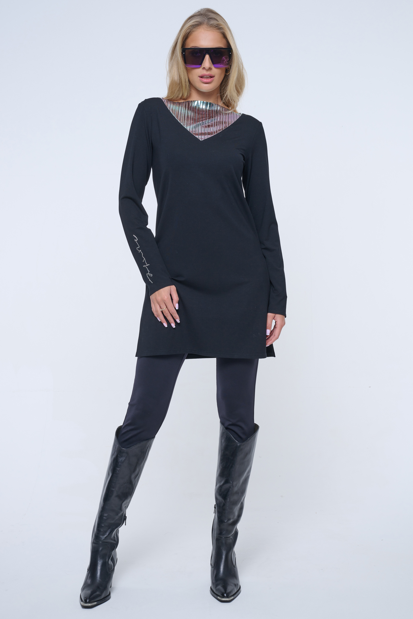 Delší tunika s rozparky v bocích. Ve výstřihu efektní lesklý materiál. Na pravém rukávu crystalové logo INFINITE.