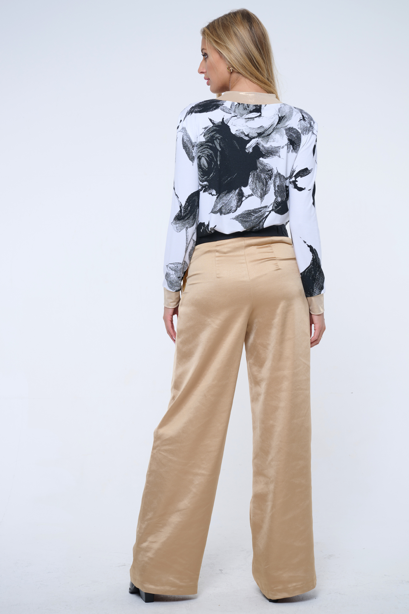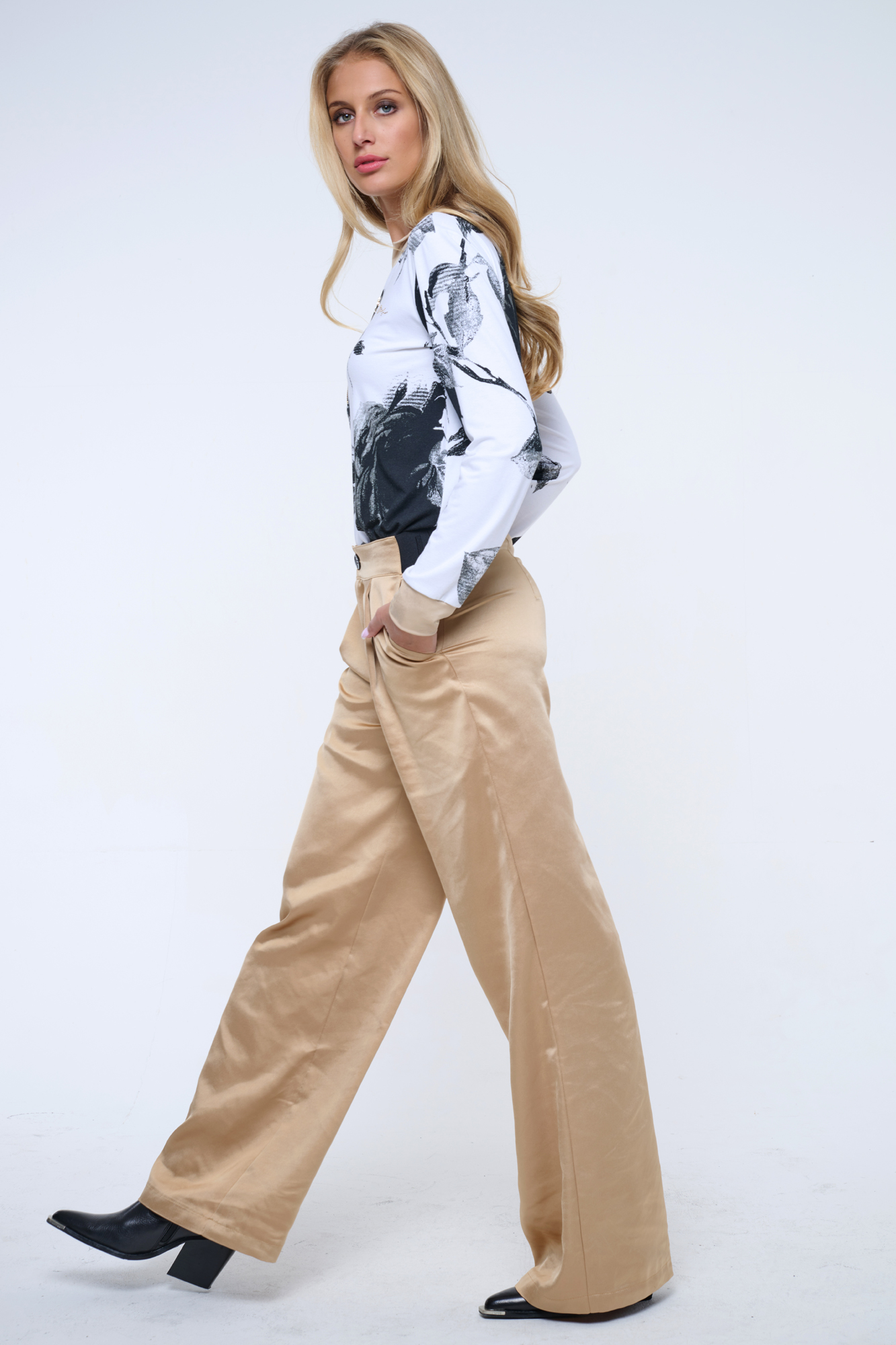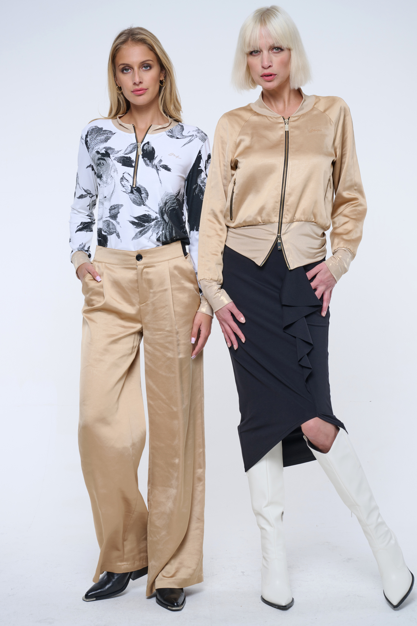 Tričko volnějšího mikinového střihu. V kombinaci s béžovozlatým materiálem. Na předním díle malé zlaté krystalové logo INF.