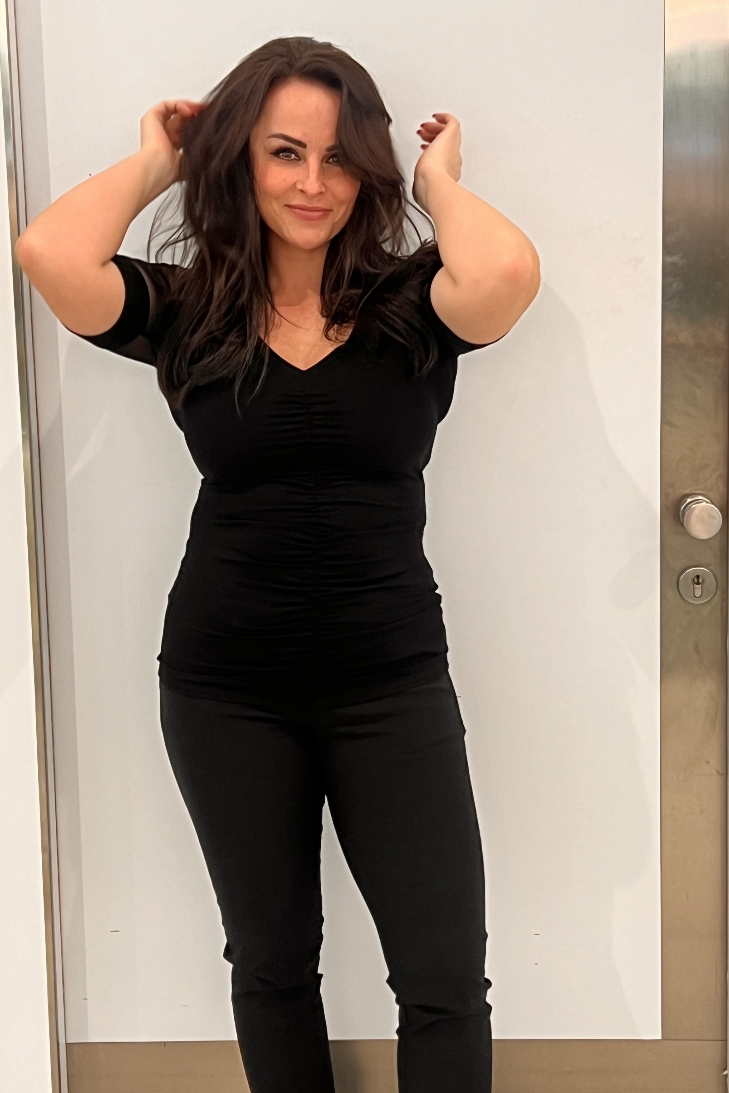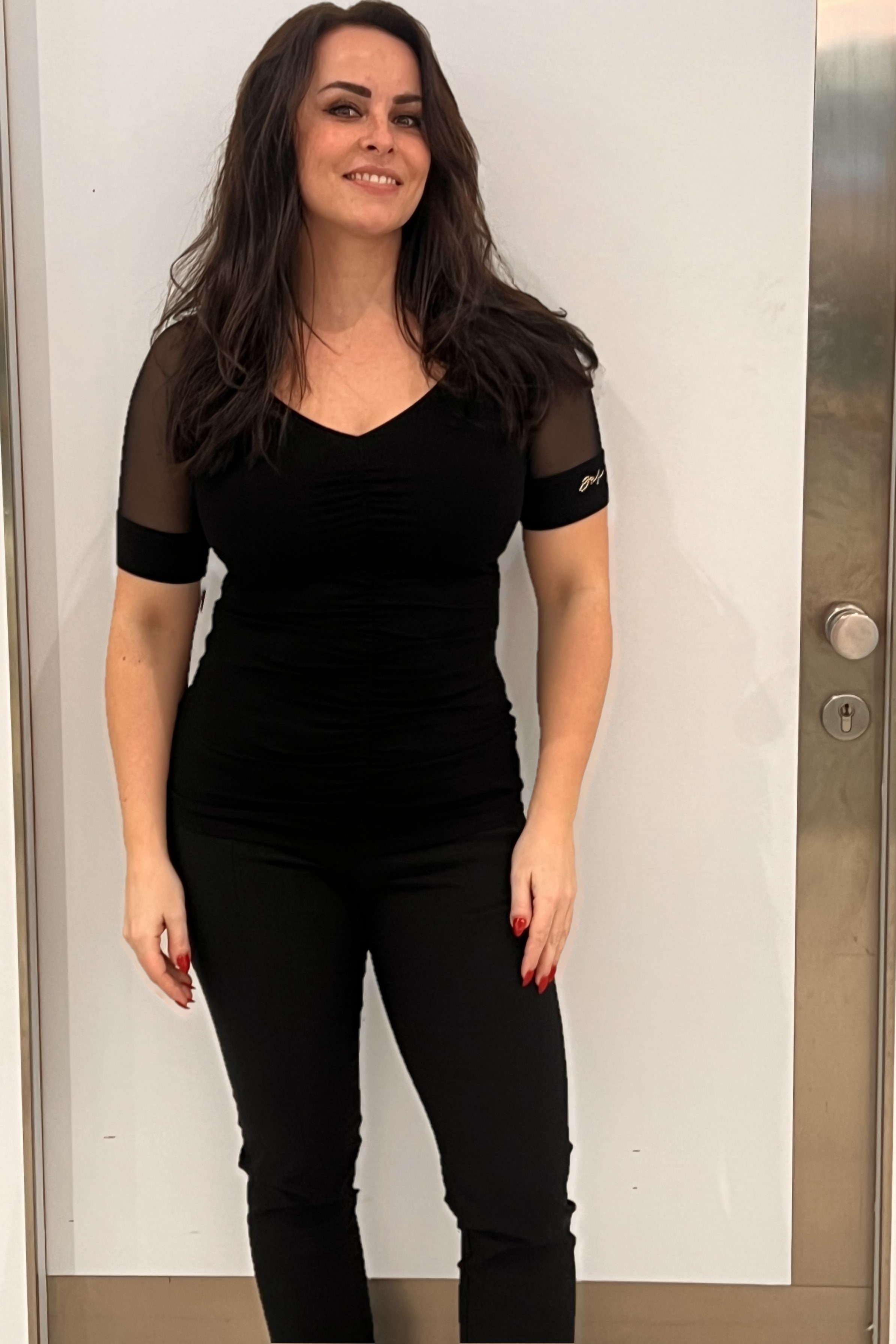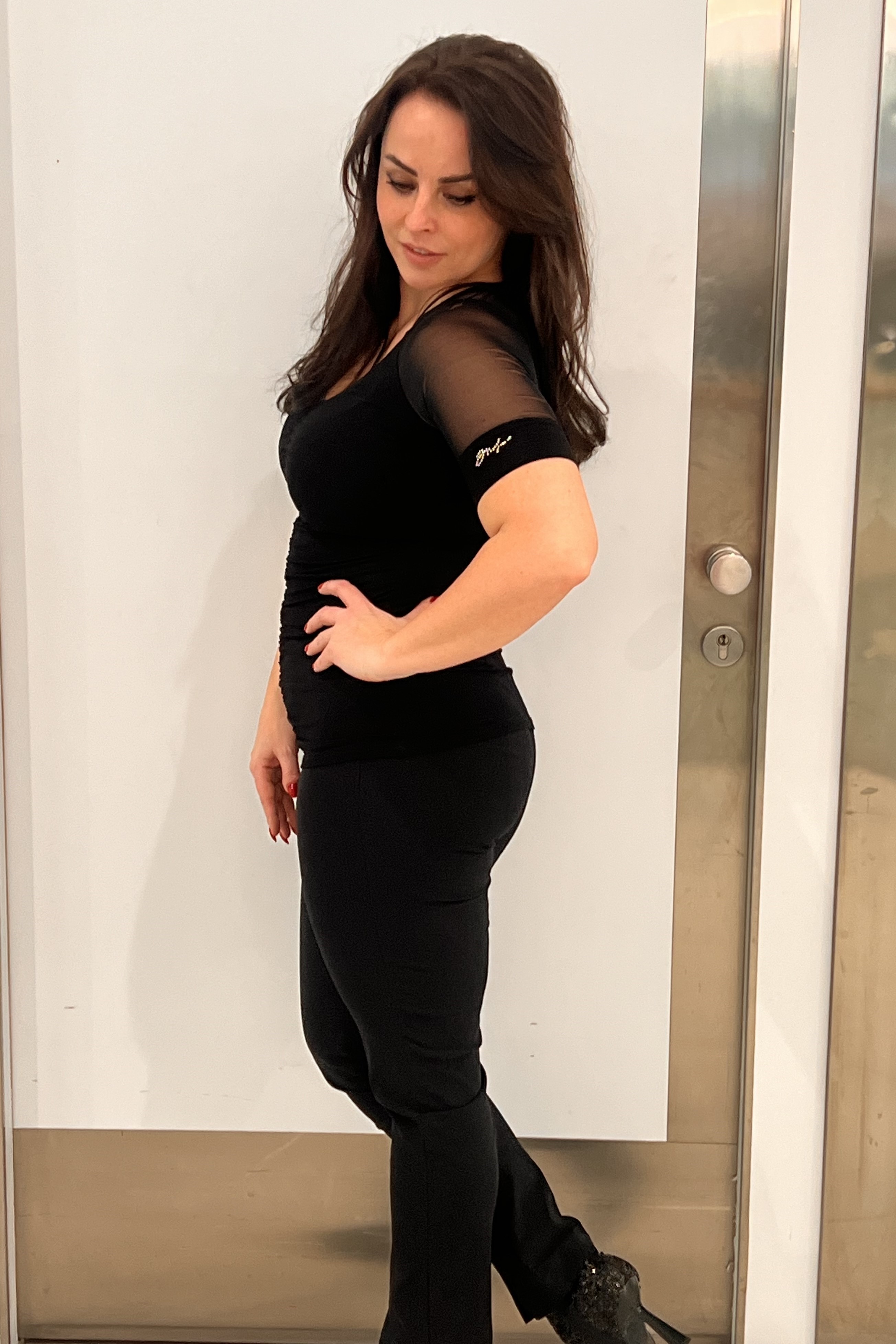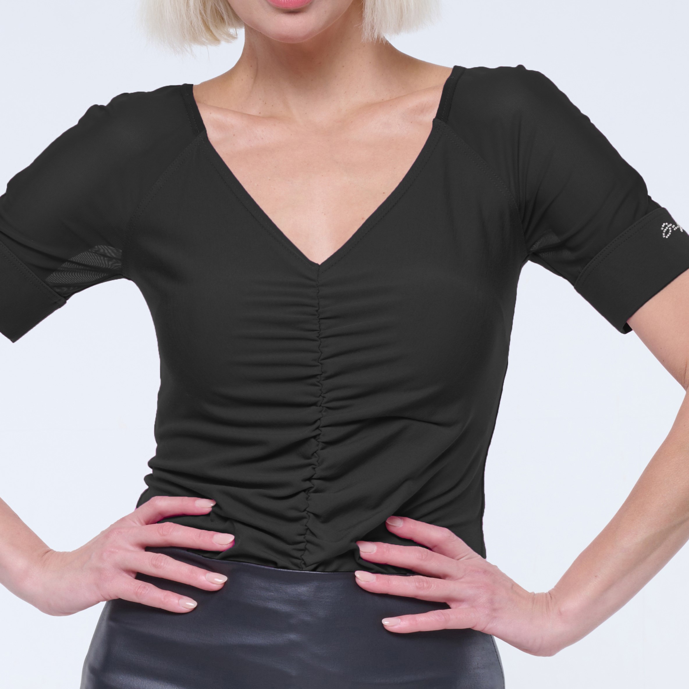Tričko s výstřihem do V. V kombinaci se strečovým tylem. Na rukávu malé zlaté krystalové logo INF. Řaseni na předním díle.