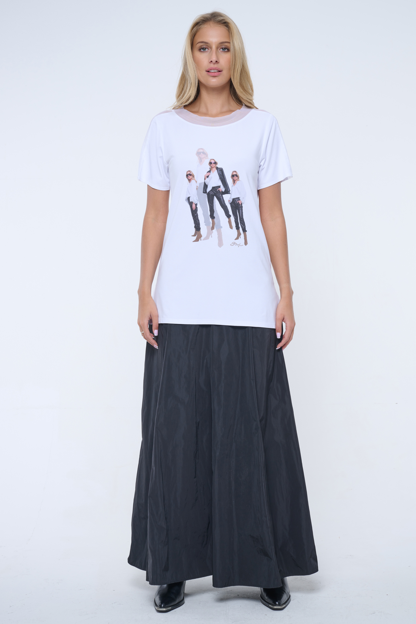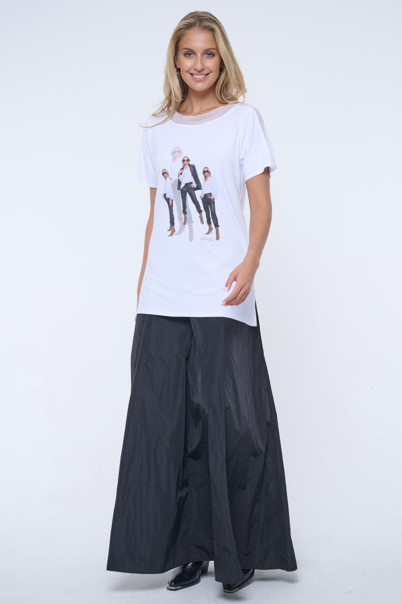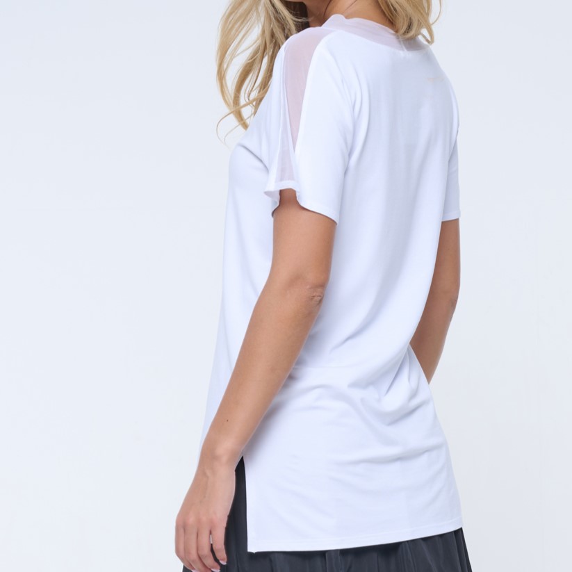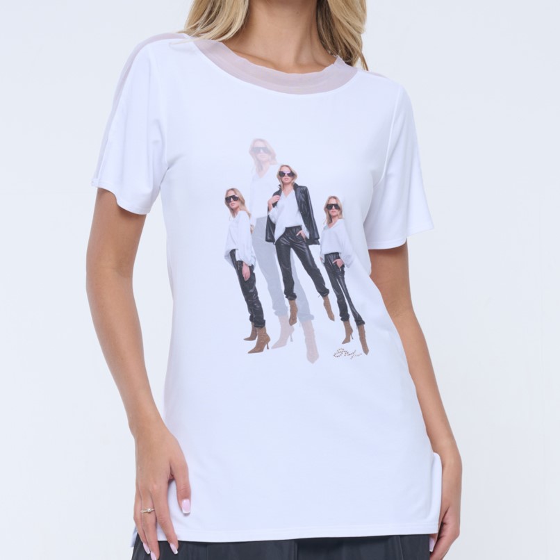 Volné tričko s tylovým lampasem. Na předním díle tisk, krystalové zlaté logo INF.