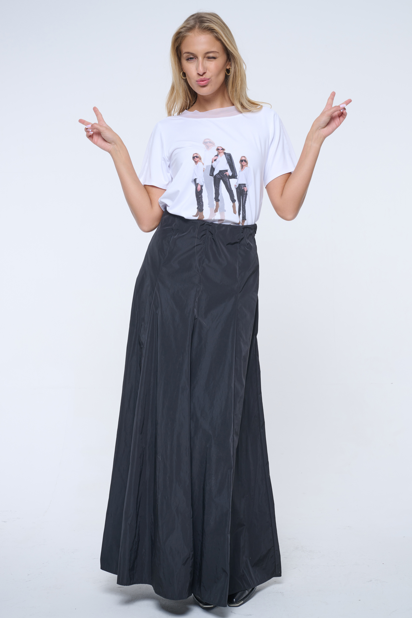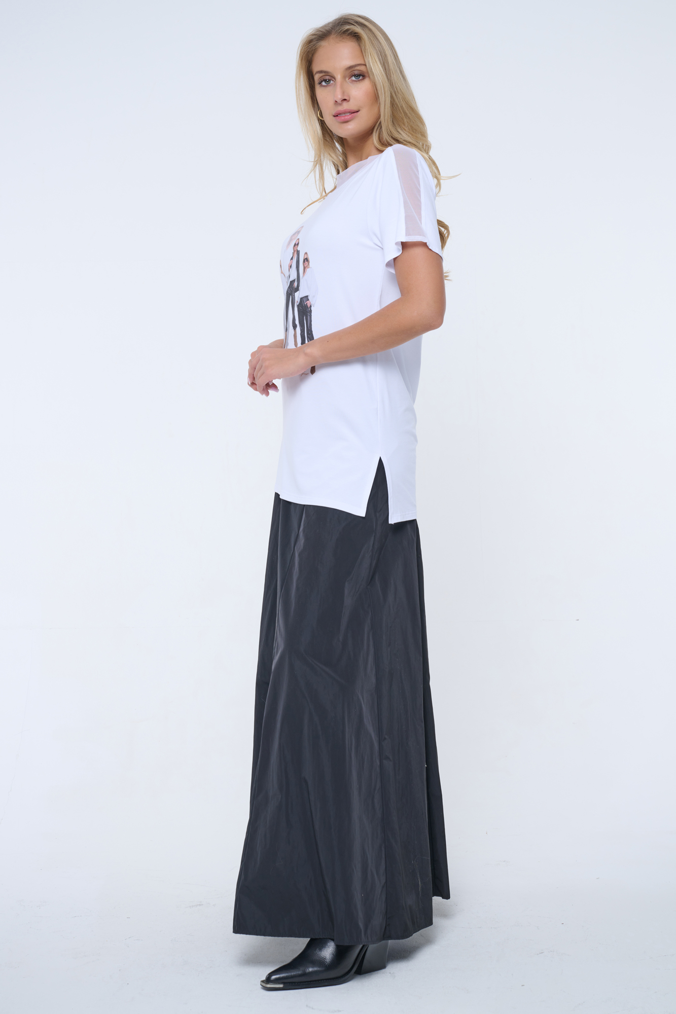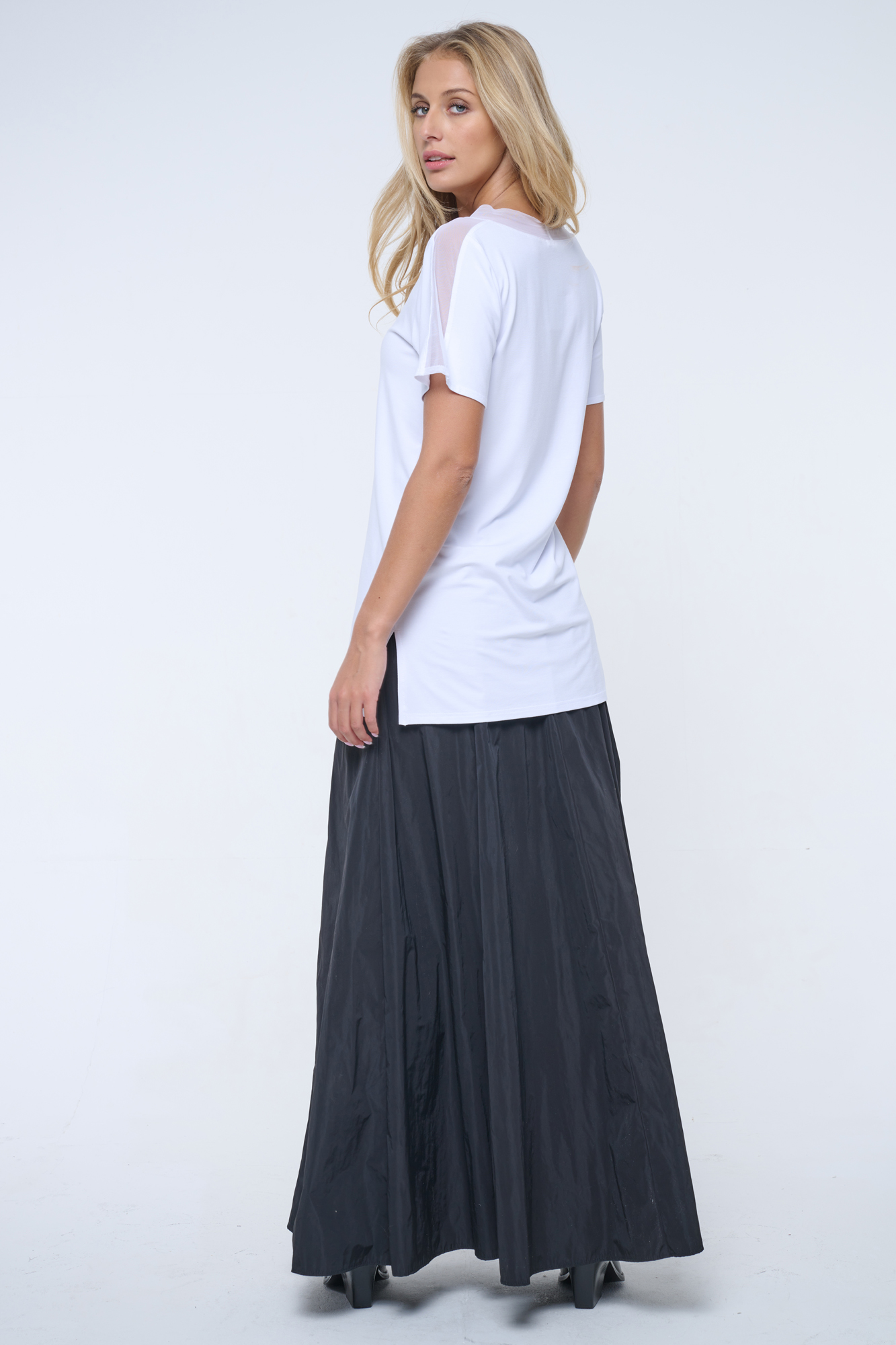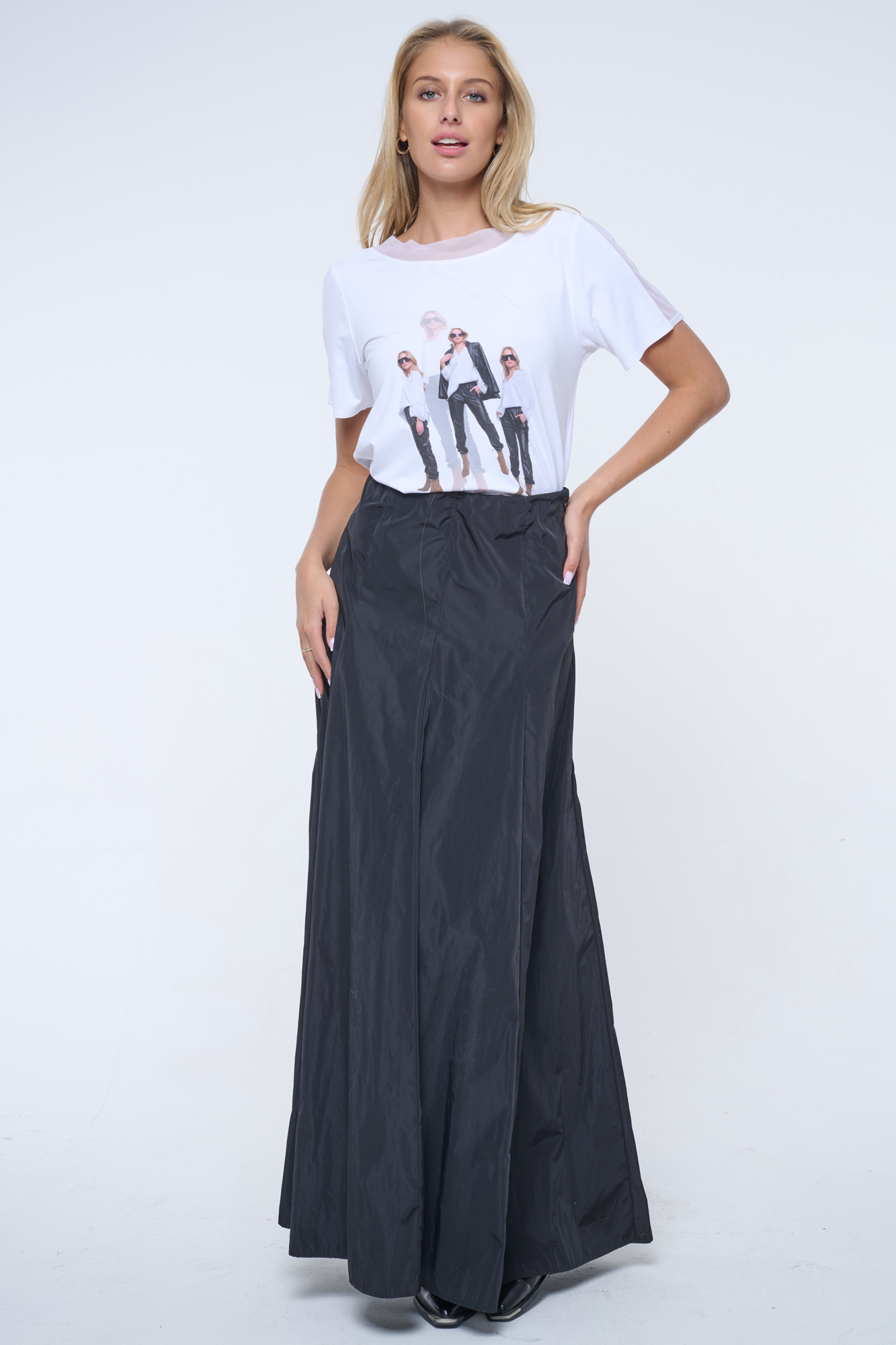 Volné tričko s tylovým lampasem. Na předním díle tisk, krystalové zlaté logo INF.