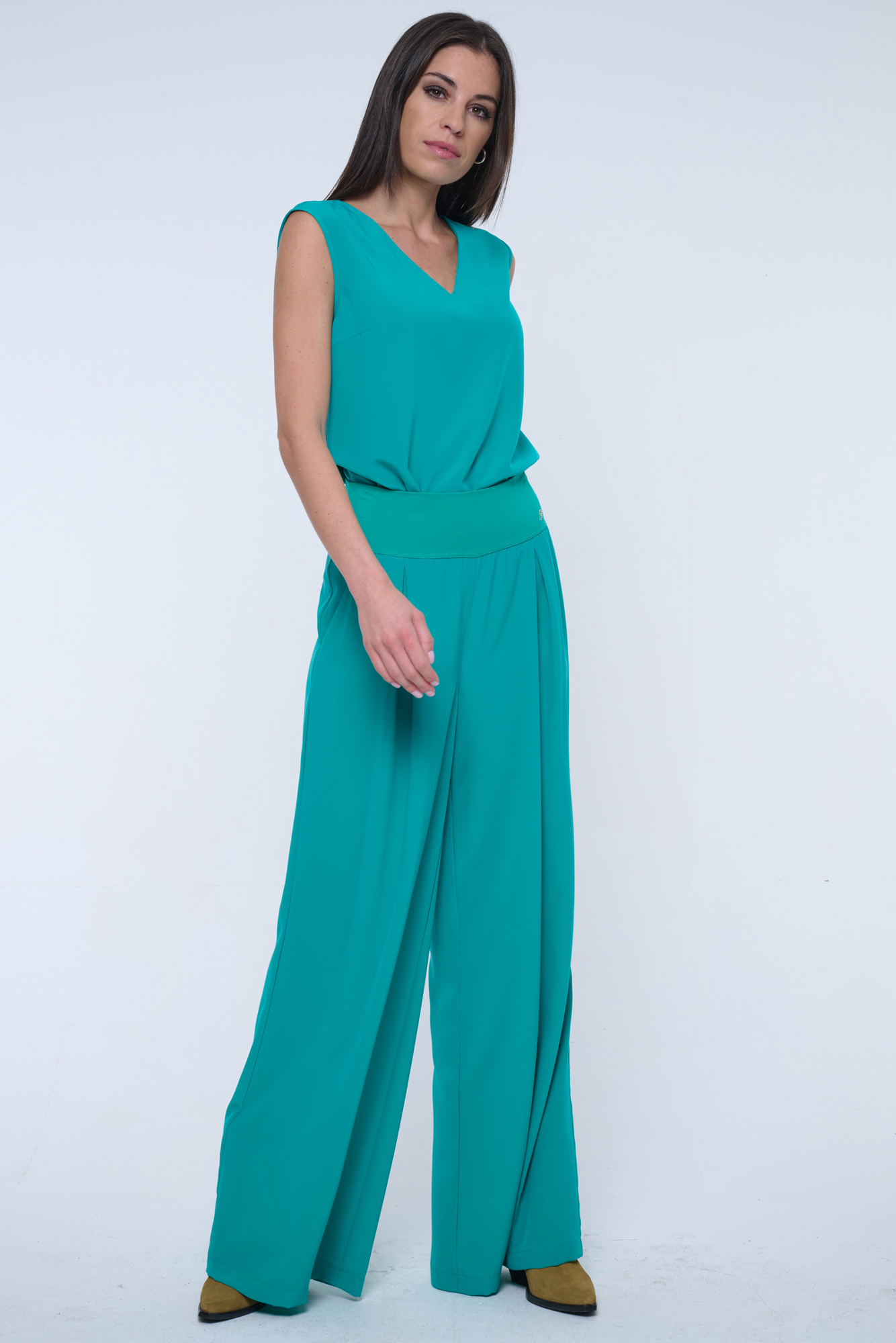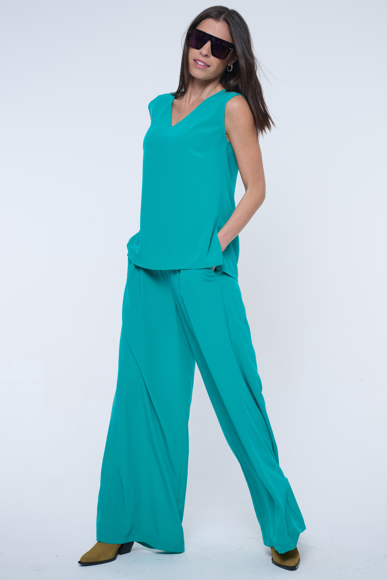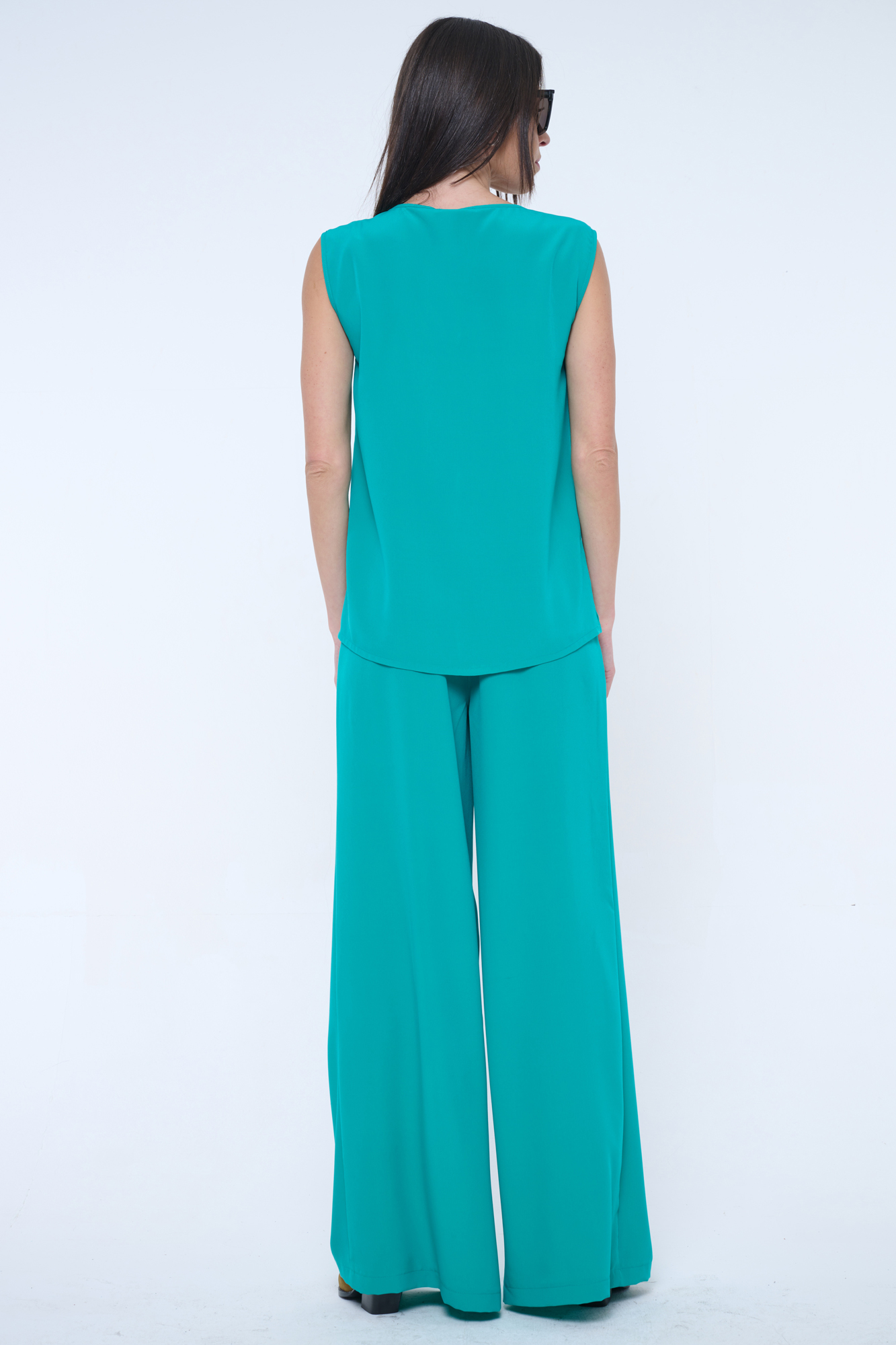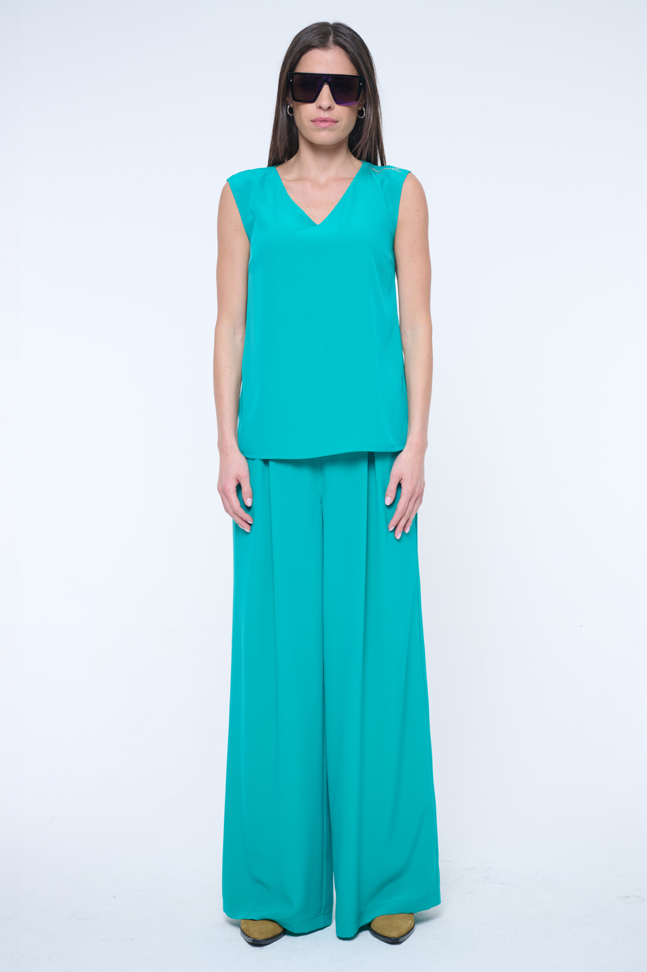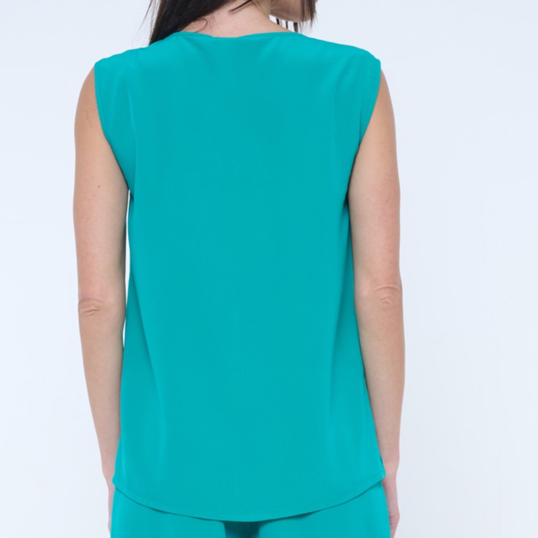 Volná halenka bez rukávů vhodná na společenské události. Skvělé do kompletu se širokými kalhotami art.442-746B. Na rameni krystalové logo INF.
