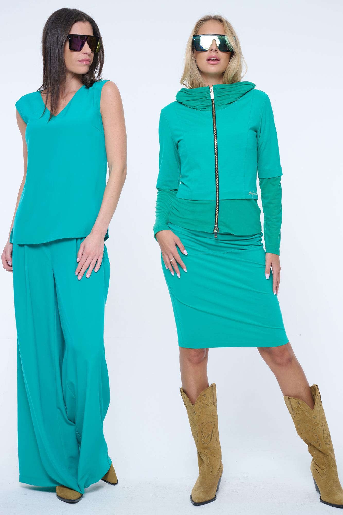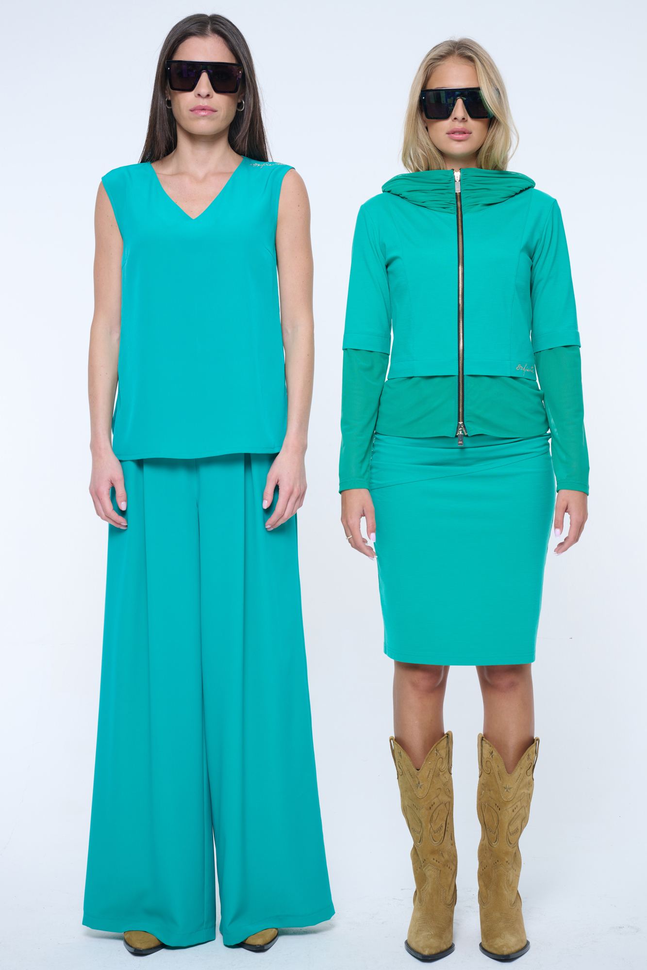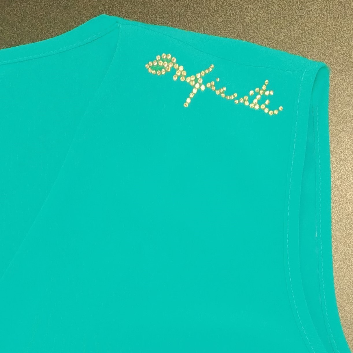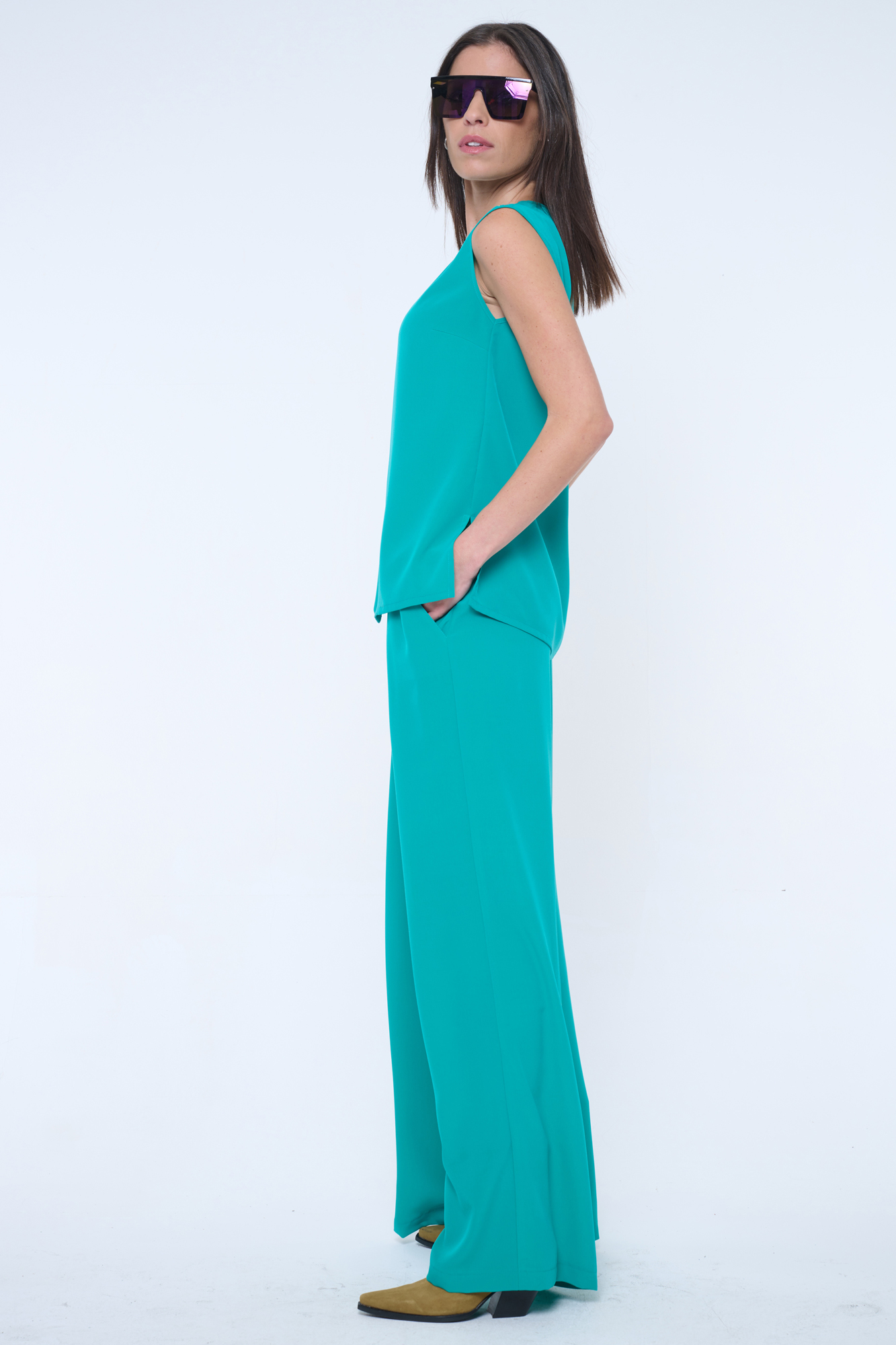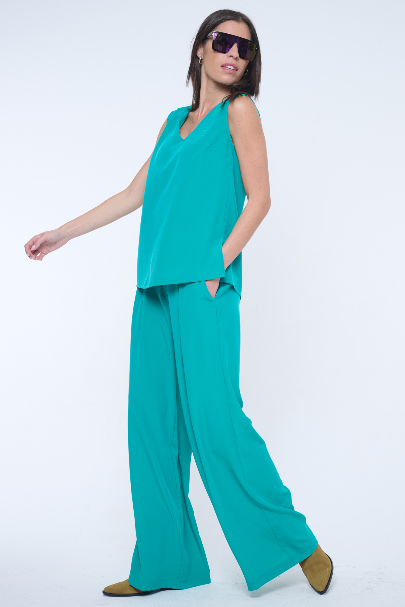 Volná halenka bez rukávů vhodná na společenské události. Skvělé do kompletu se širokými kalhotami art.442-746B. Na rameni krystalové logo INF.