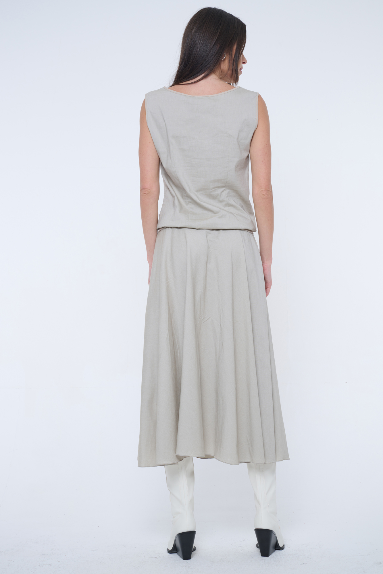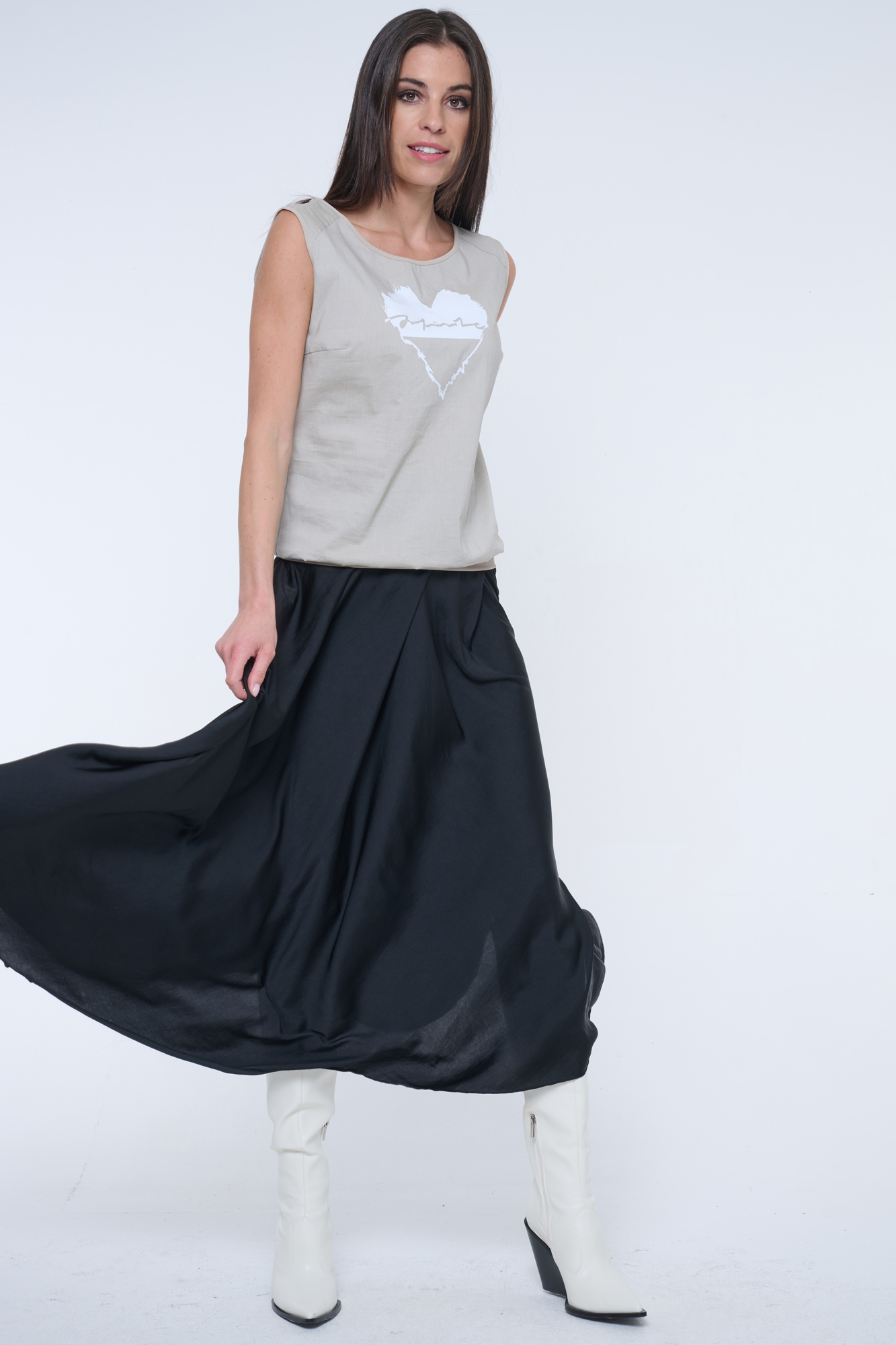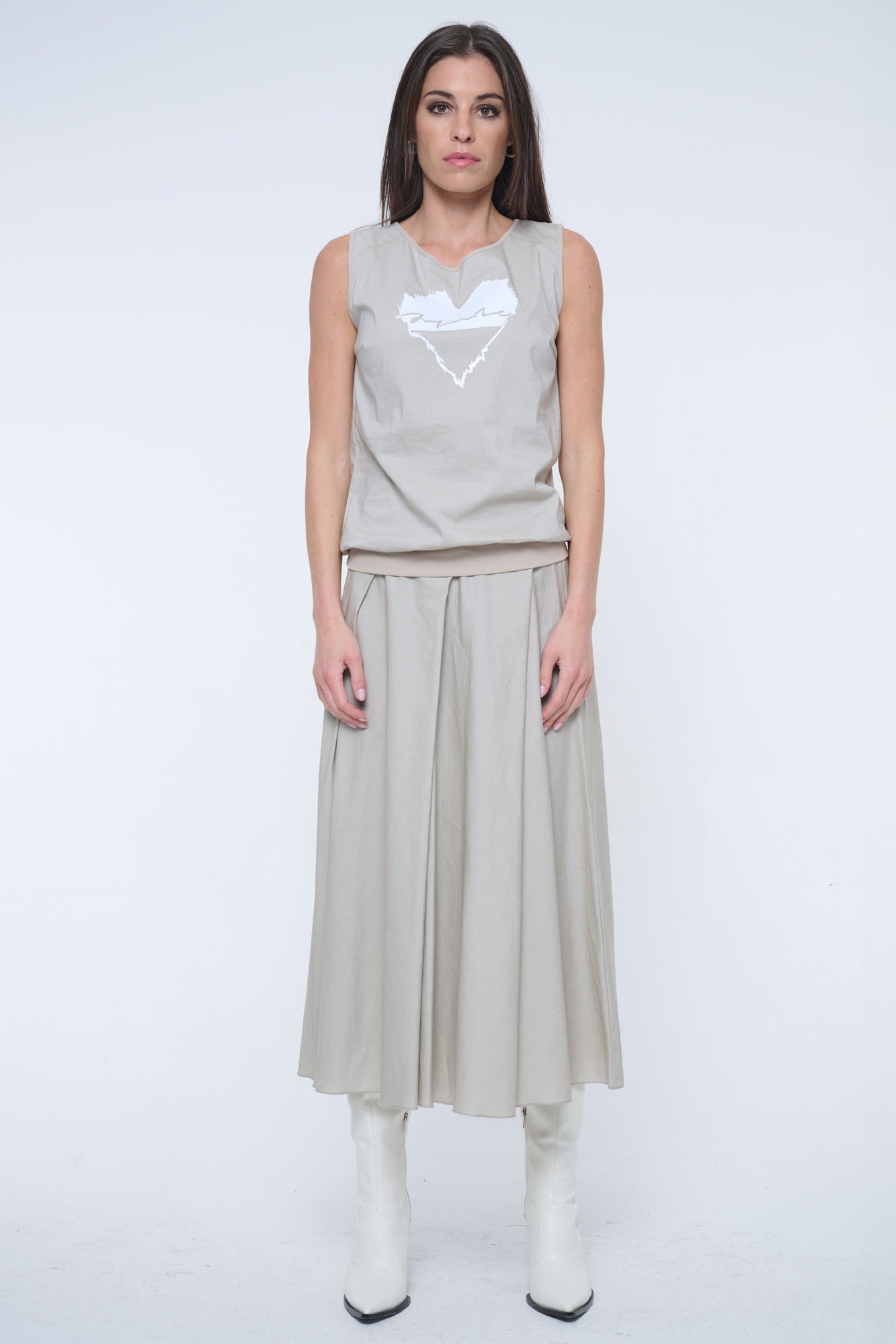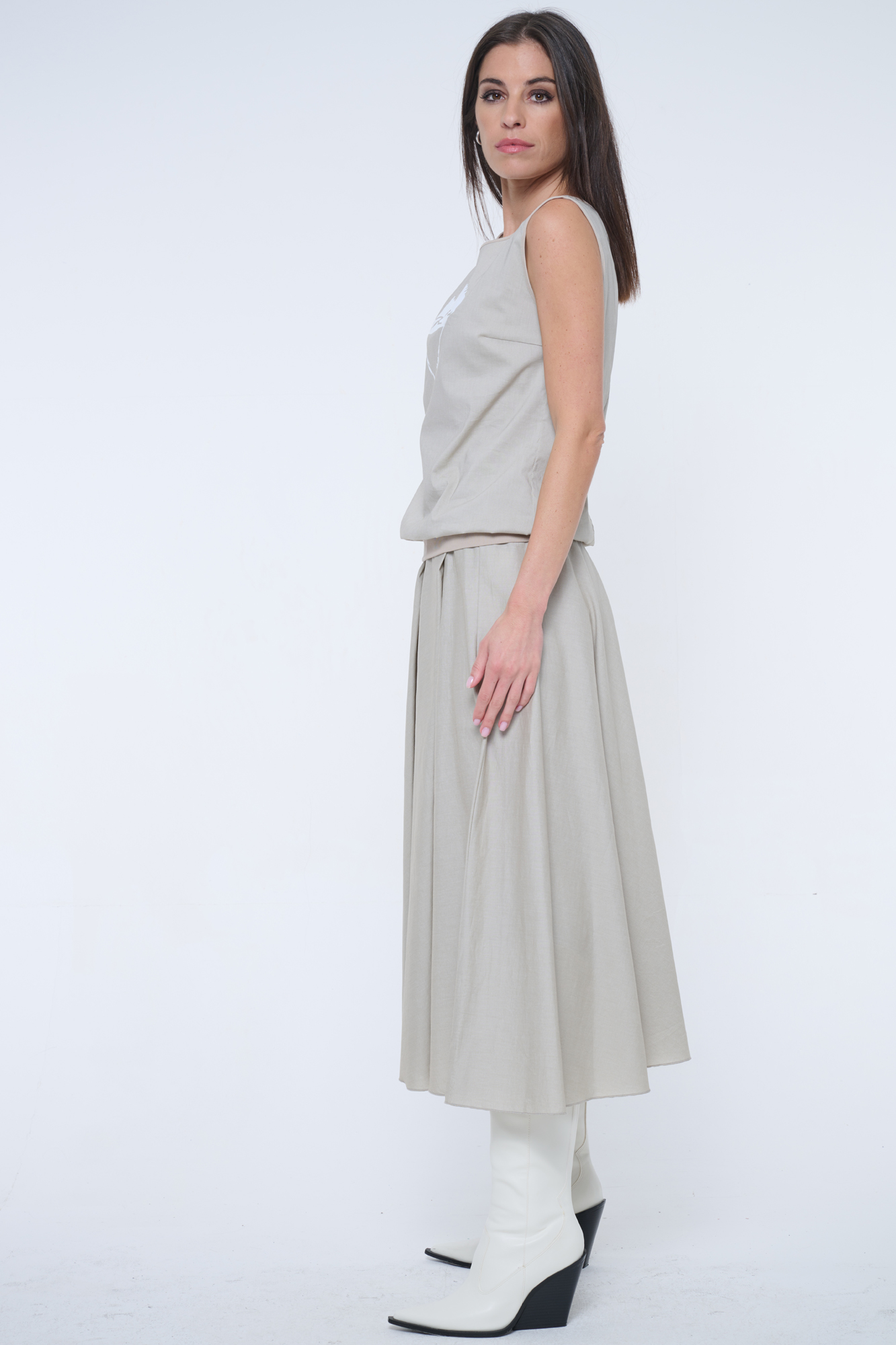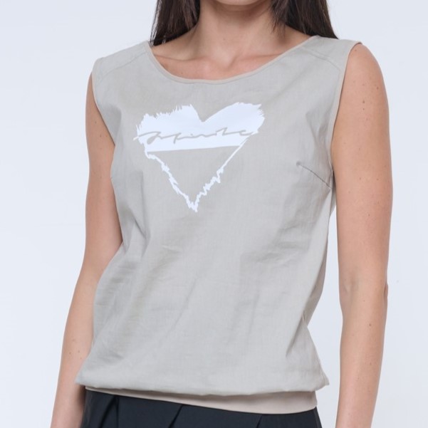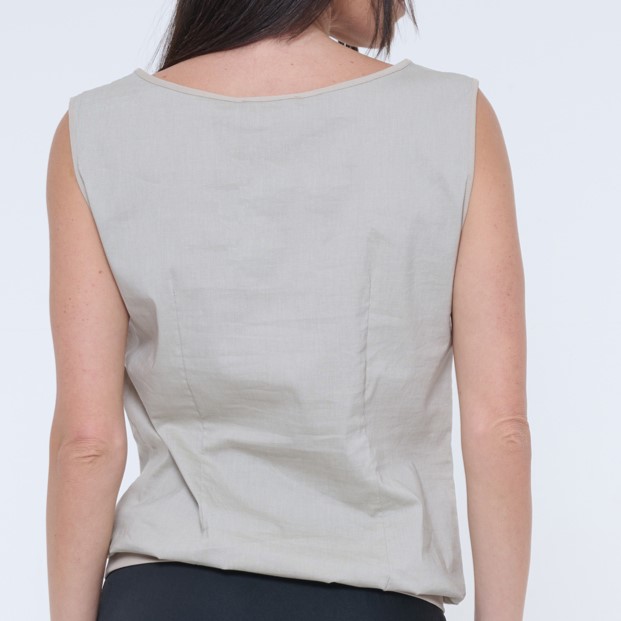 Tunika bez rukávu s podkasem. V pase patent, na předním díle tisk.