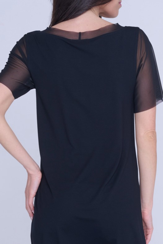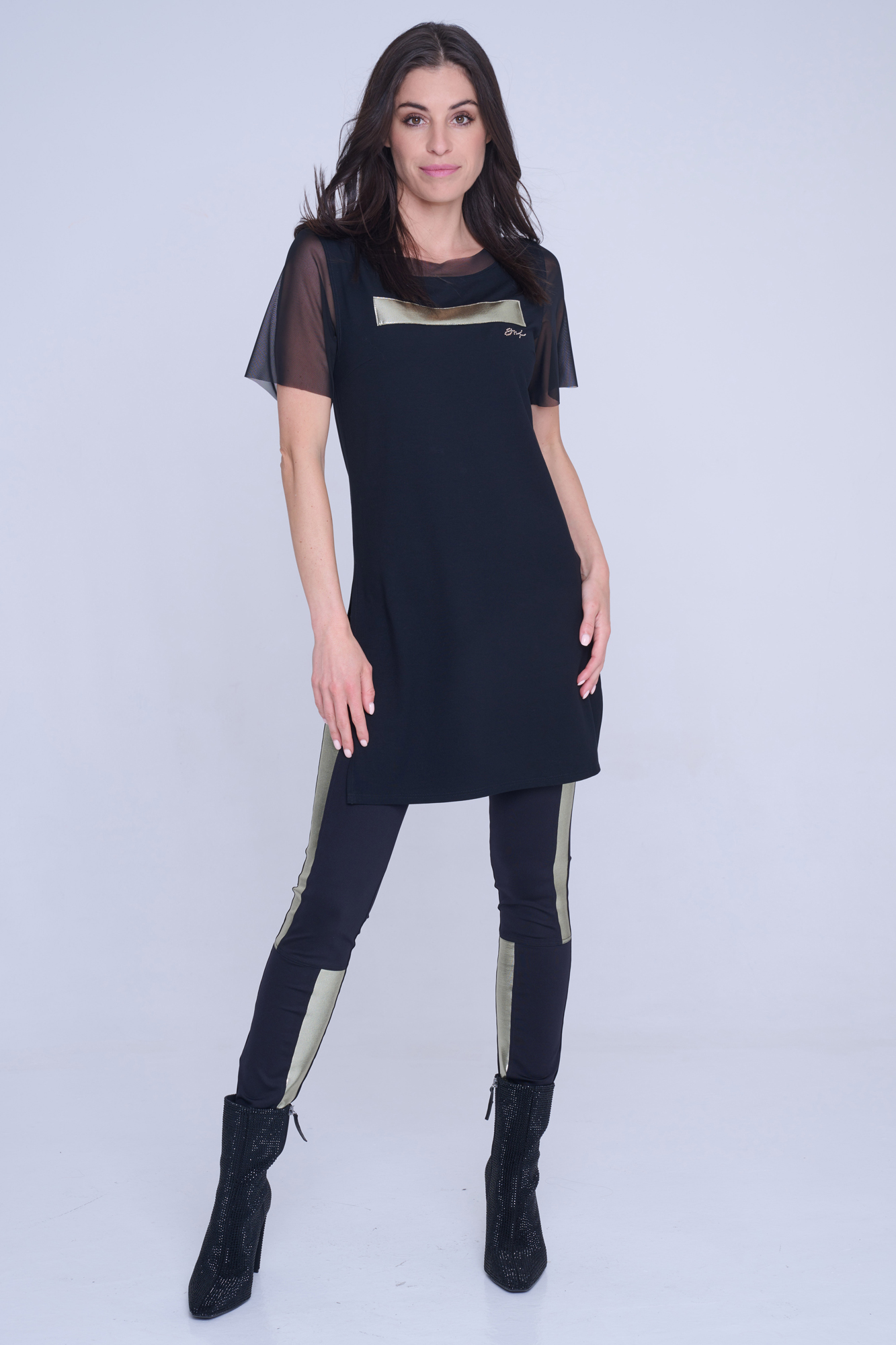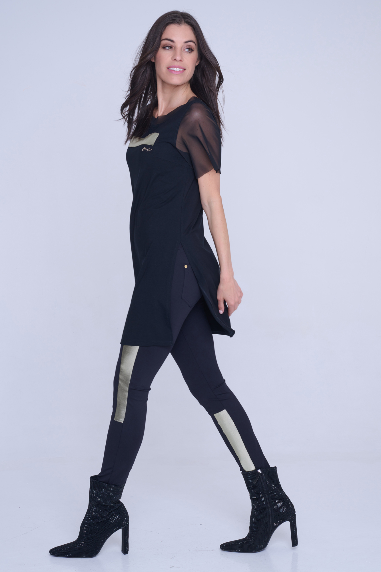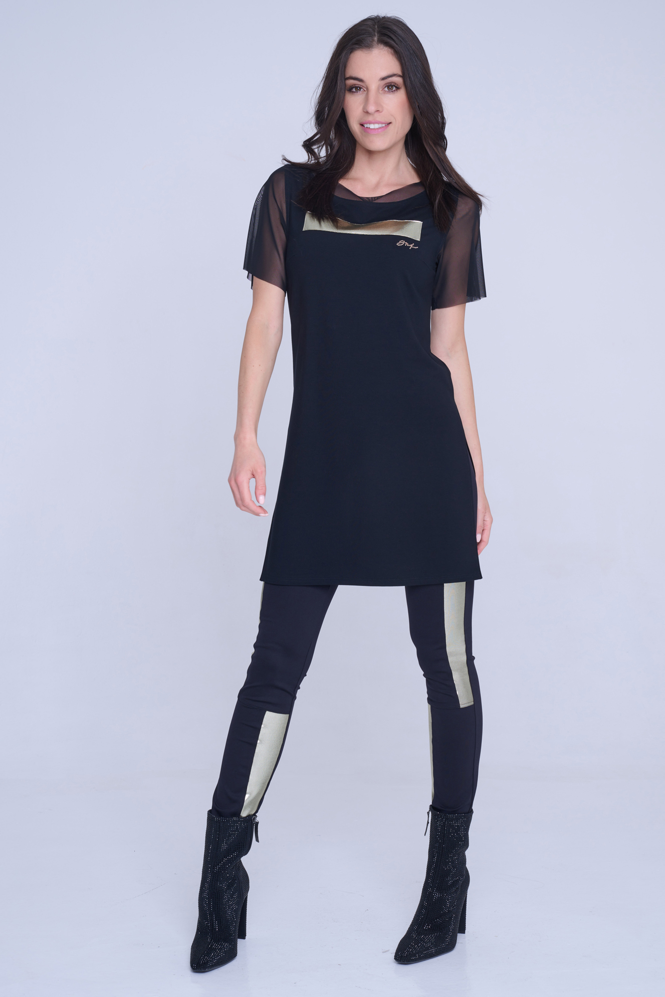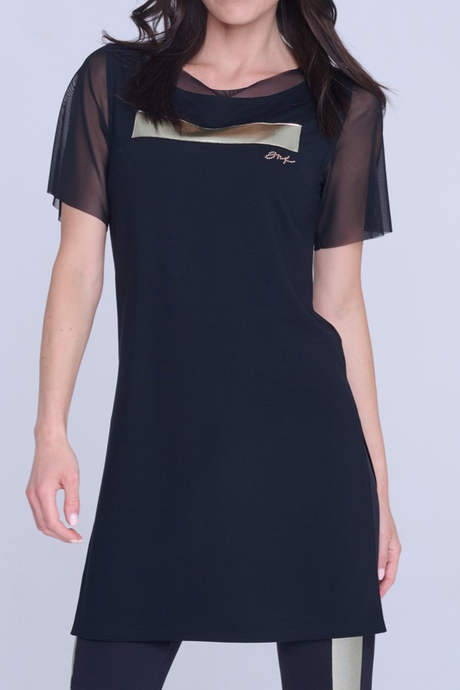 Dlouhý top Infinite se zlatou aplikací na předním díle. Malé zlaté krystalové logo INF.