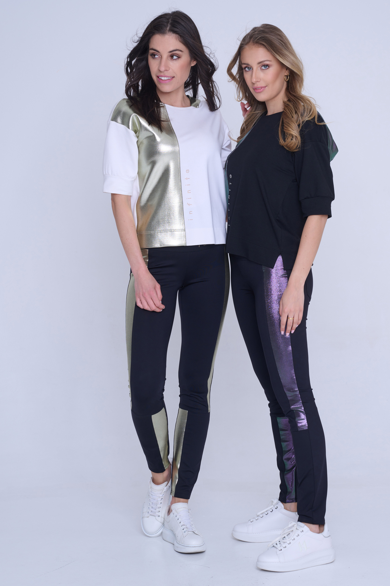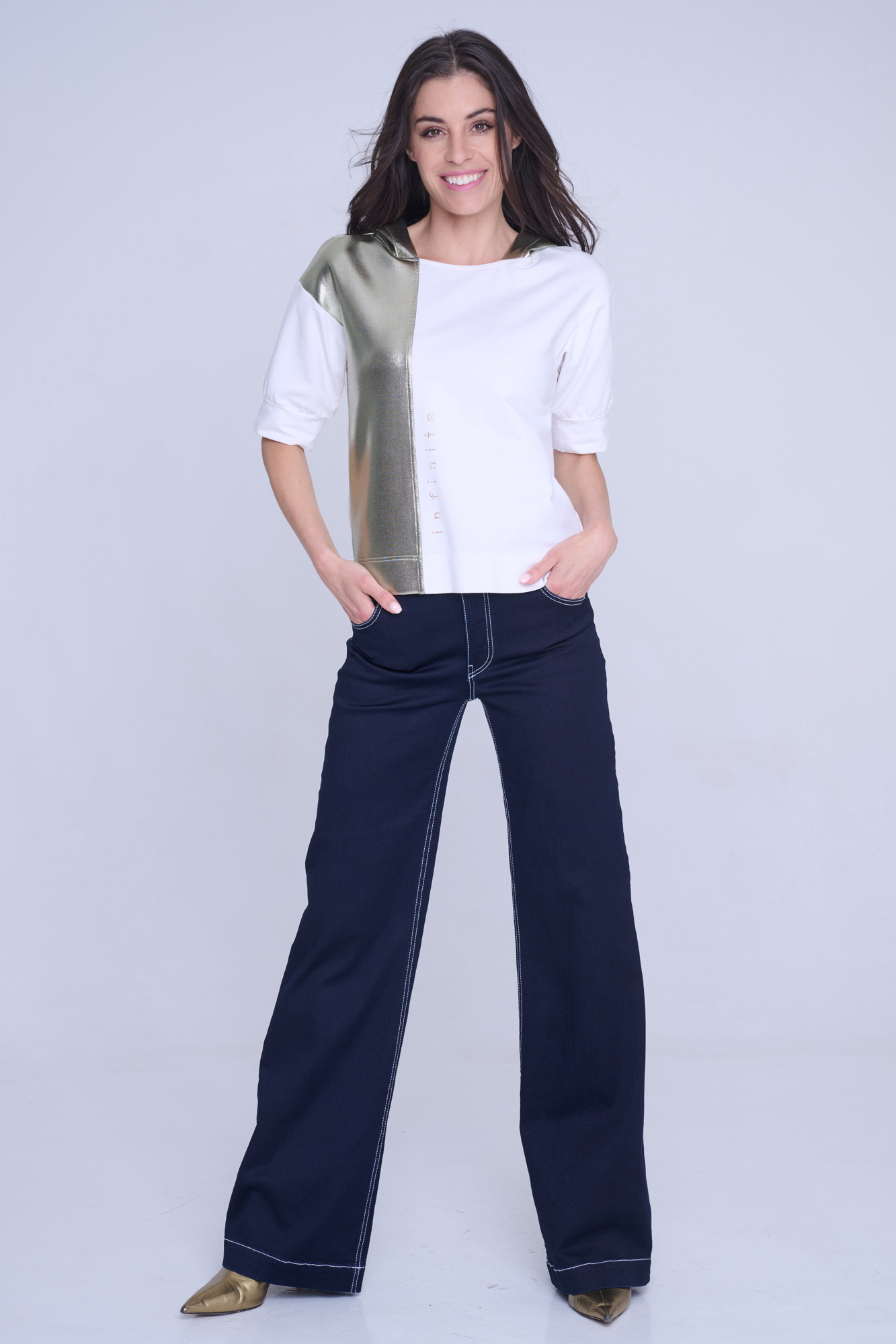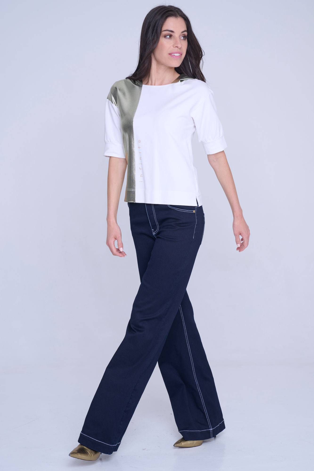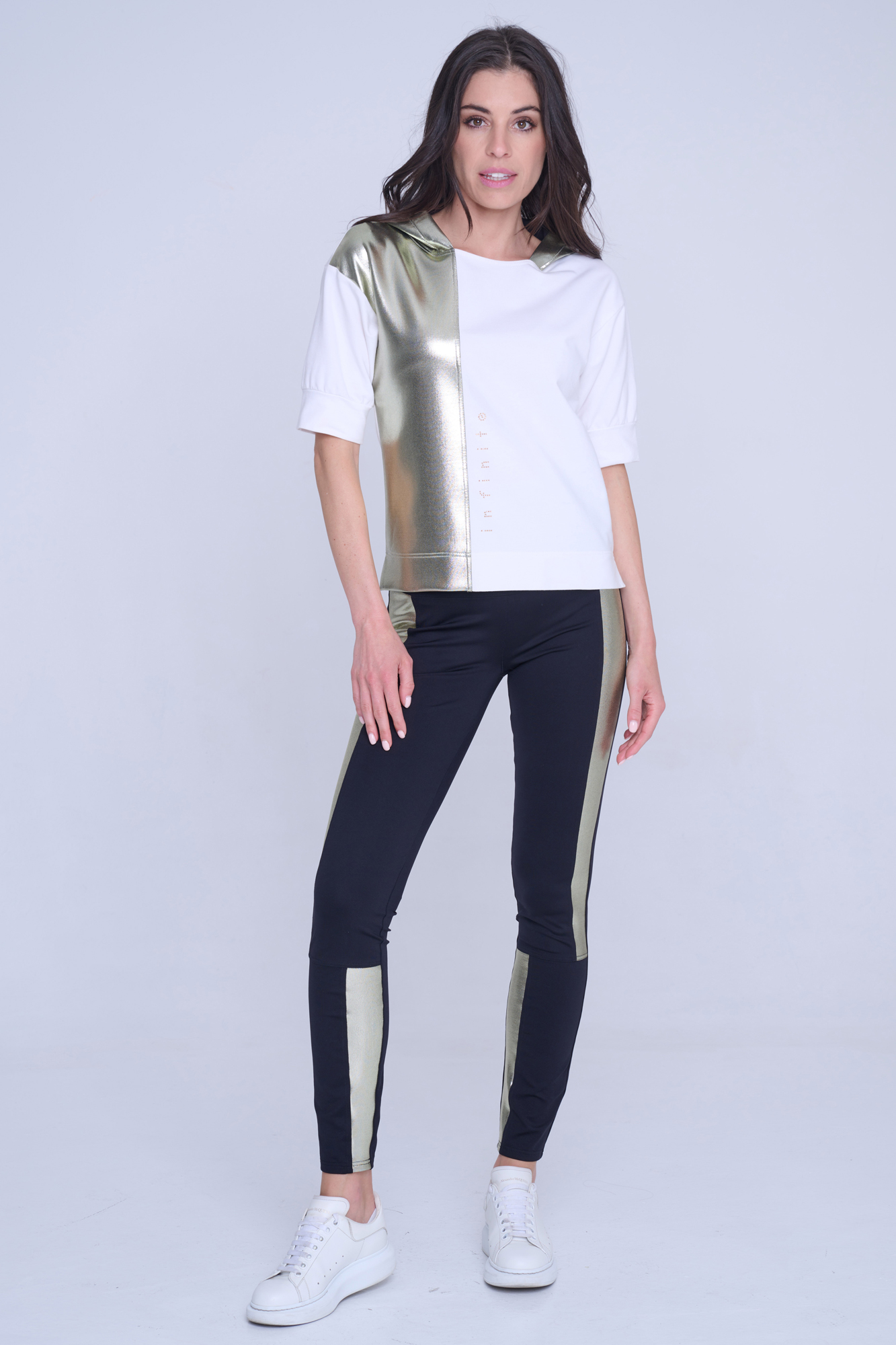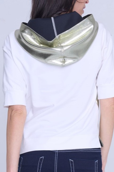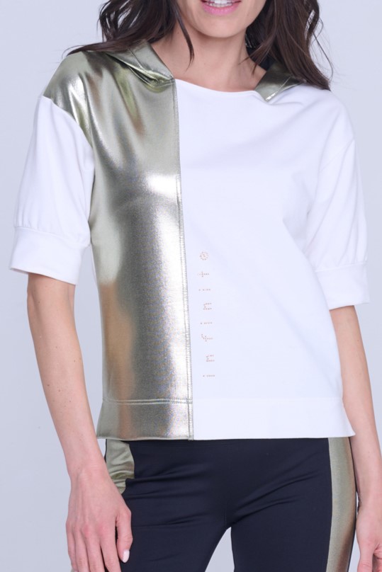 Mikina Infinite s krátkým rukávem. V kombinaci s efektním zlatým materiálem. Na předním díle zlaté krystalové logo INF.