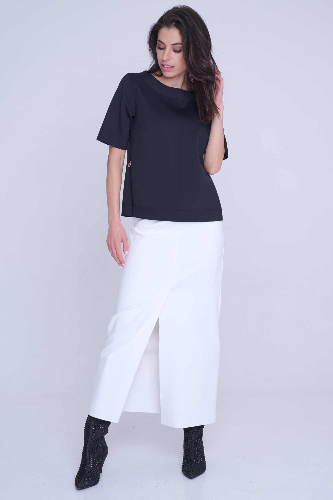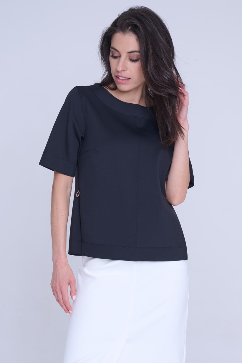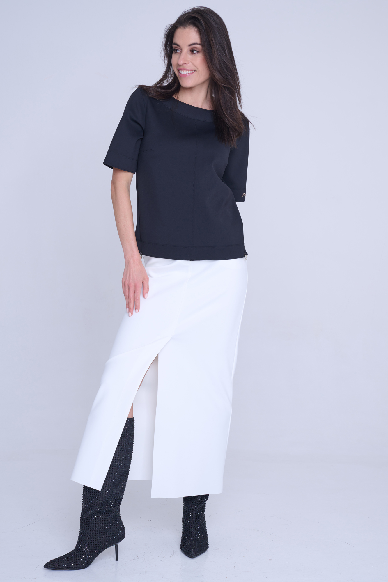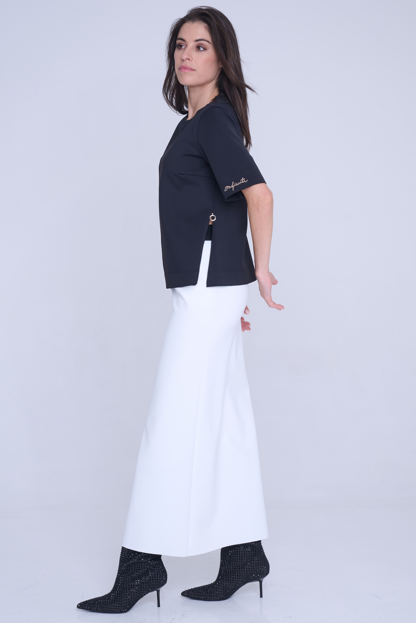 Tunika rovného kratšího střihu. Na rukávu nápis Infinite ze zlatých krystalů Preciosa. Na bocích efektní zdrhovadla s kruhovými koncovkami.