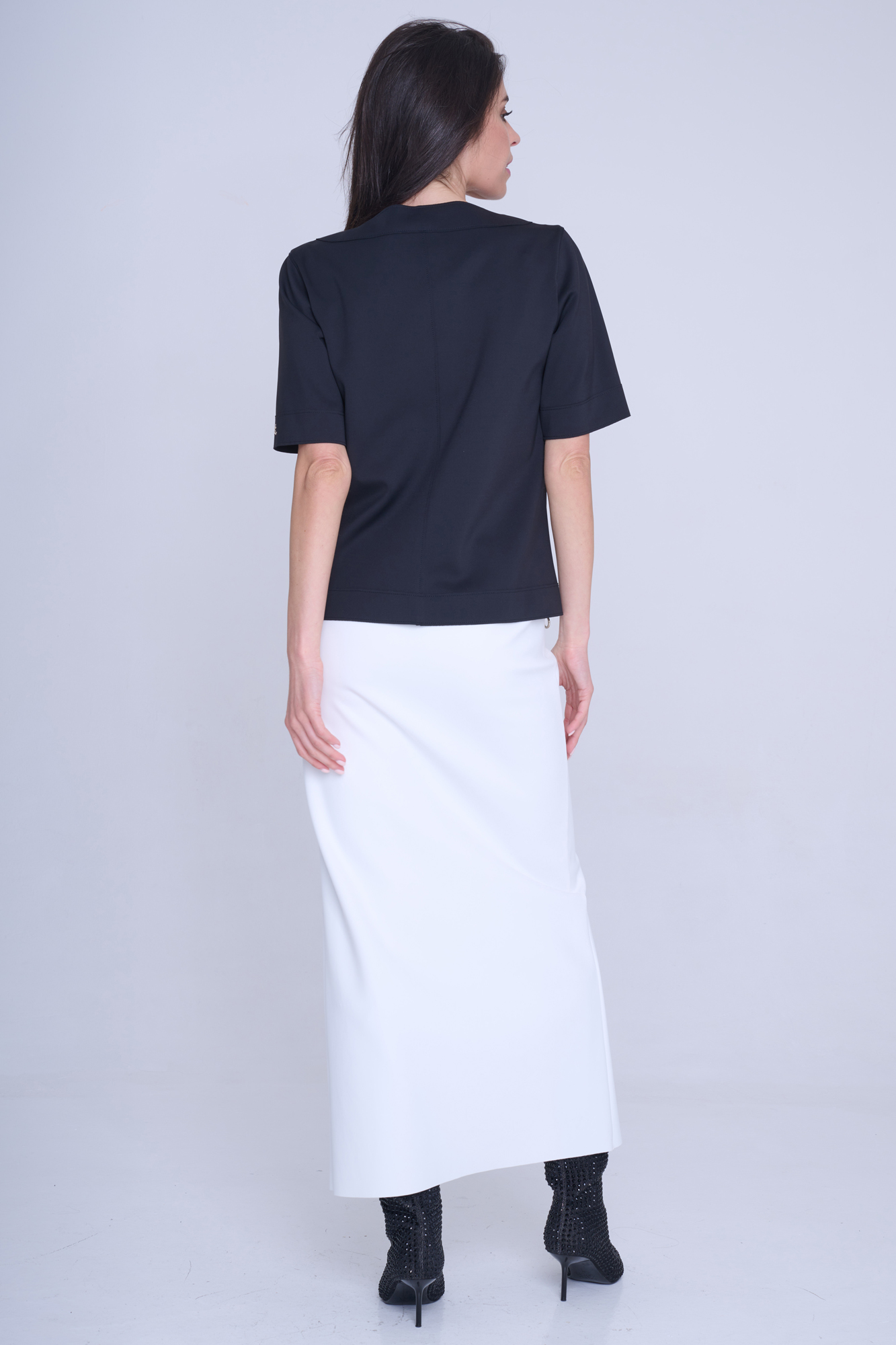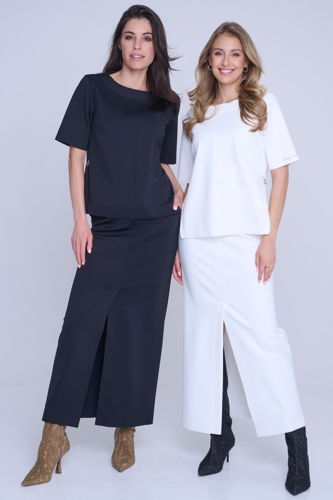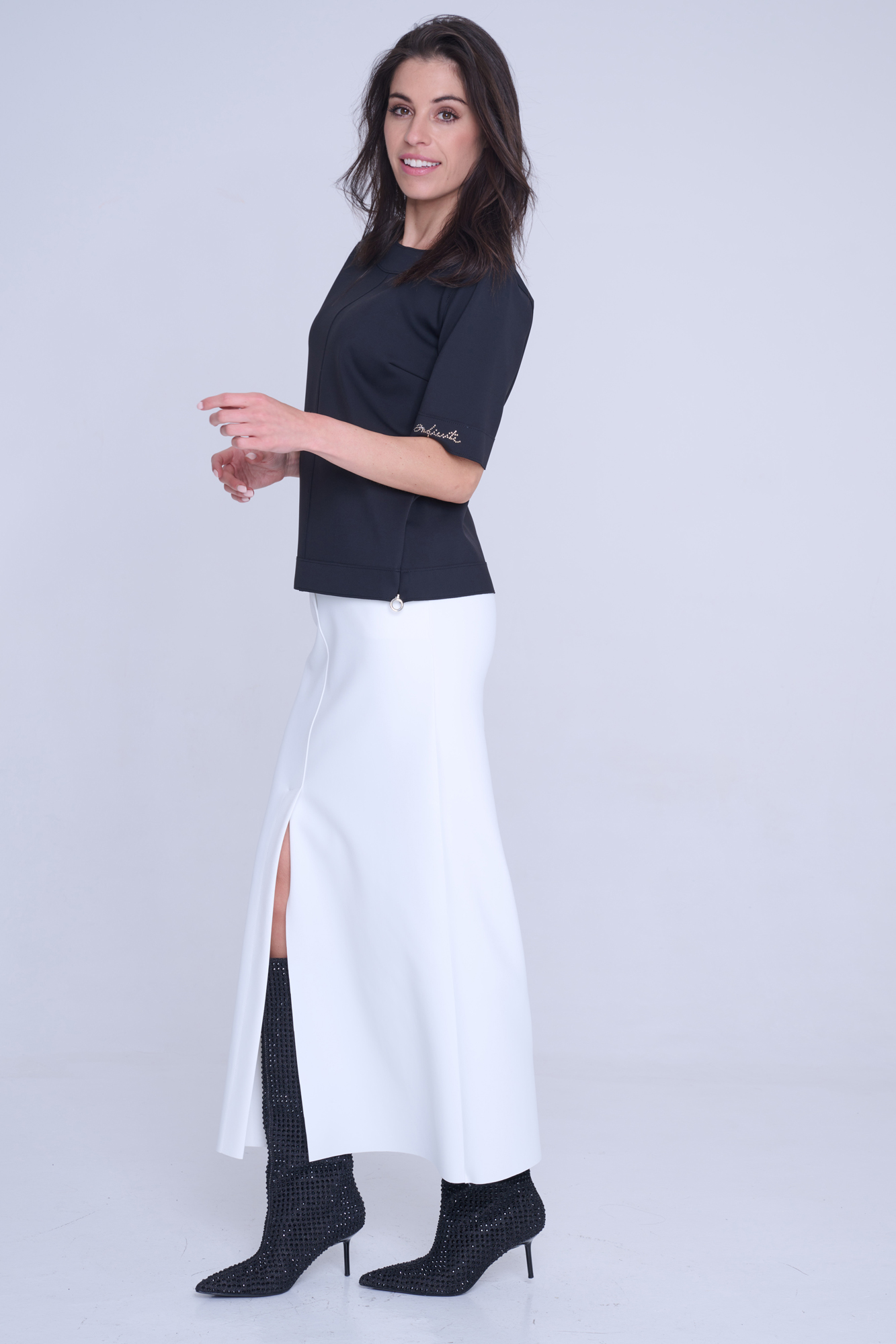 Tunika rovného kratšího střihu. Na rukávu nápis Infinite ze zlatých krystalů Preciosa. Na bocích efektní zdrhovadla s kruhovými koncovkami.