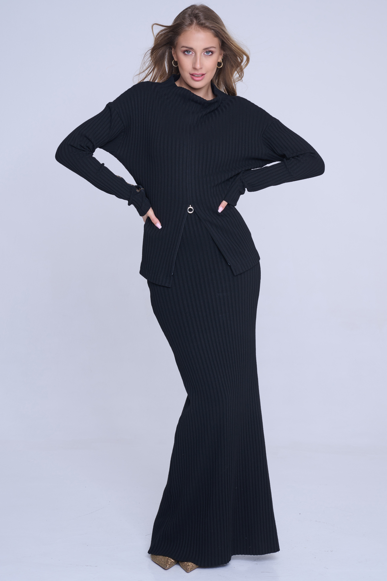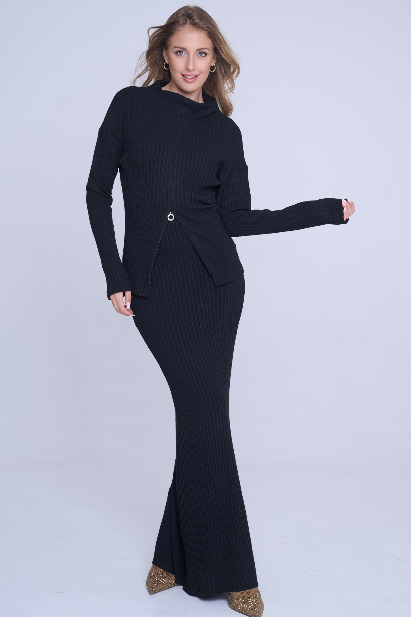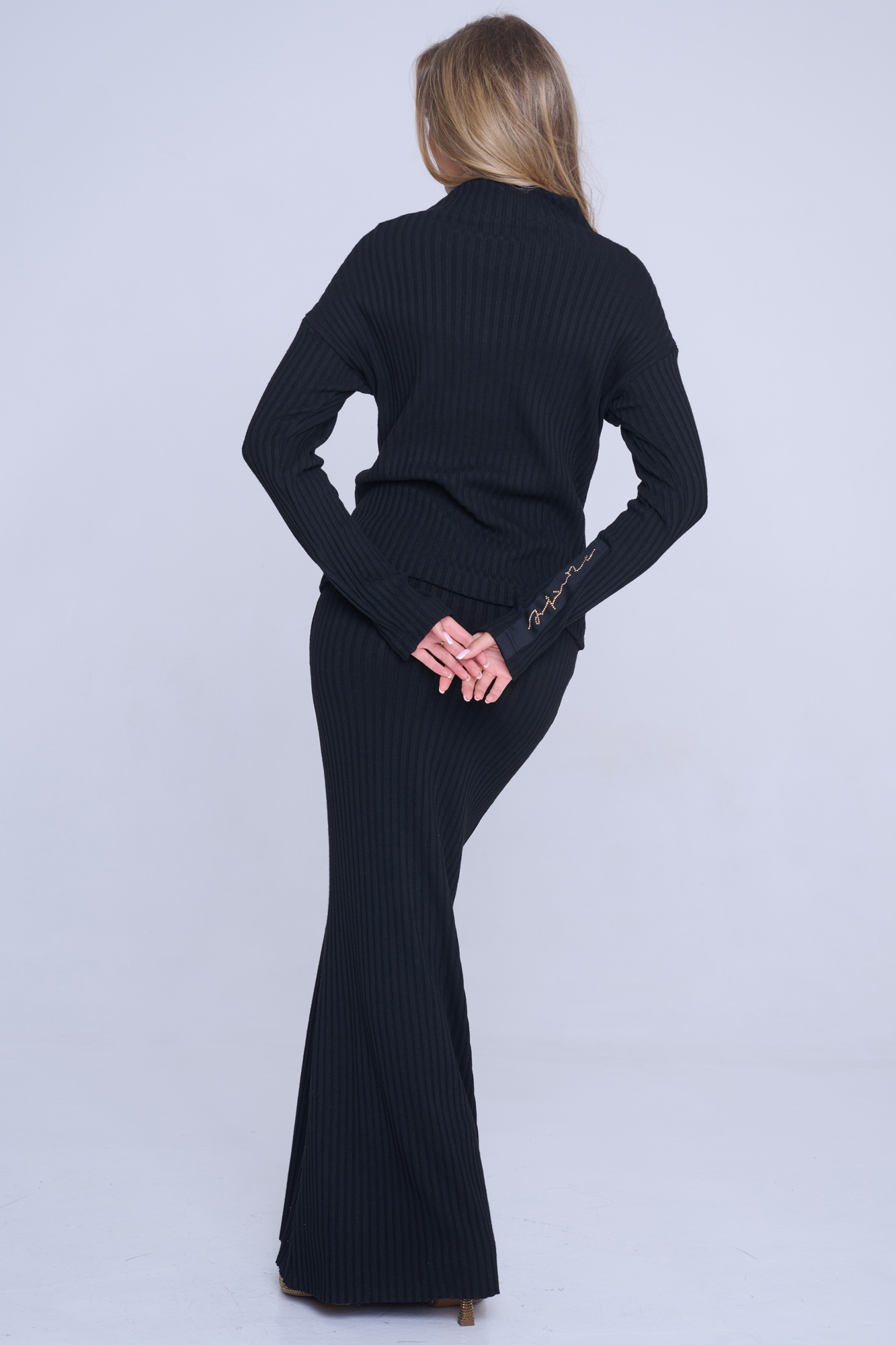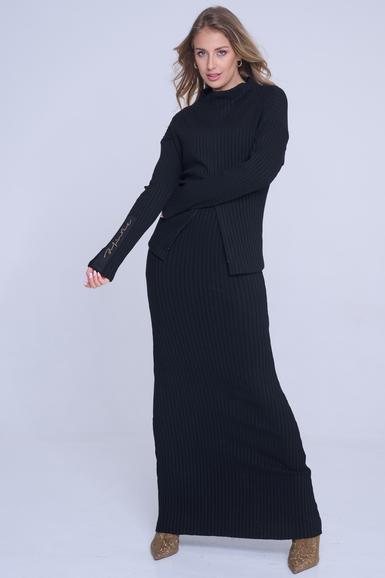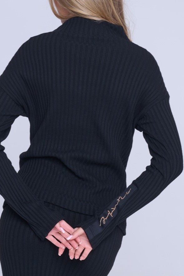 Svetřík Infinite z příjemného materiálu. Černá stuha na rukávu s nápisem Infinite ze zlatých krystalů Preciosa. Efektní otvíratelný zip s atraktivní koncovkou umístěný od pasu dolů.