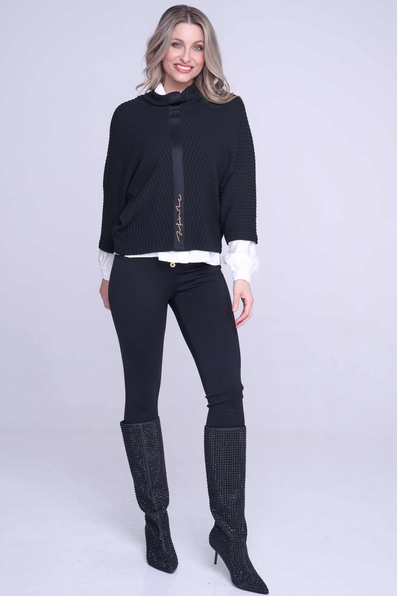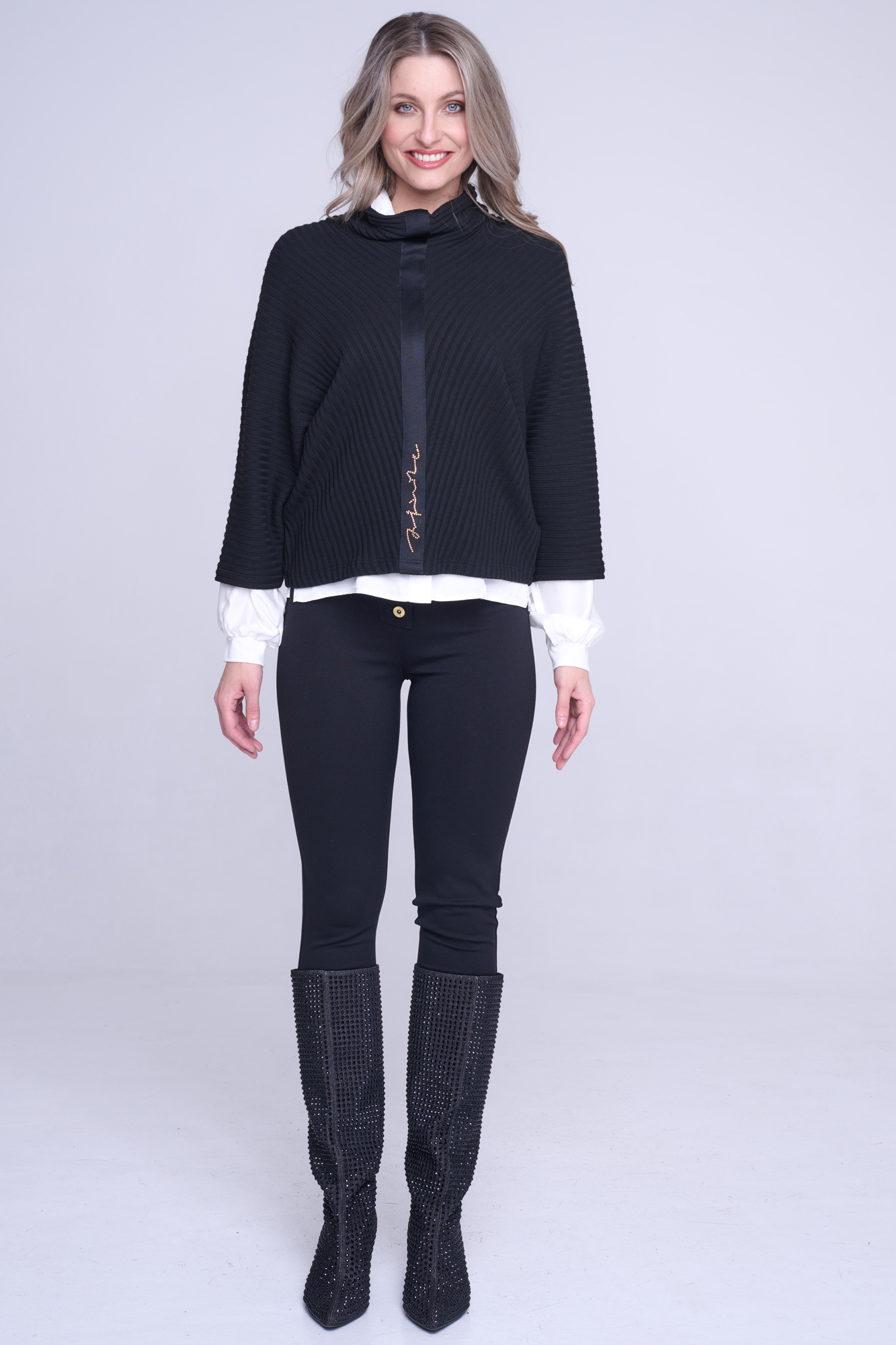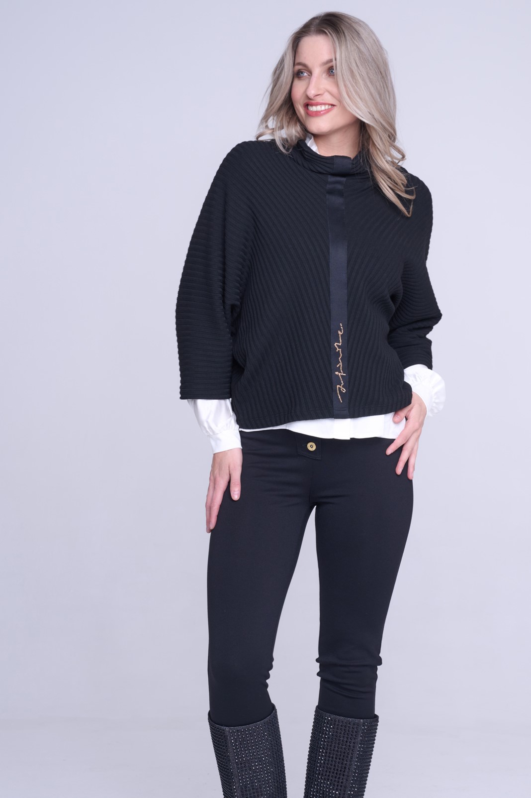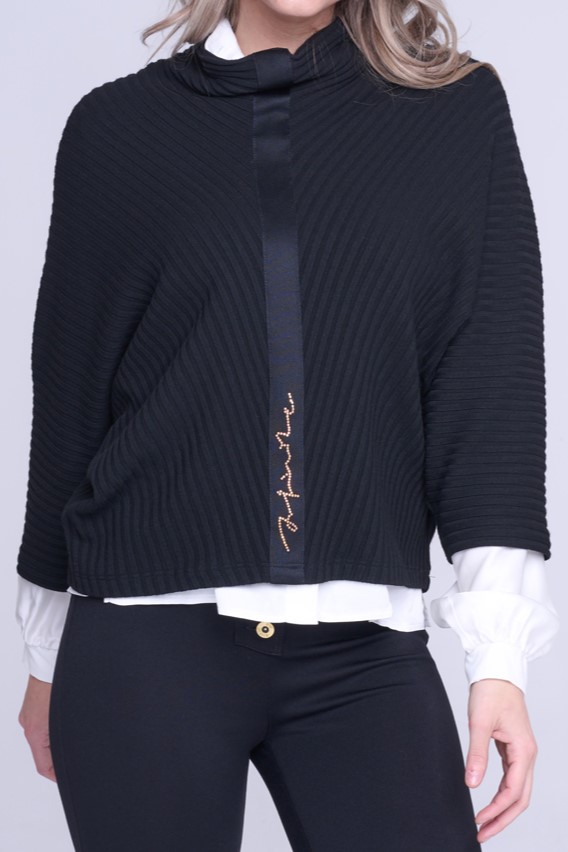 "Pončo" svetr. Na předním díle stuha s nápisem Infinite ze zlatých krystalů Preciosa.