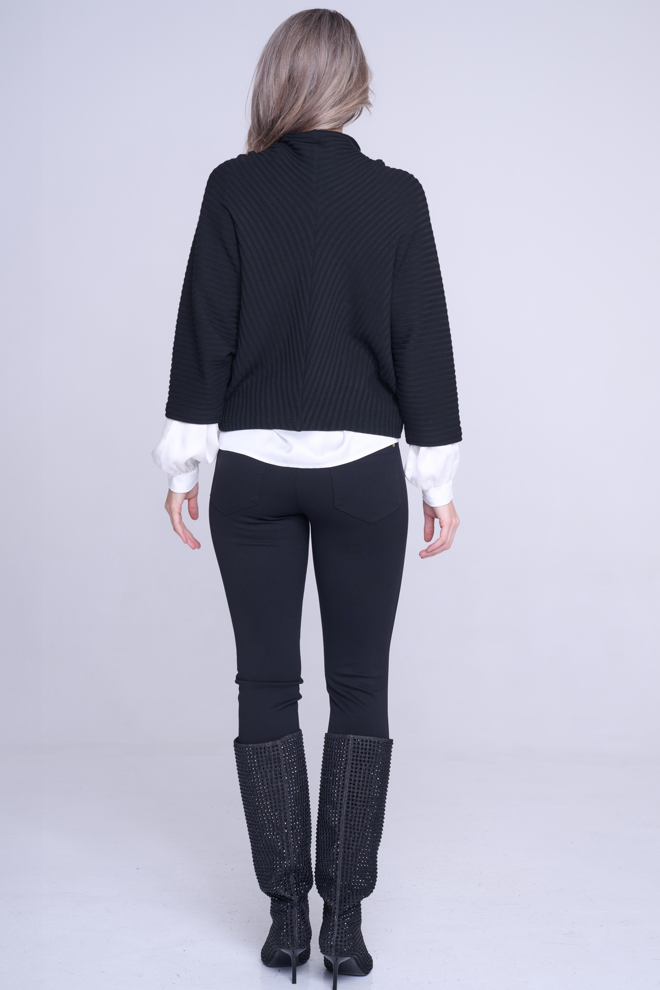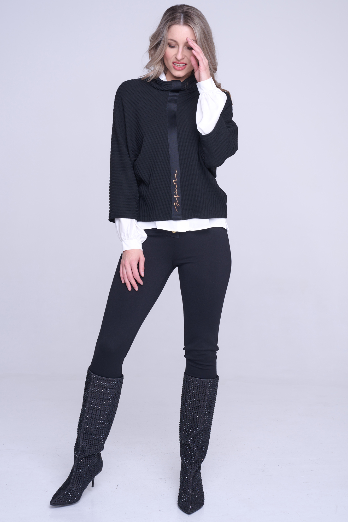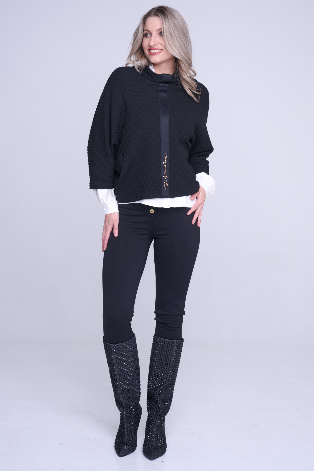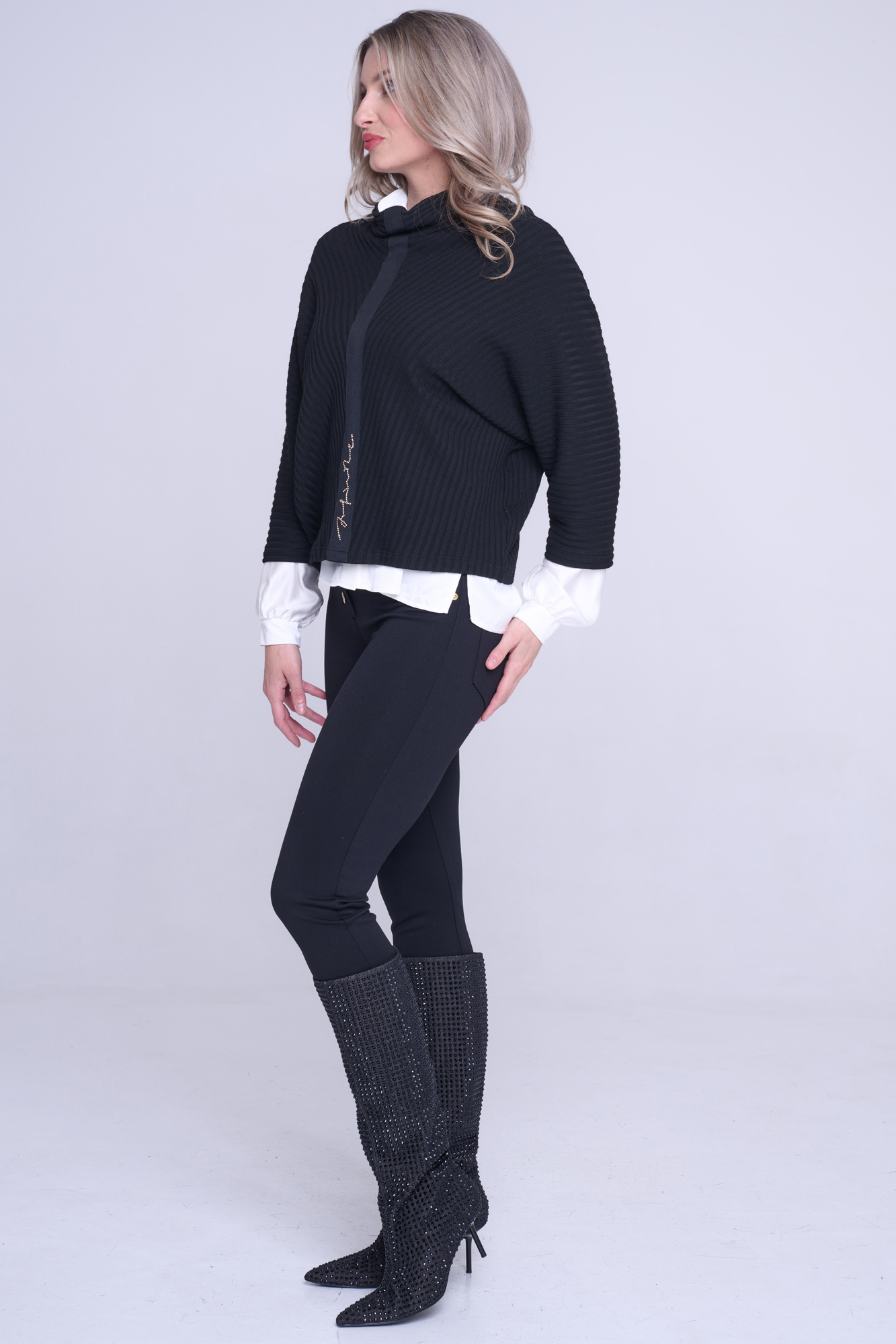 "Pončo" svetr. Na předním díle stuha s nápisem Infinite ze zlatých krystalů Preciosa.