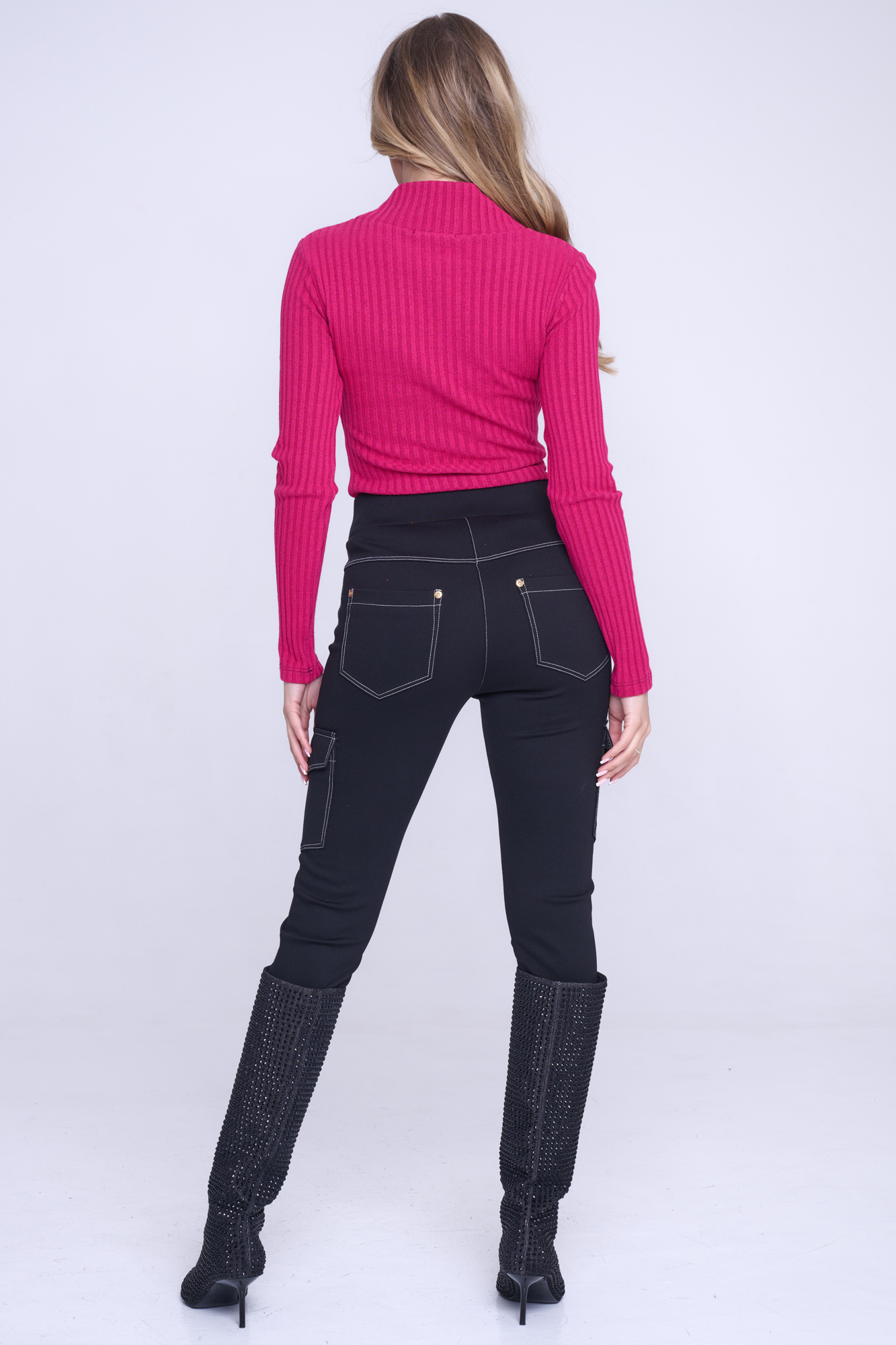 Úpletový svetřík se stojákem. Na stojáčku je logo Infinite z krystalů Preciosa.