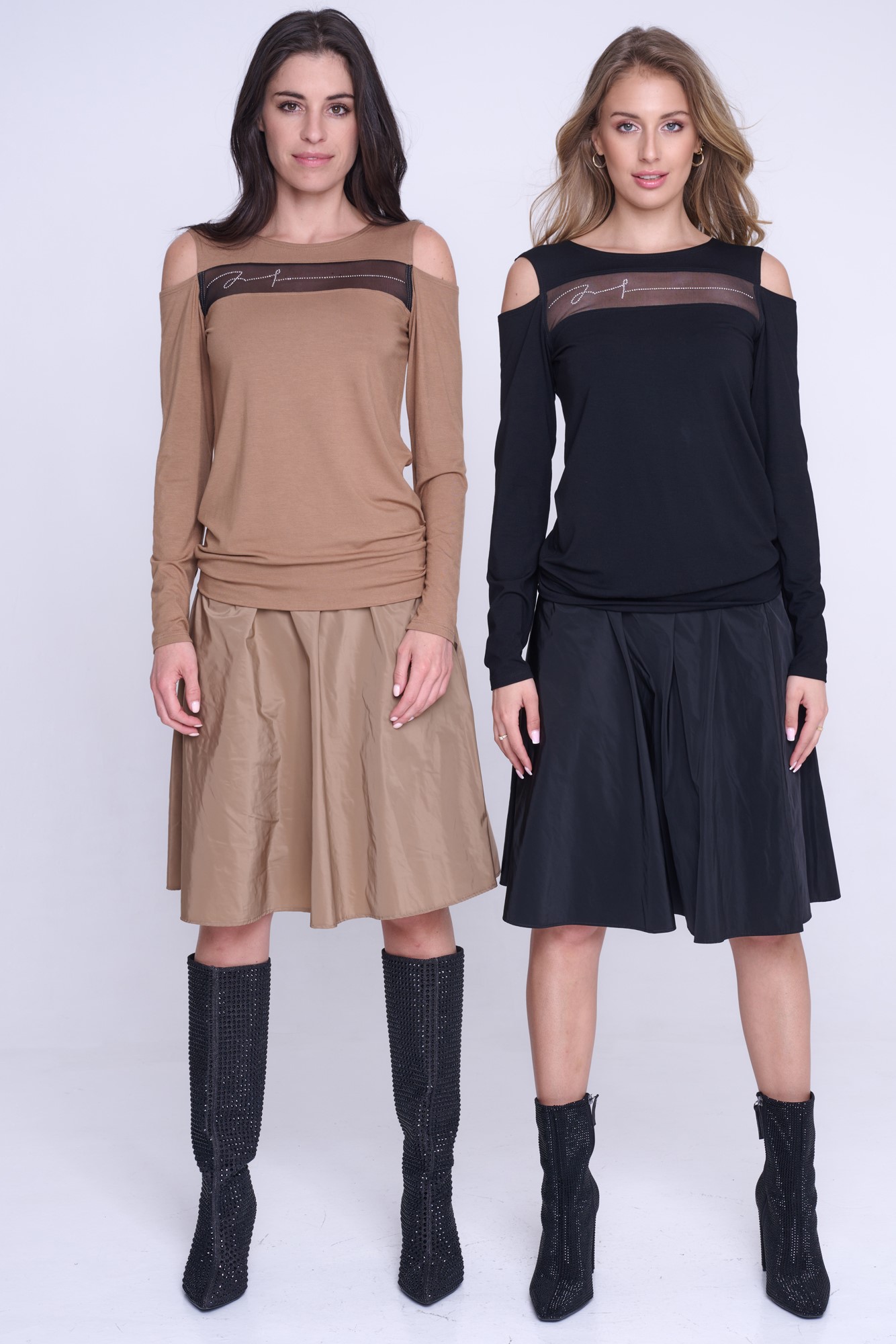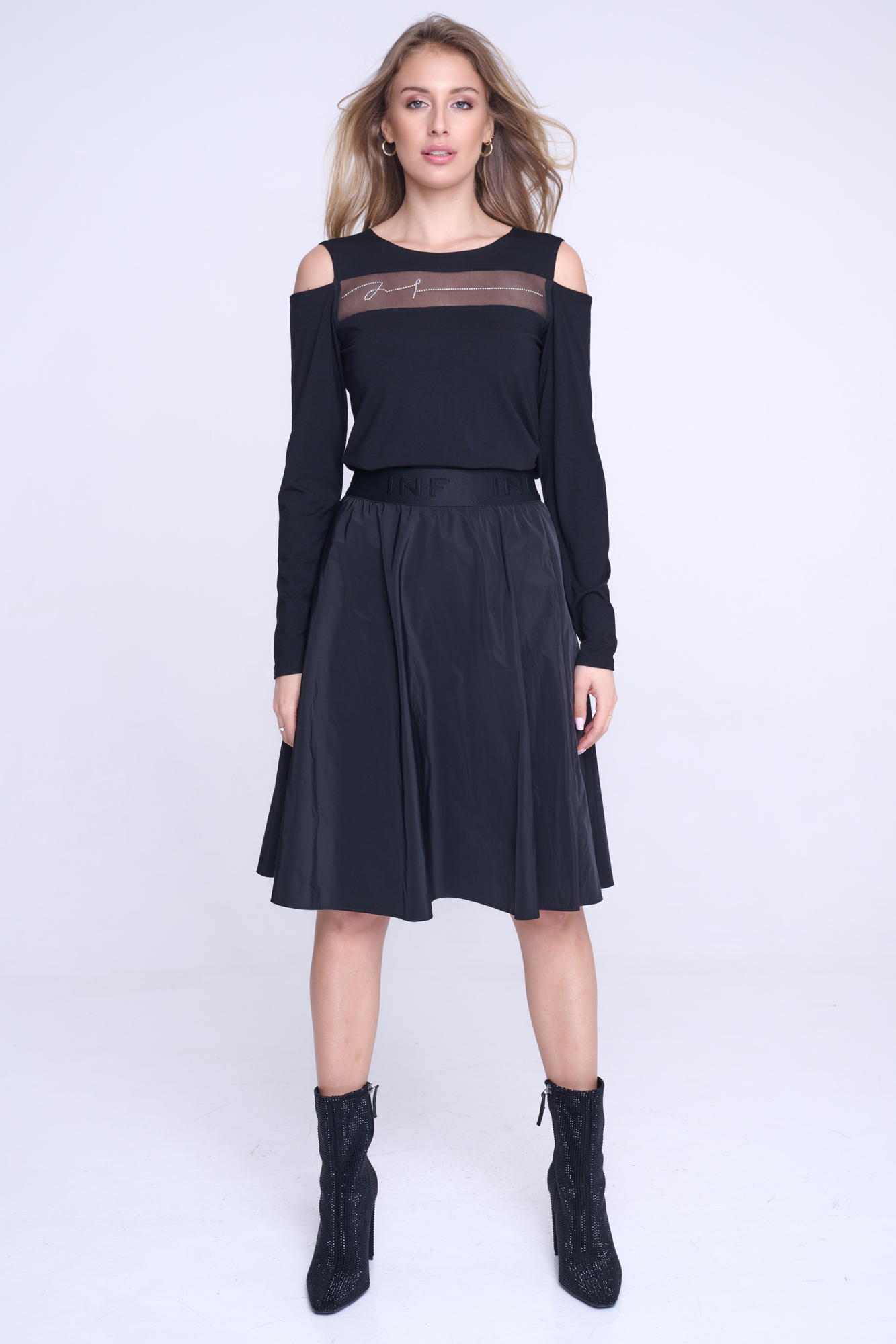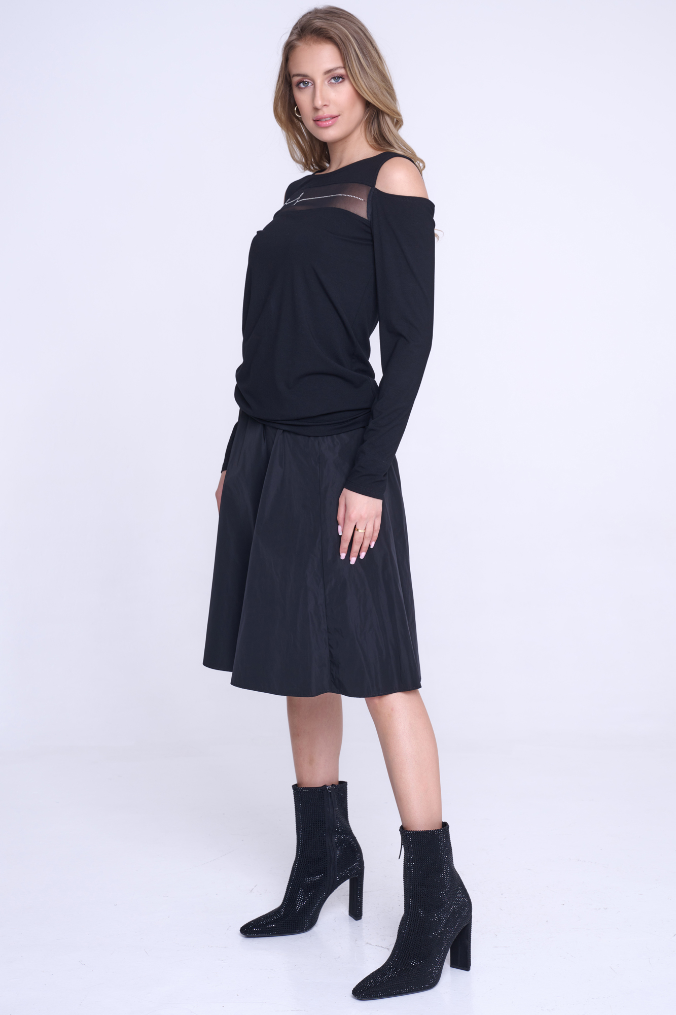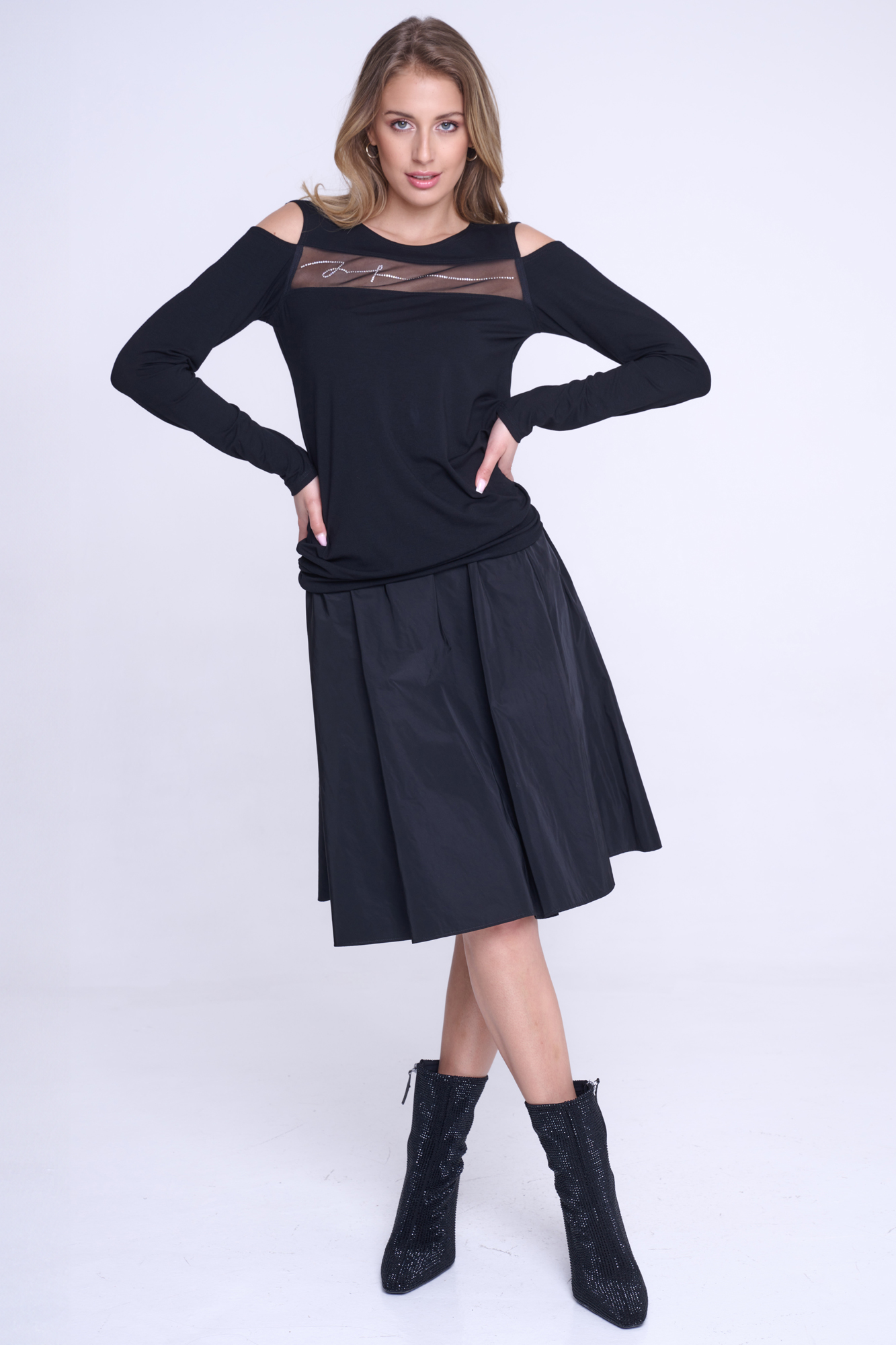 Tunika s podkasem. Na ramenech efektní průstřihy. Předním díl je v kombinaci s efektním tylem, na kterém je motiv Infinite z krystalů značky Preciosa.