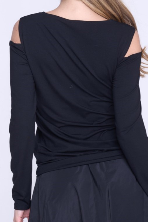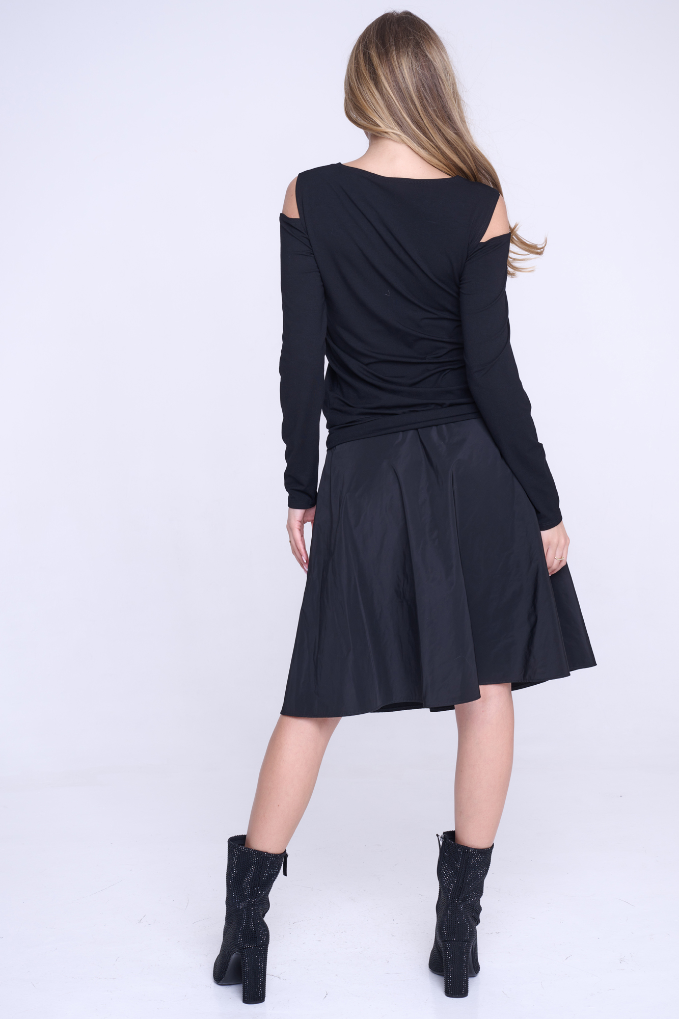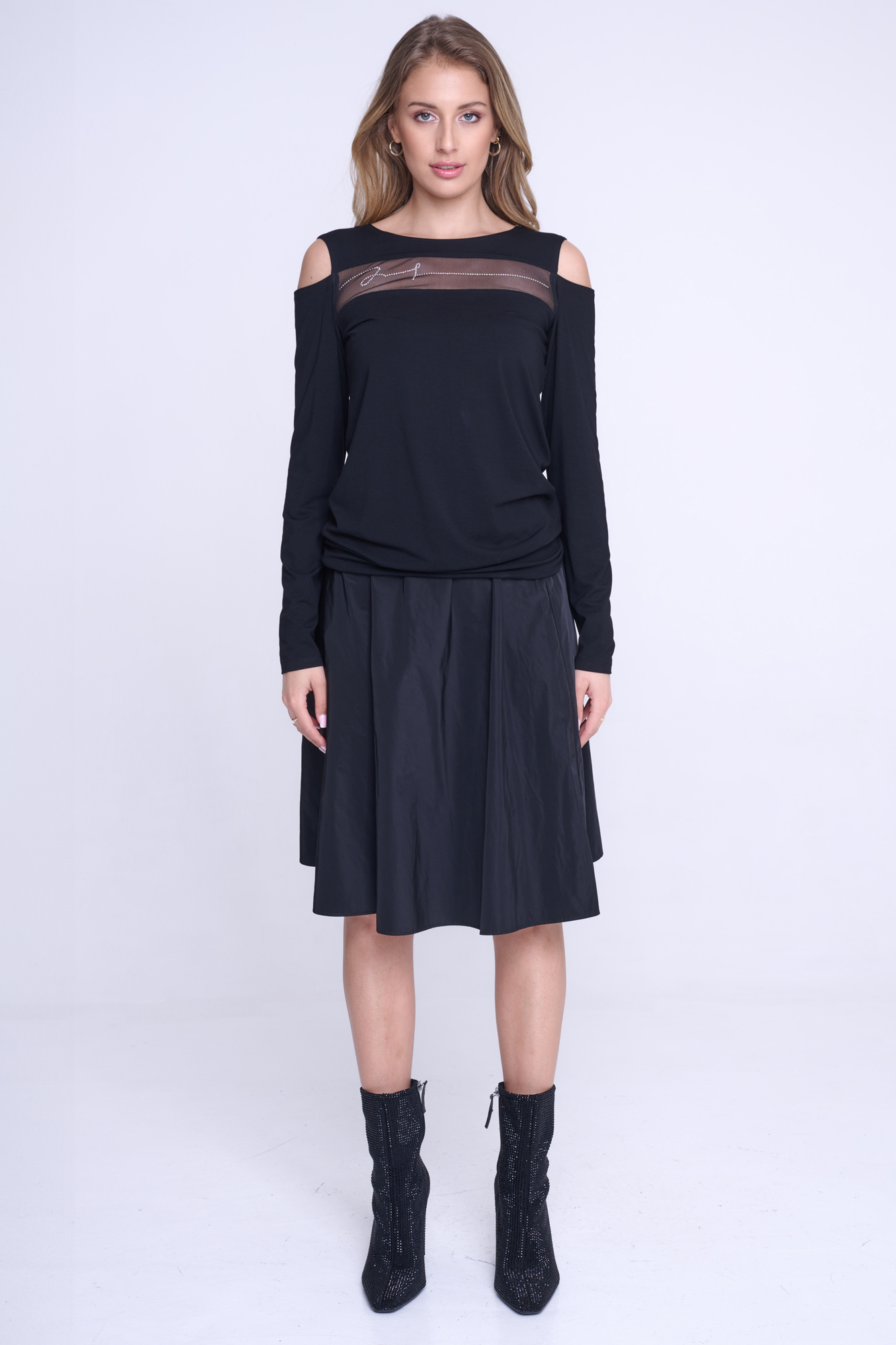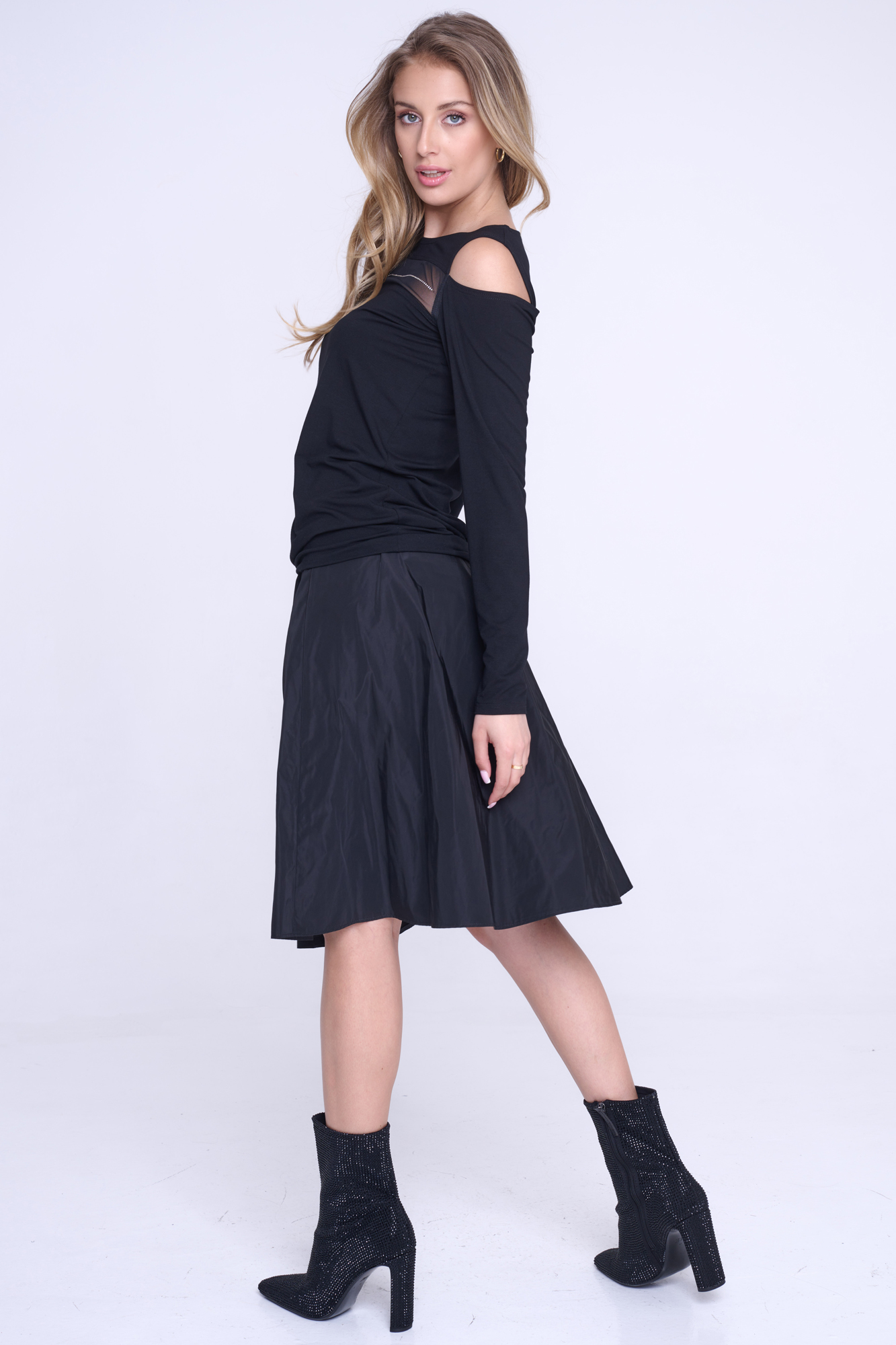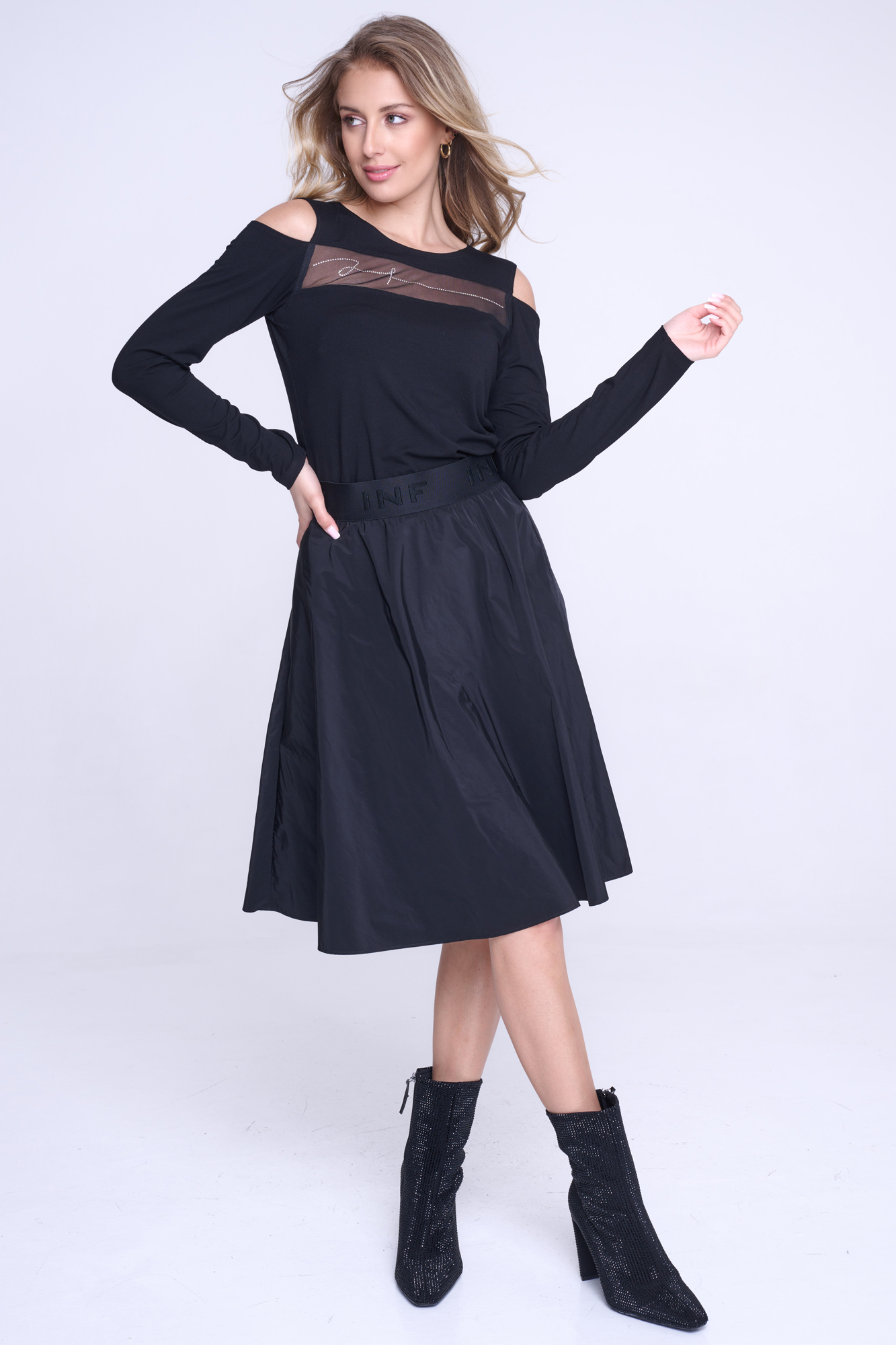 Tunika s podkasem. Na ramenech efektní průstřihy. Předním díl je v kombinaci s efektním tylem, na kterém je motiv Infinite z krystalů značky Preciosa.