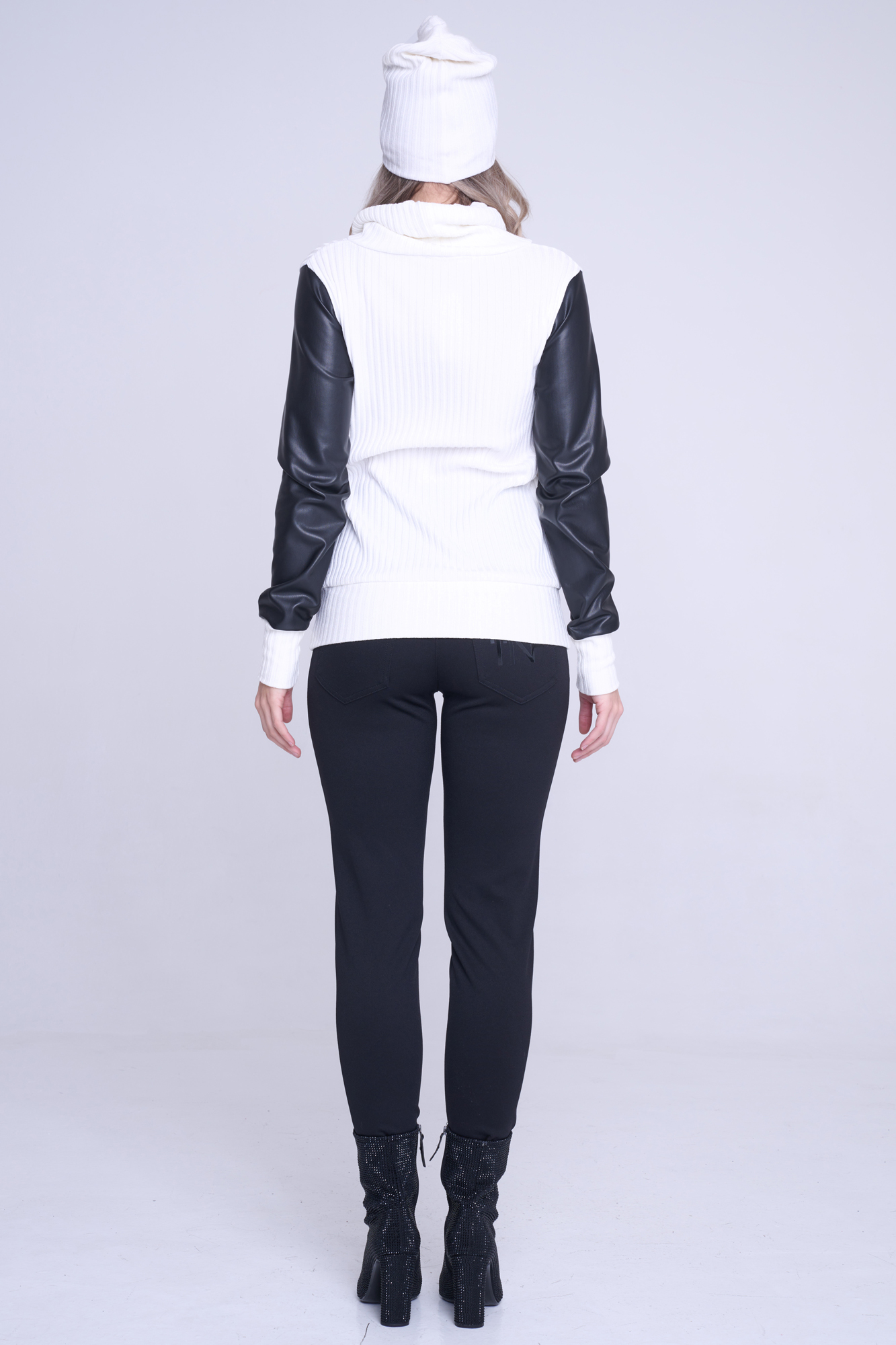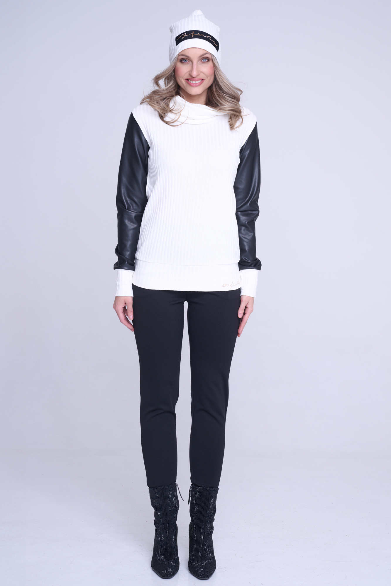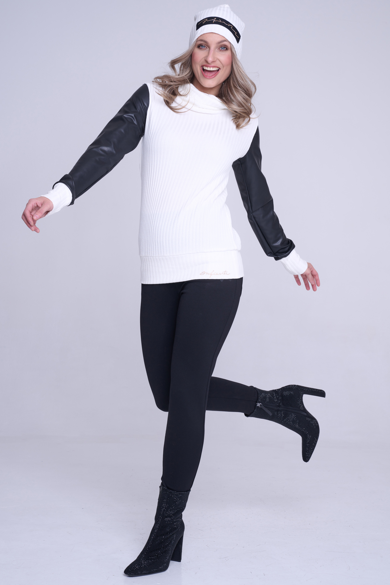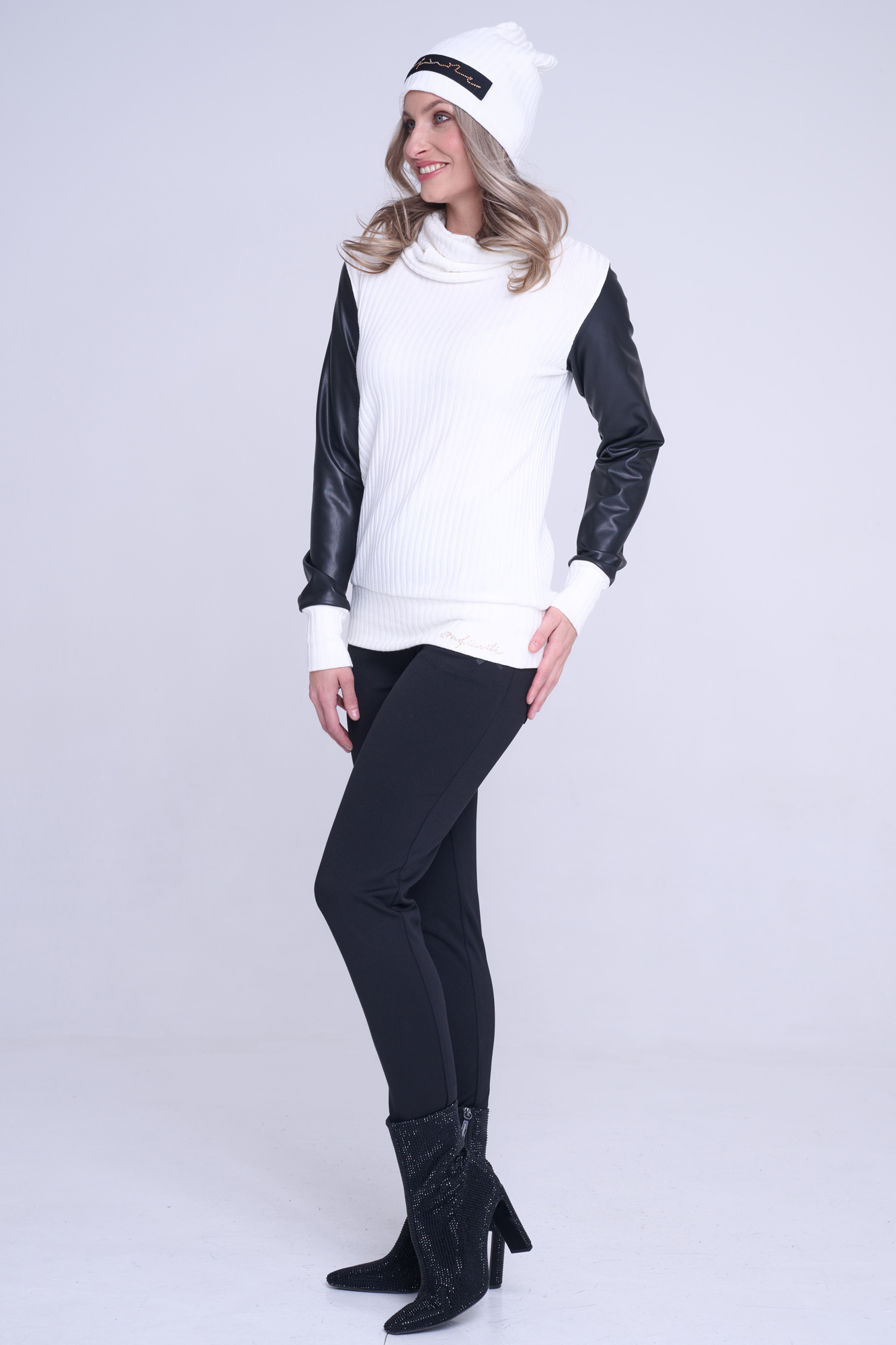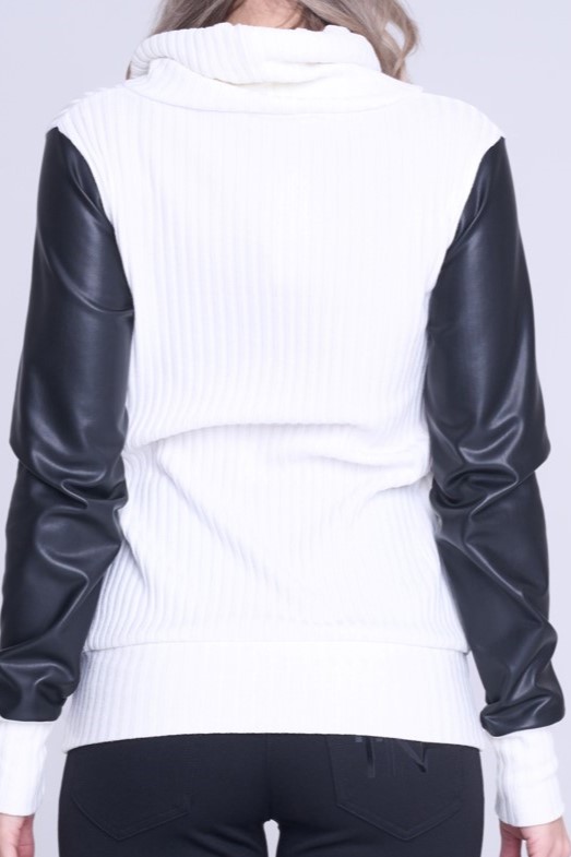 Smetanovo-černý rolák s rukávy ze strečové ekokůže stažený do patentu. Na předním díle v pase nápis Infinite ze zlatých krystalů Preciosa.