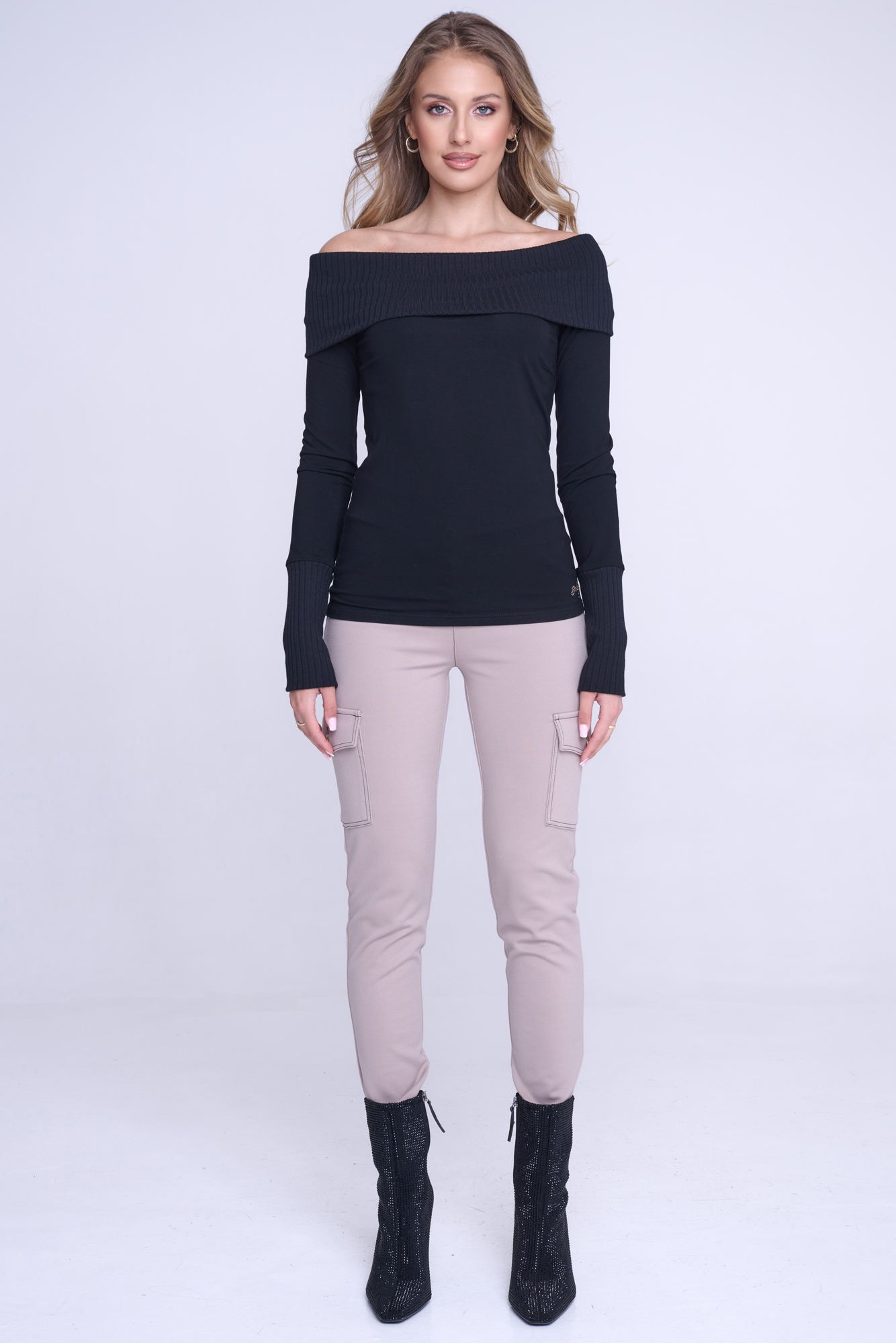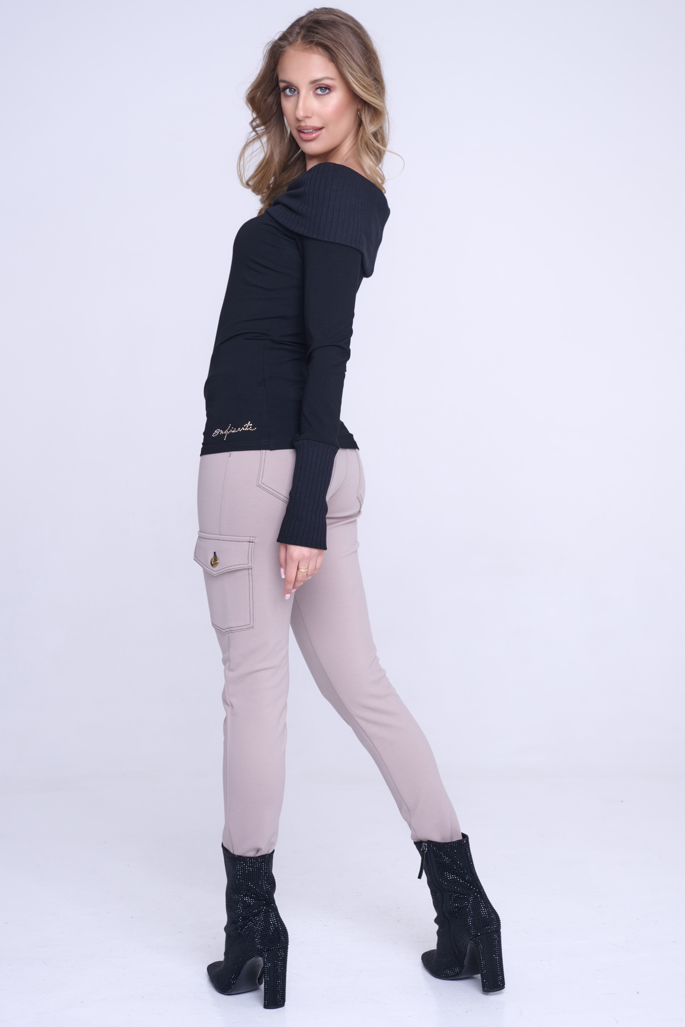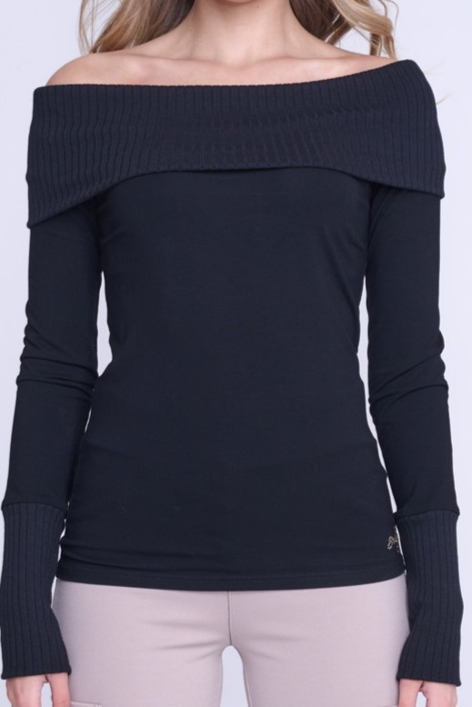 Triko Infinite s límcem "nejenom" z ramen. Límec a manžety z žebrového úpletu. Na předním díle nápis Infinite ze zlatých krystalů Preciosa.