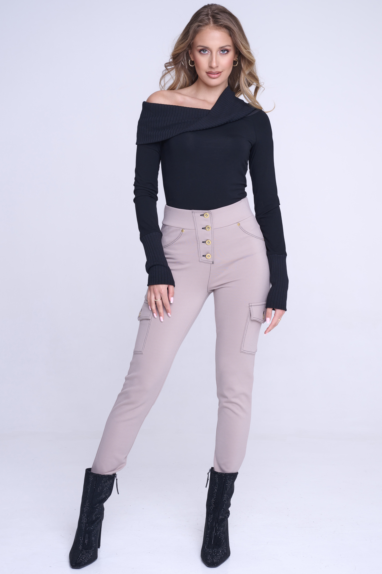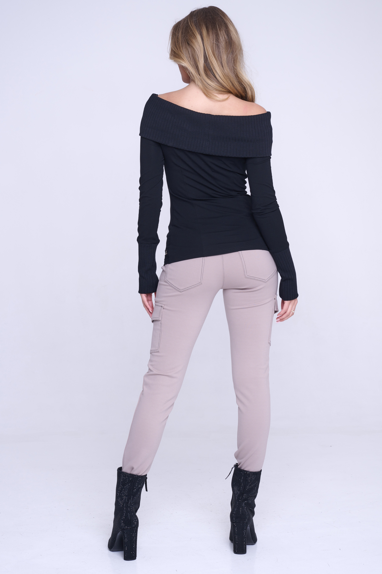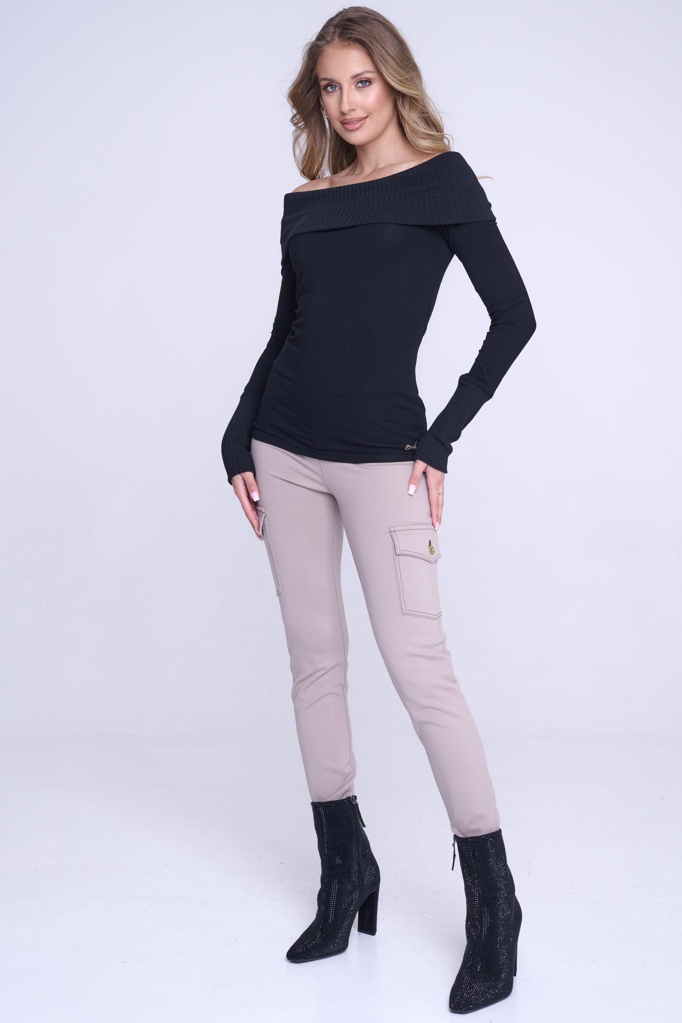 Triko Infinite s límcem "nejenom" z ramen. Límec a manžety z žebrového úpletu. Na předním díle nápis Infinite ze zlatých krystalů Preciosa.